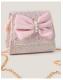 Accessories that WOW. The perfect bag for all the mini fashionistas that love to sparkle. Covered in iridescent glitter, it showcases a pink bow on the front and a pearl-strung top handle to match. Features a magnetic button closure and long chain strap for hands-free styling, too!