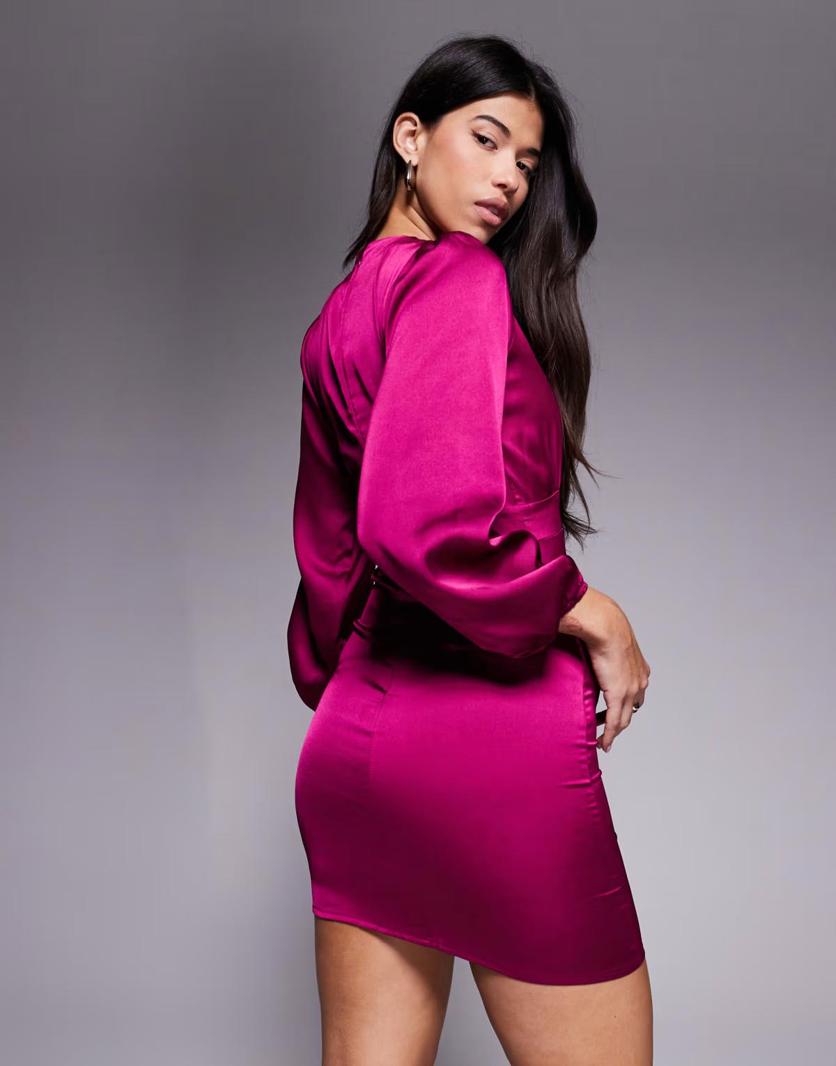Vesper Plunge neck long sleeve satin mini dress in fuchsia