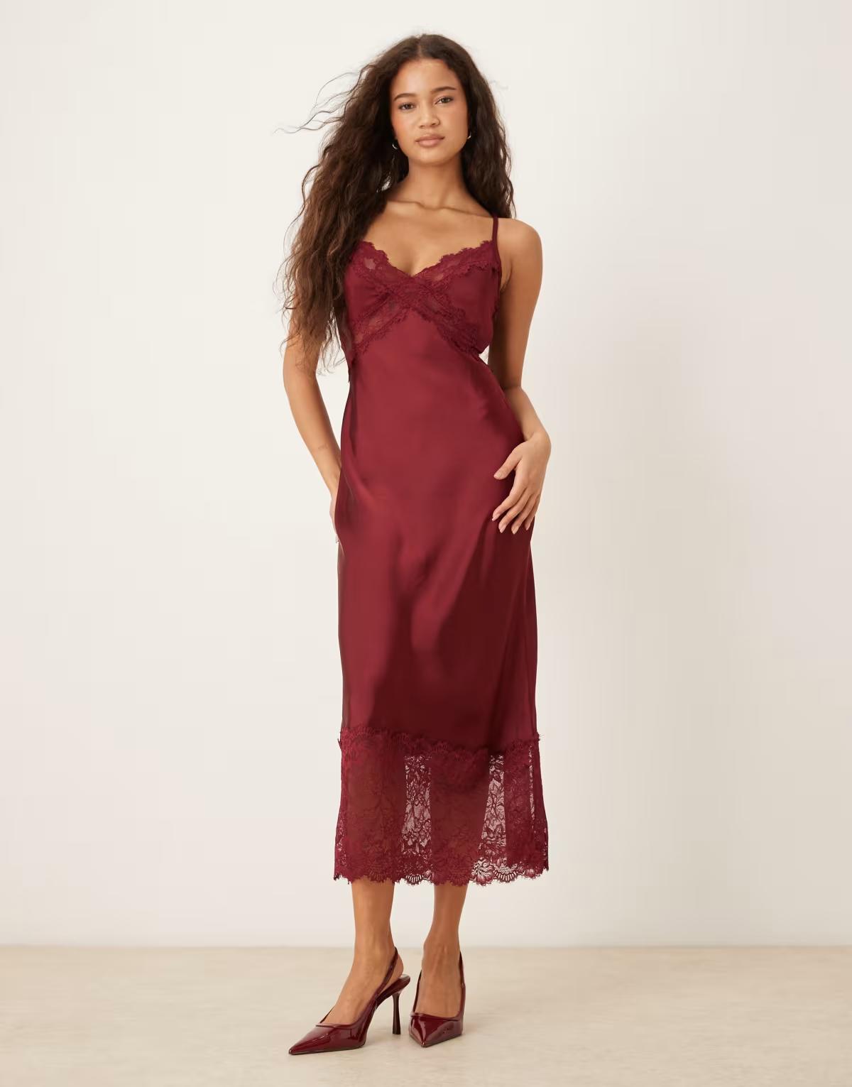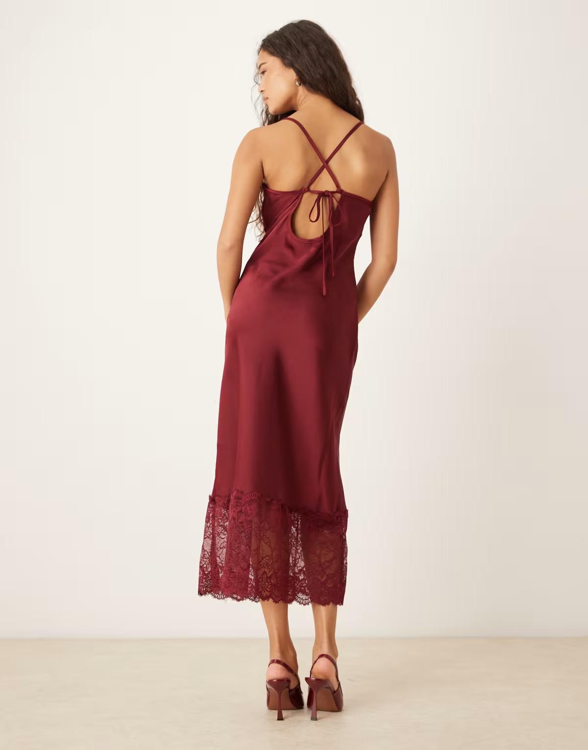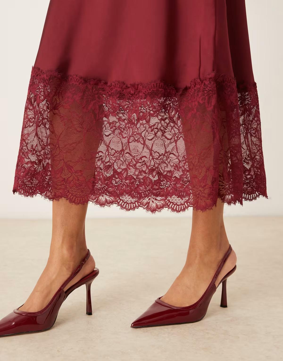 Kiss The Sky satin midaxi lace detailed dress in burgundy