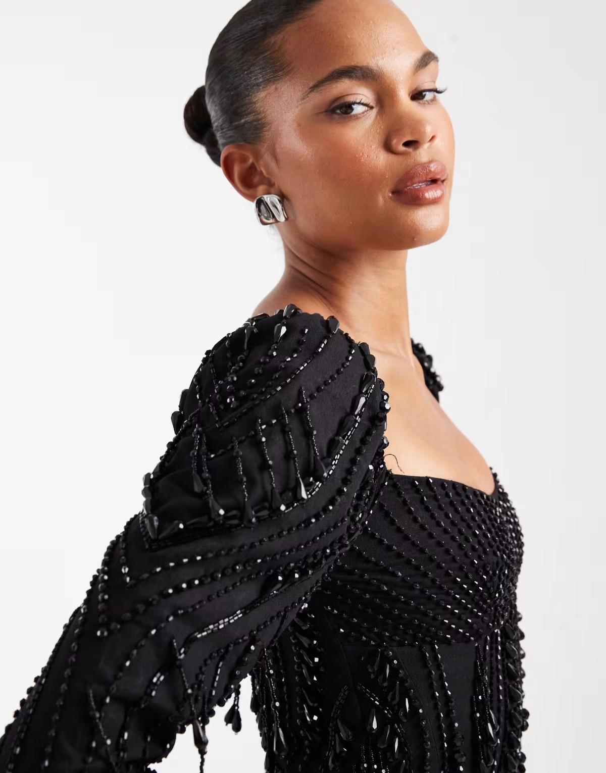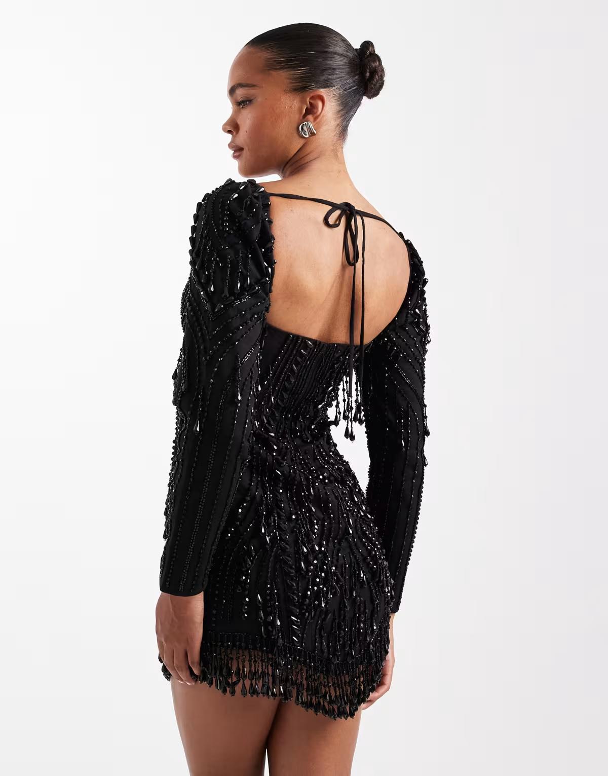 ASOS DESIGN embellished panelled mini dress with beaded fringe in black