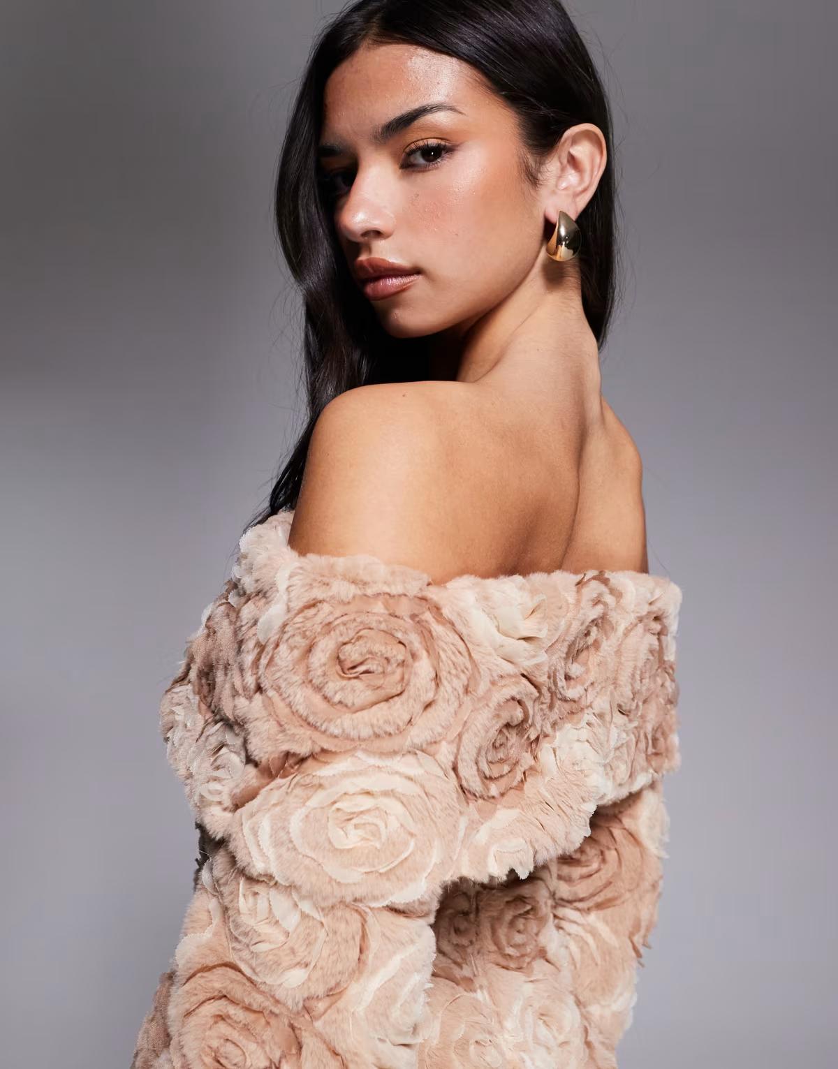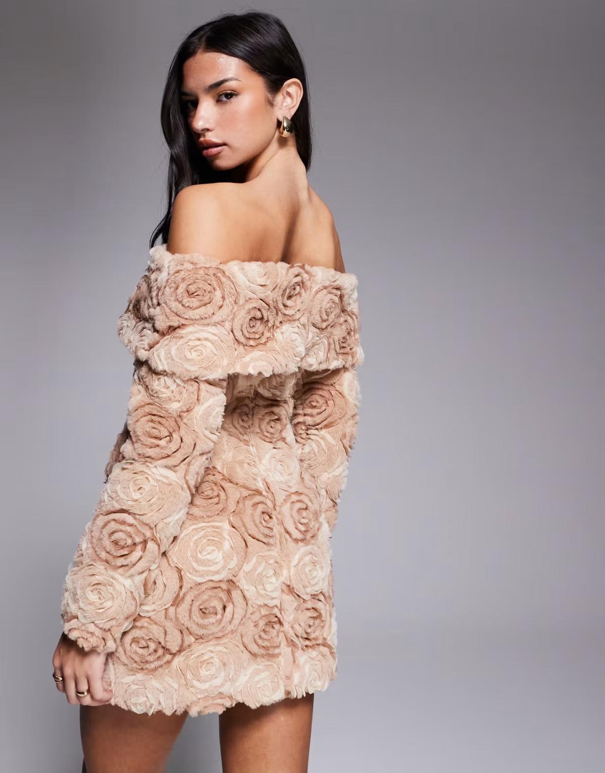 ASOS LUXE off shoulder fur flower mini dress in brown