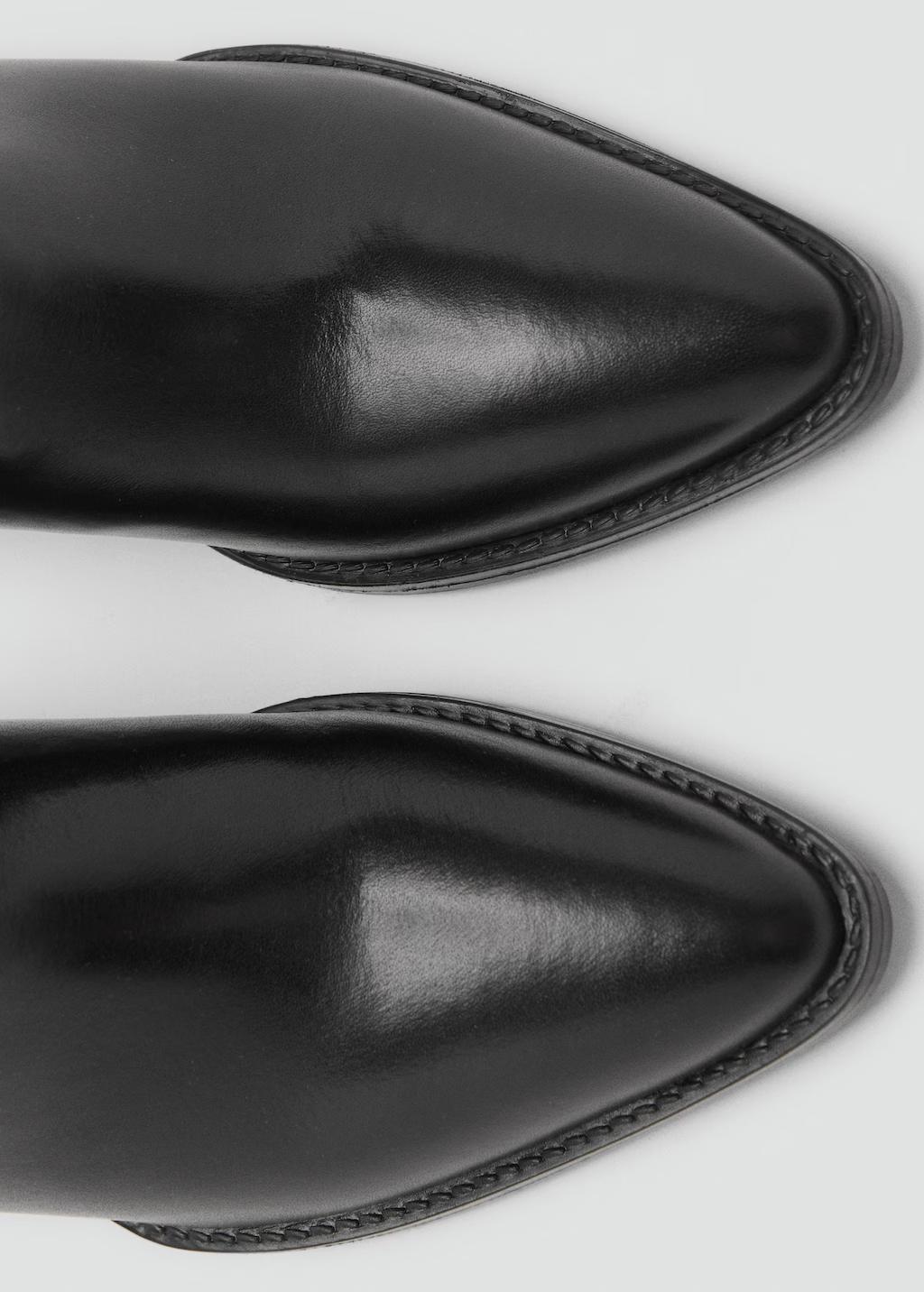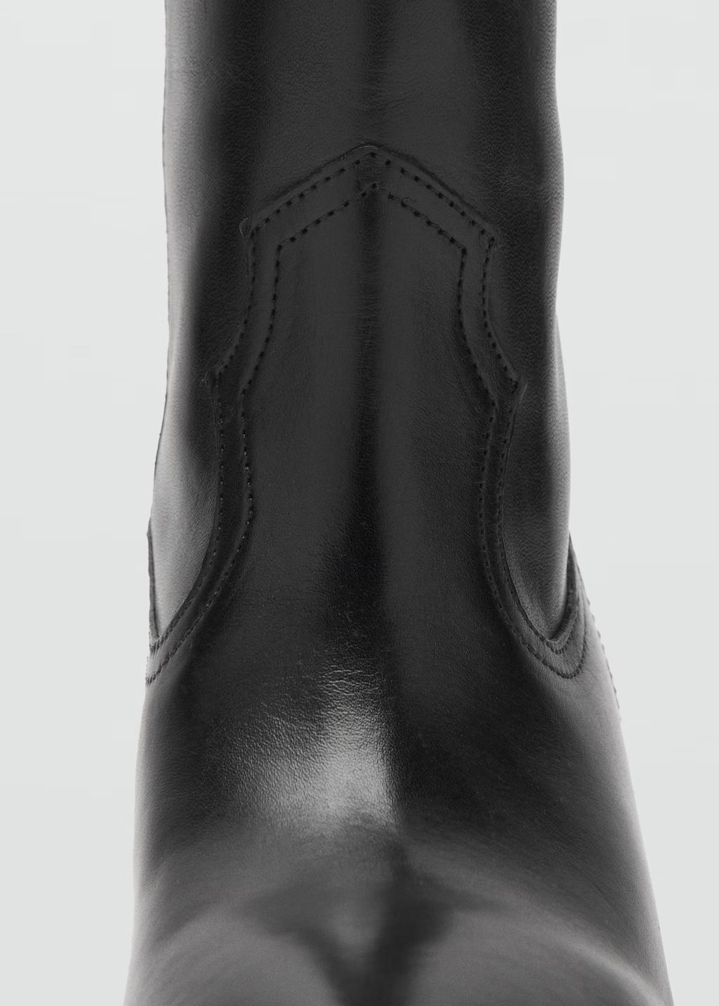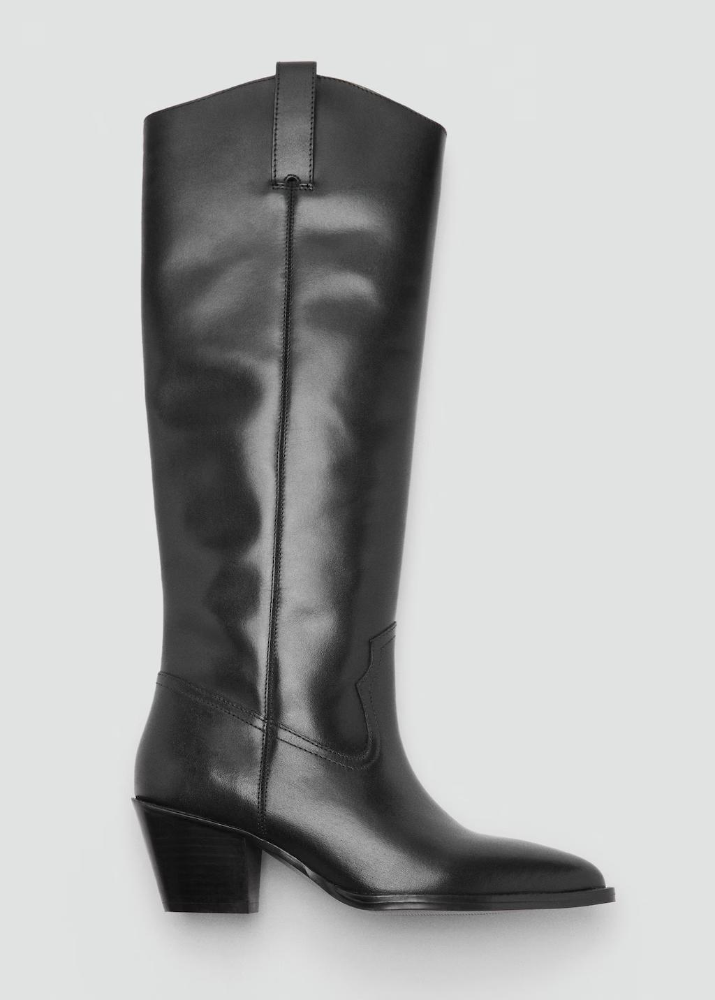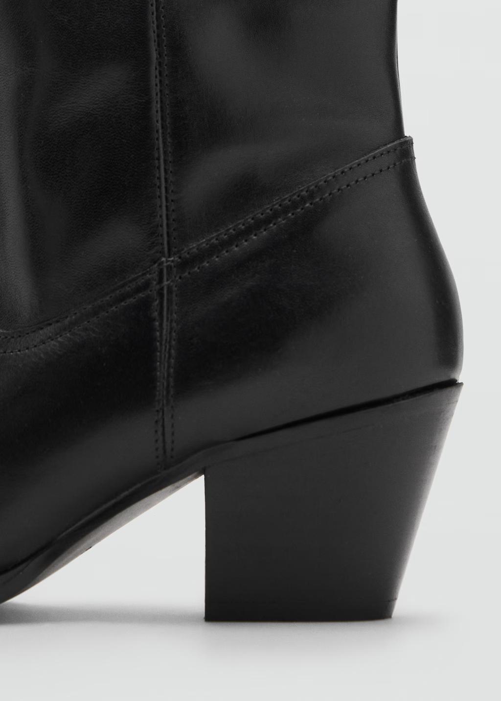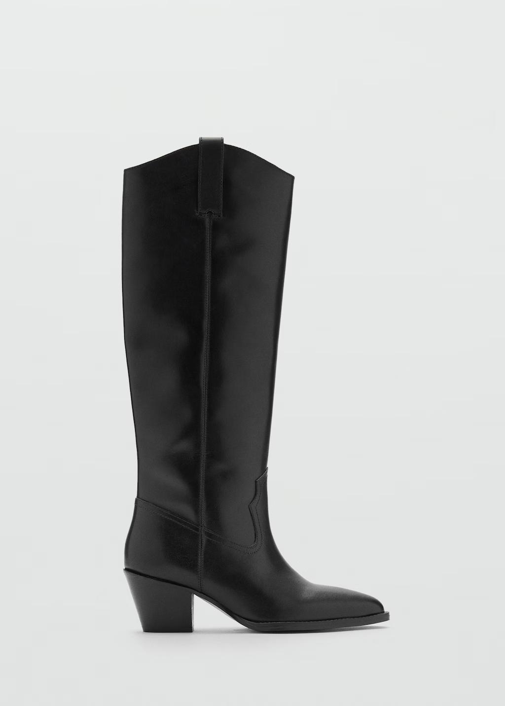 100% piel bovino. Caña alta. Con punta. Tacón rectangular. Sin cierre. Forro interior. El tacón mide 5 cm