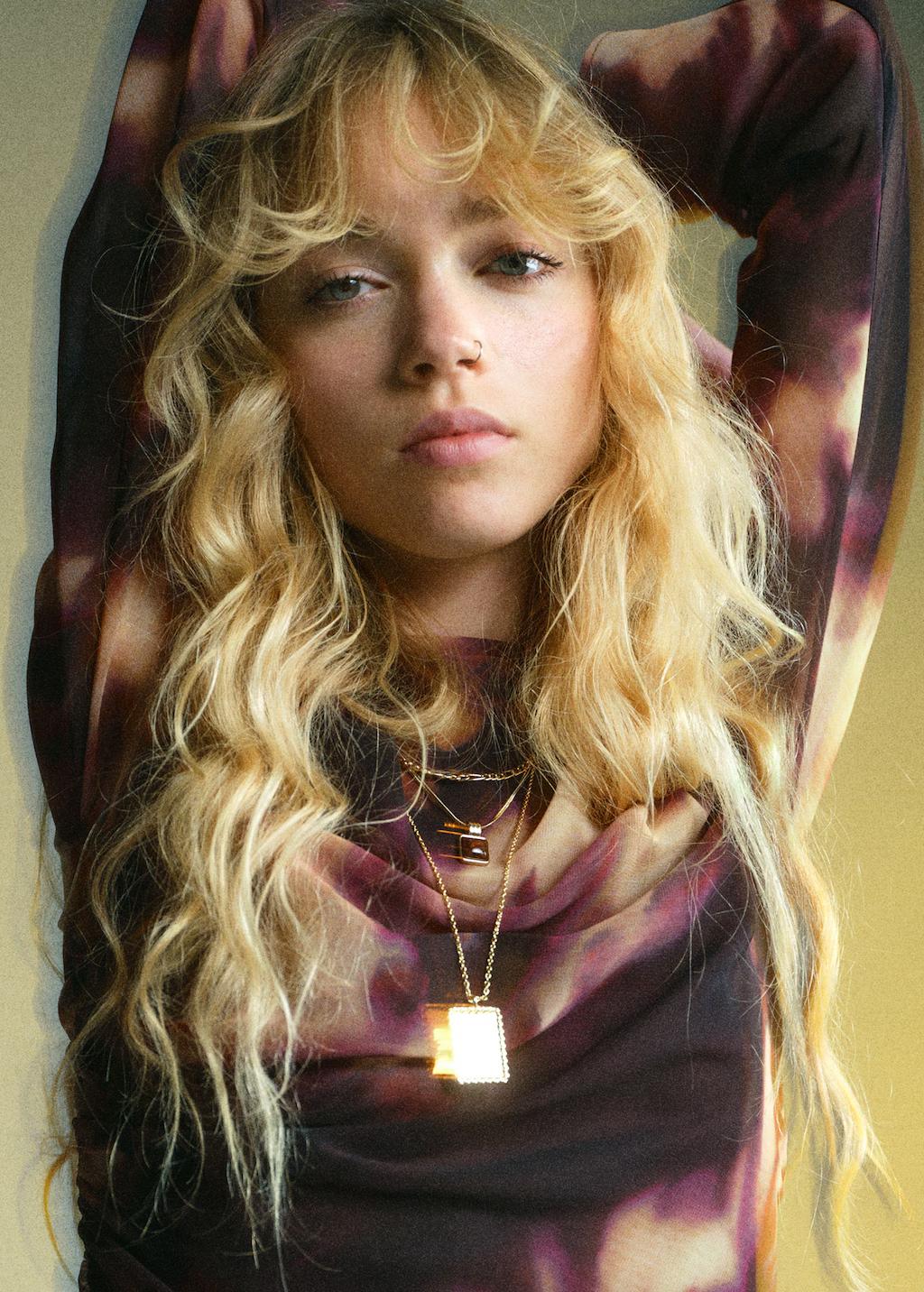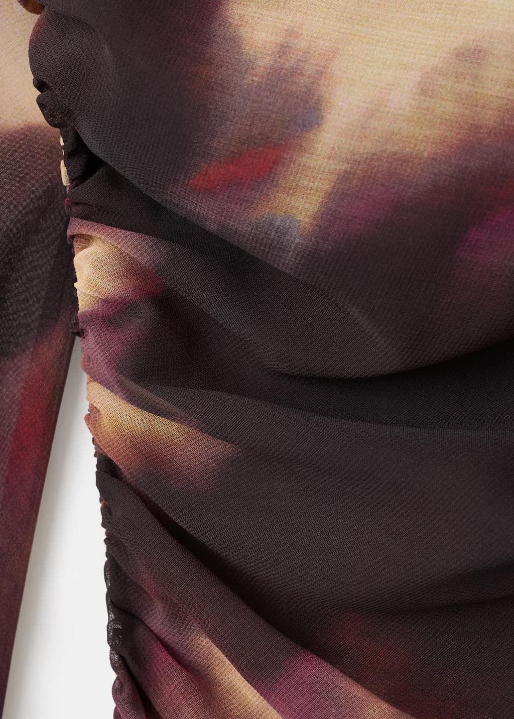 Tejido de gasa. Diseño midi. Diseño entallado. Diseño tie-dye. Cuello redondo. Manga larga acampanada. Detalle fruncido en el hombro. Fruncido lateral. Cierre de cremallera en la parte posterior. Forro interior