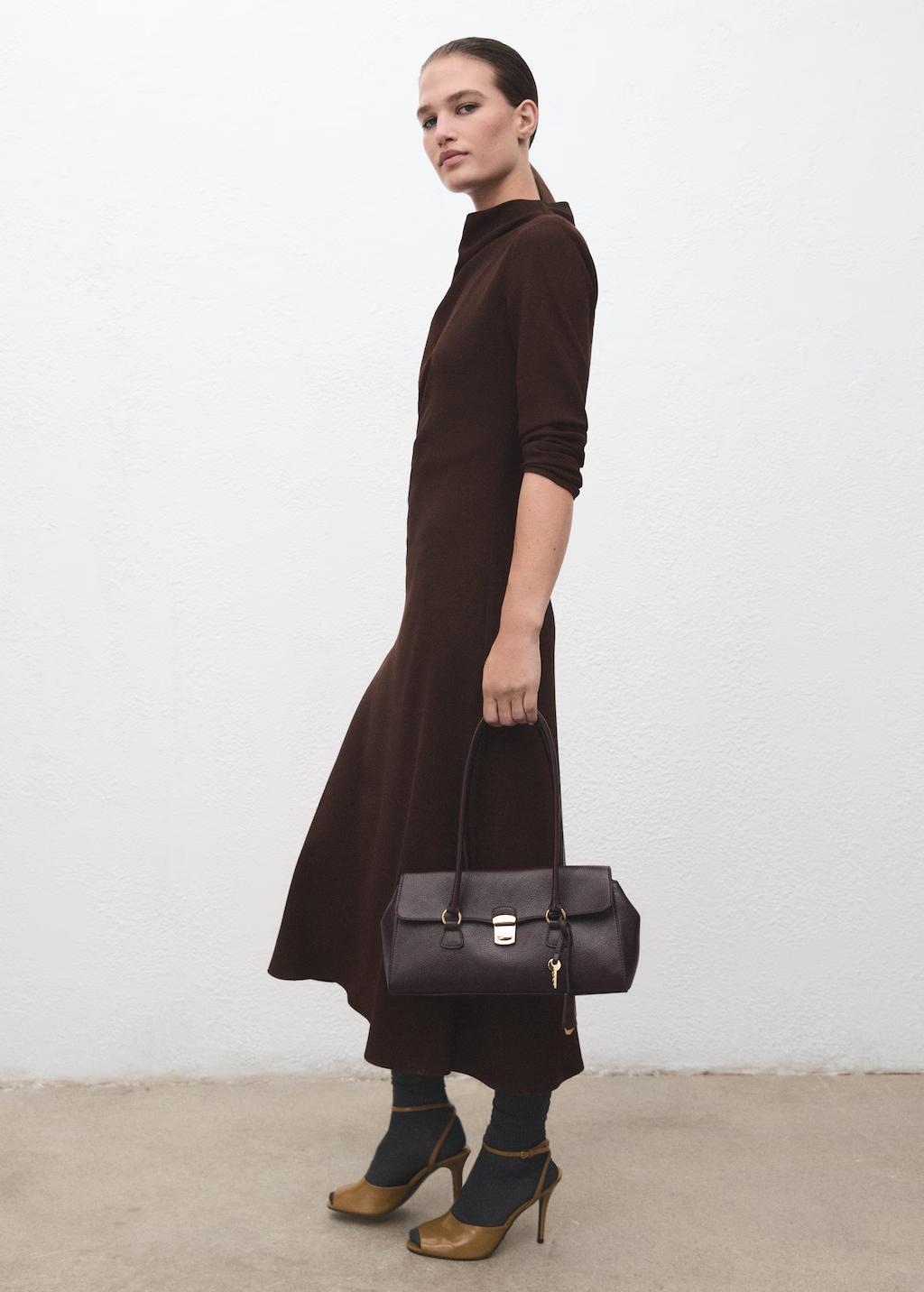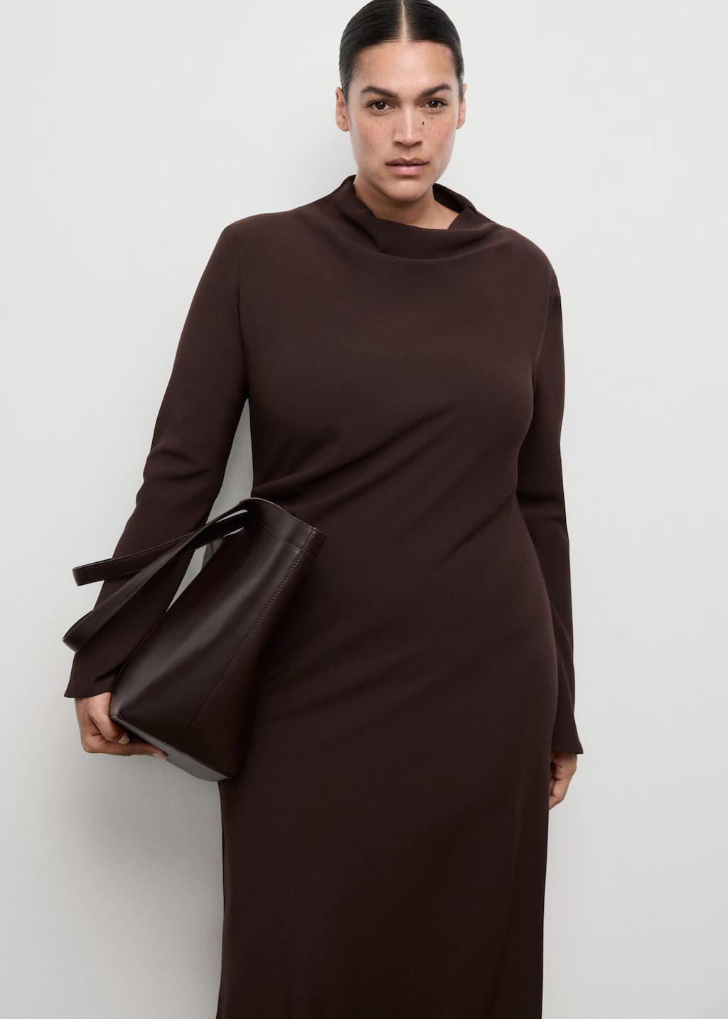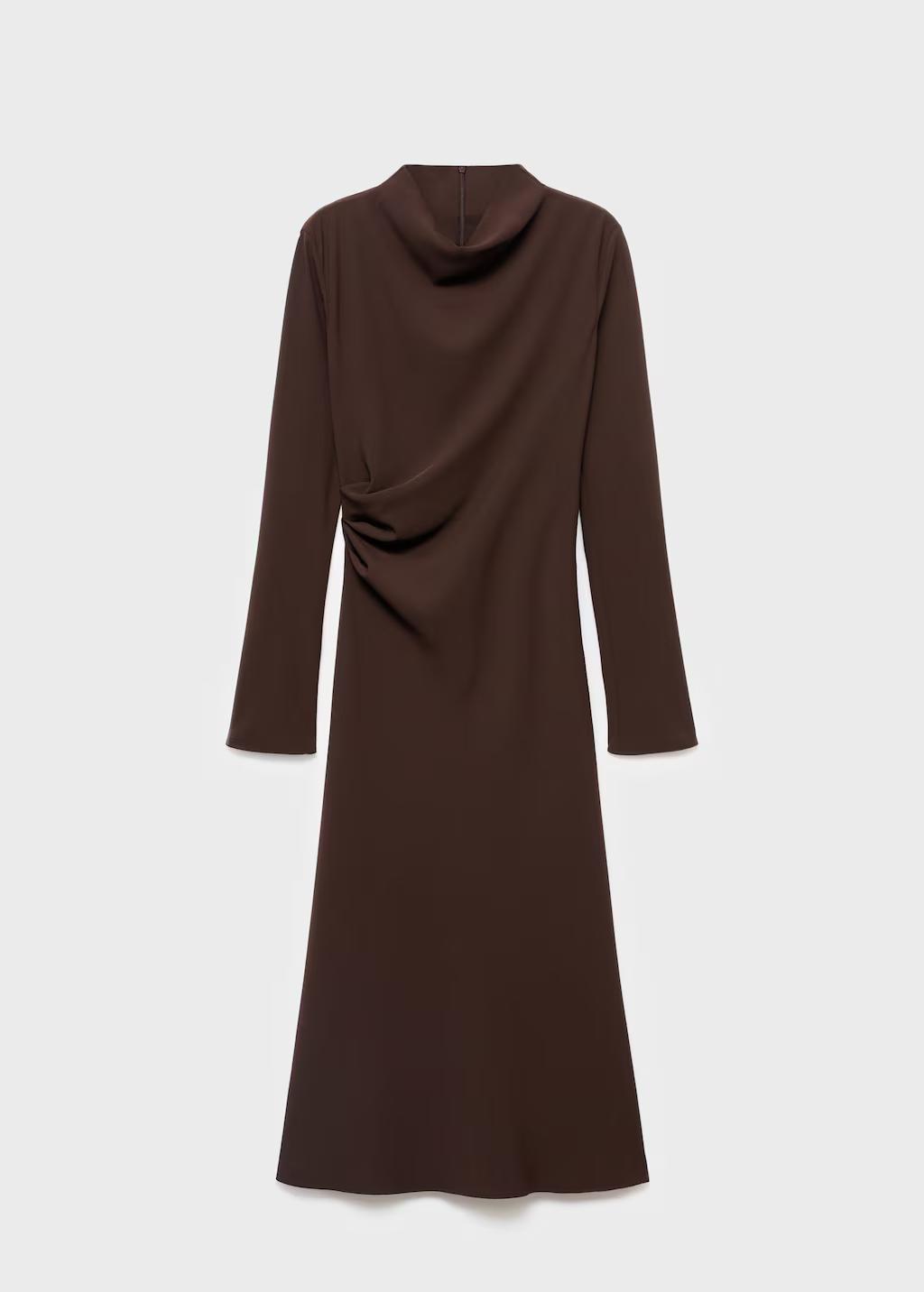 Diseño midi. Diseño evasé. Cuello drapeado. Manga larga. Fruncido lateral. Cierre de cremallera en la parte posterior. Forro interior. Disponible Plus