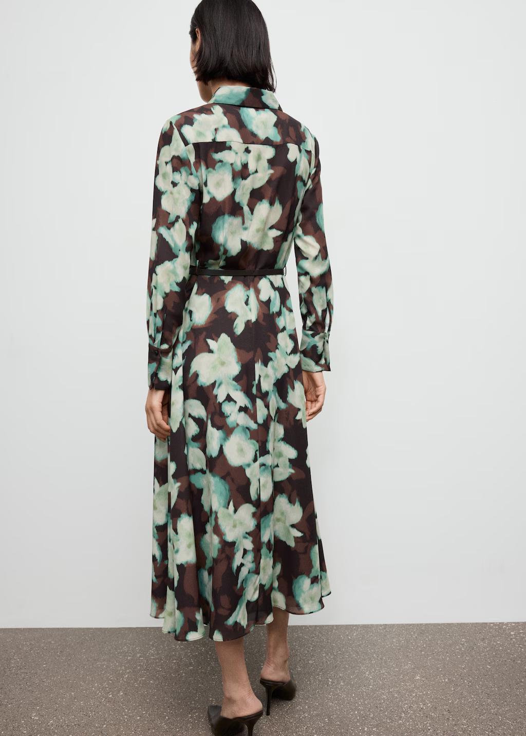 Diseño midi. Diseño evasé. Diseño estampado. Cuello camisero. Manga larga con puños abotonados. Cinturón con cierre de hebilla. Cierre delantero con botones. Forro interior