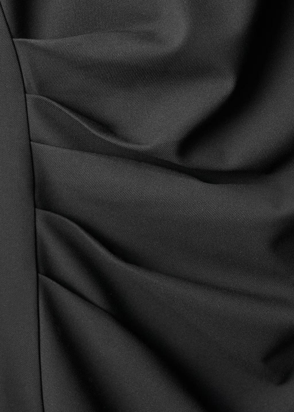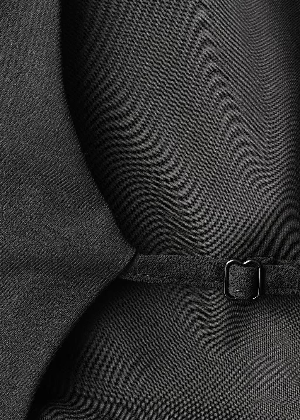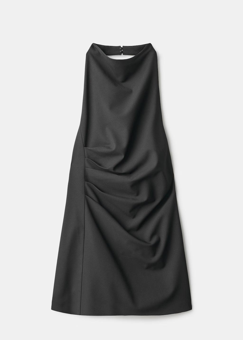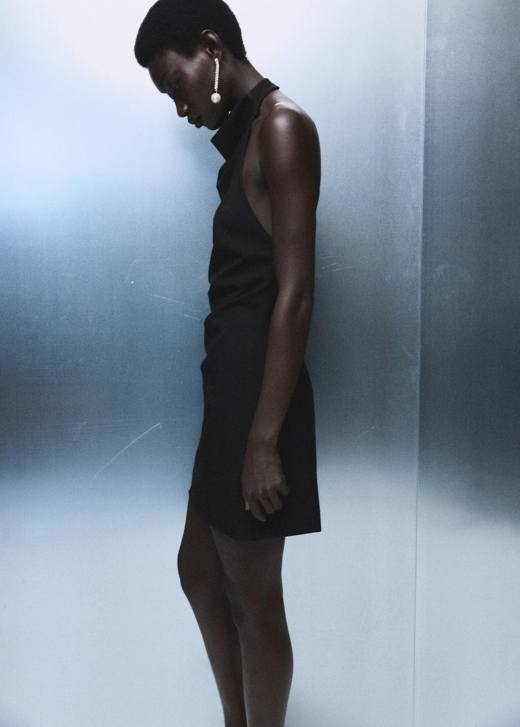 Diseño corto. Diseño entallado. Cuello halter. Espalda abierta. Fruncido lateral. Tira ajustable en la parte posterior. Cierre de botones en el cuello. Forro interior