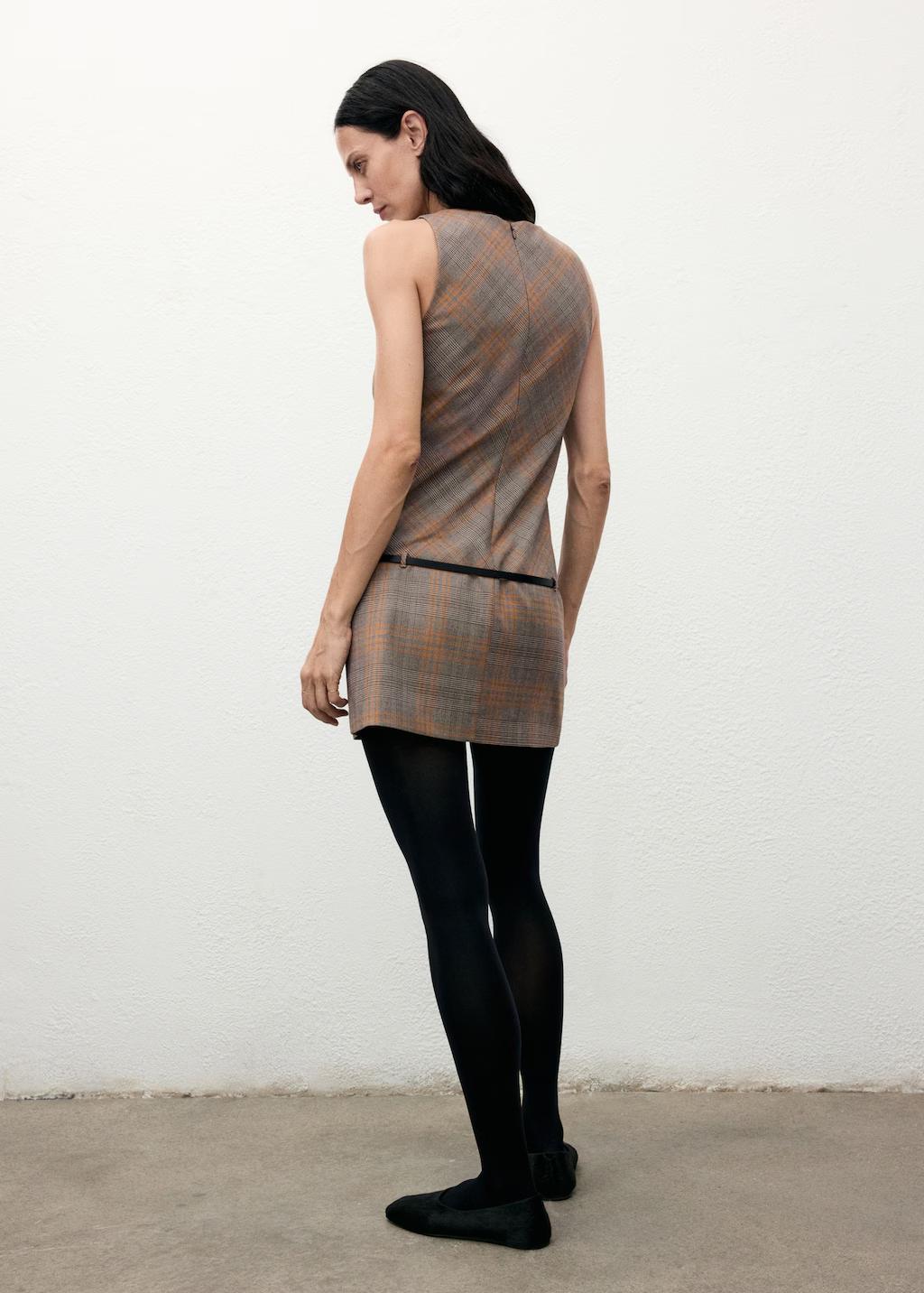 Diseño corto. Diseño recto. Diseño de cuadros. Cuello redondo. Sin mangas. Tirantes anchos. Trabillas. Cinturón con cierre de hebilla. Cierre de cremallera en la parte posterior. Forro interior