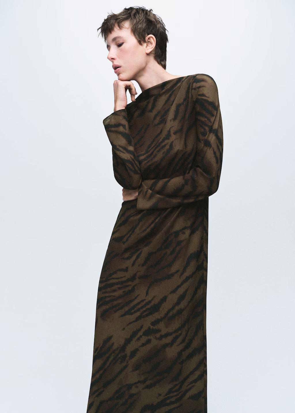 Tejido satinado. Estampado animal print. Diseño midi. Diseño recto. Cuello barco. Manga larga. Cierre de botón en la parte posterior. Forro interior