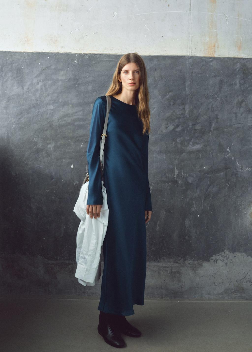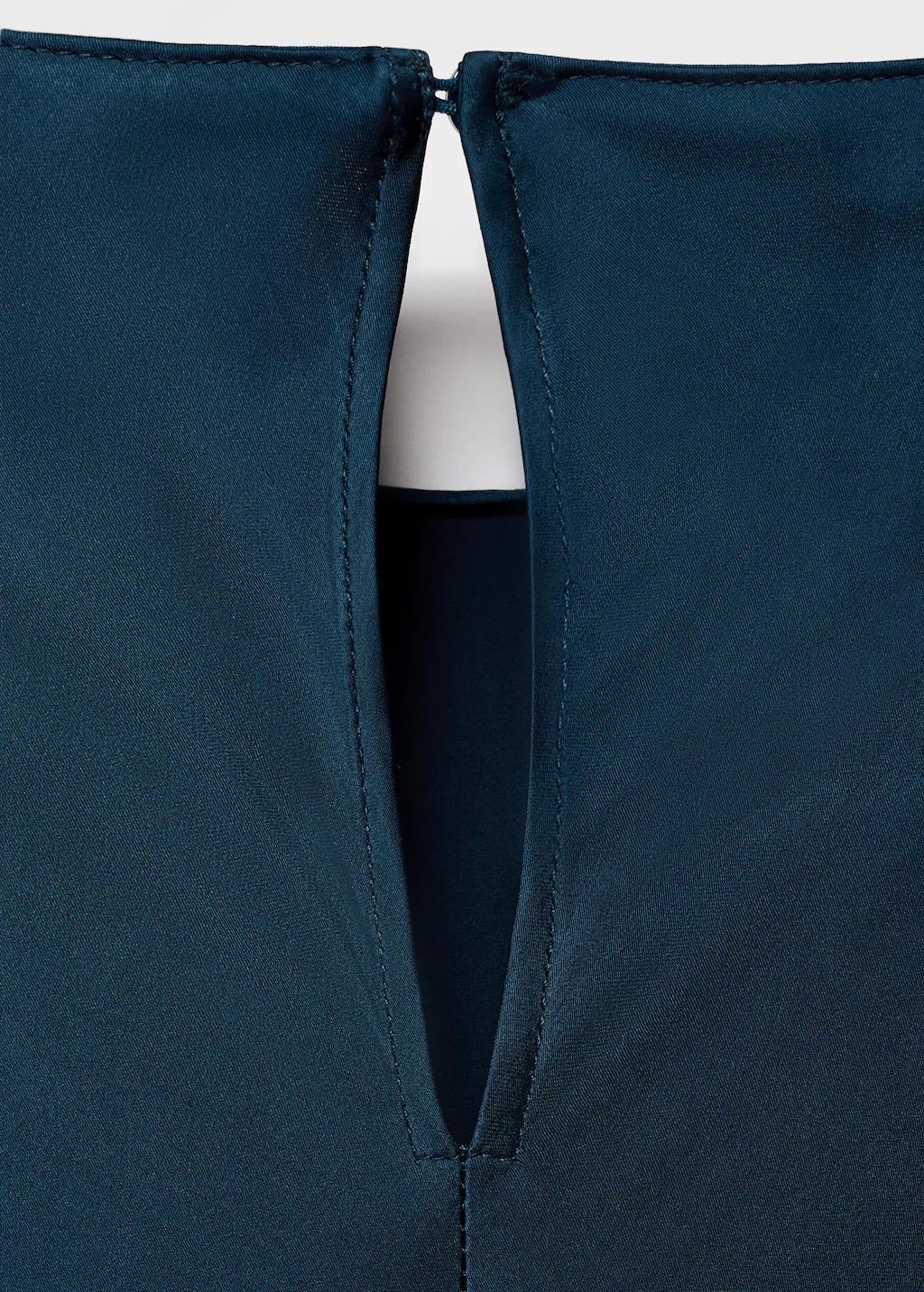 Tejido satinado. Diseño largo. Diseño entallado. Cuello redondo. Manga larga. Abertura posterior en el bajo. Cierre de botón en el cuello