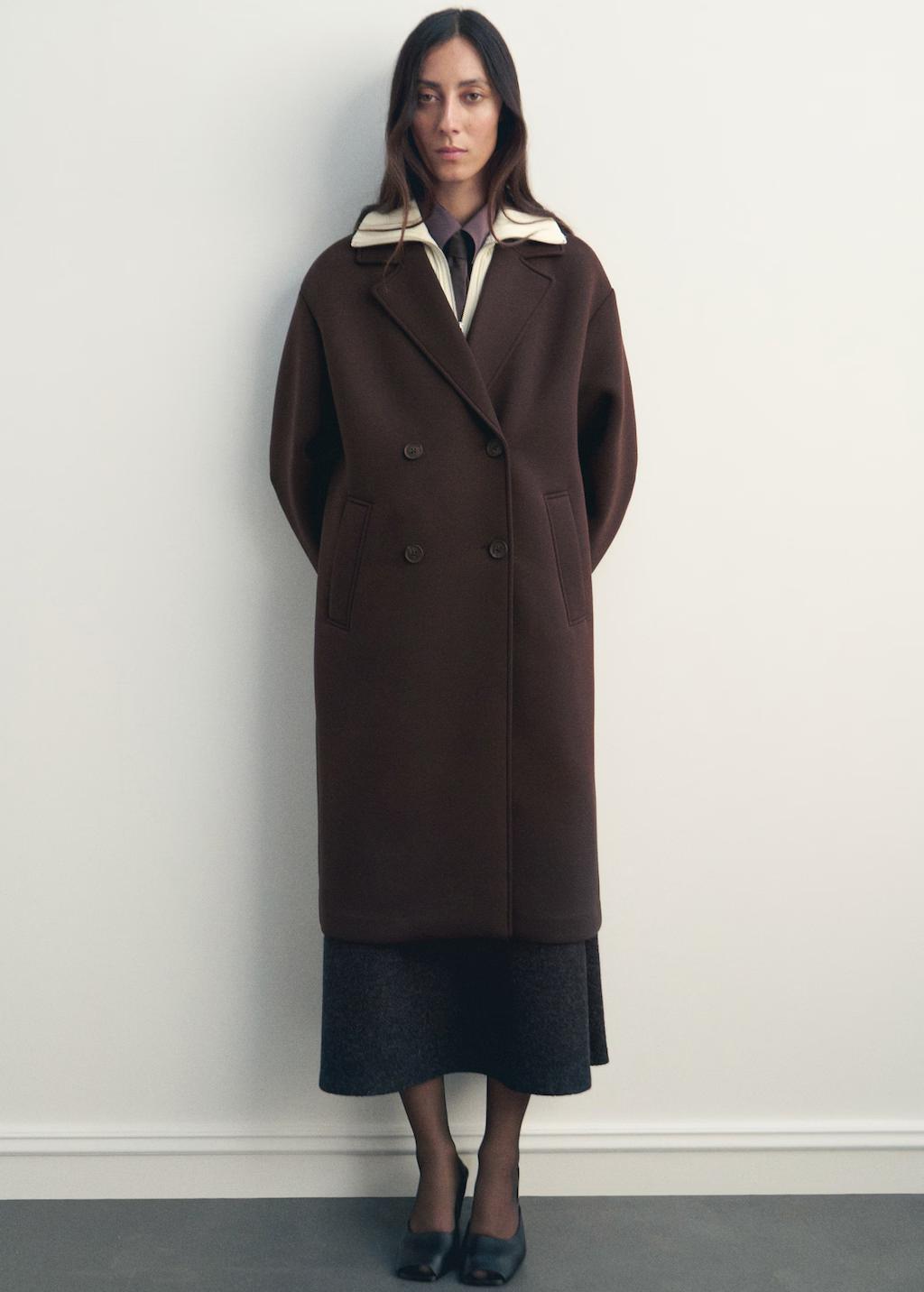 Con un diseño largo y recto, este abrigo presenta un estilo combinado con cuello camisero y manga larga. Incluye dos bolsillos laterales y cierre de doble botonadura, además de un forro interior