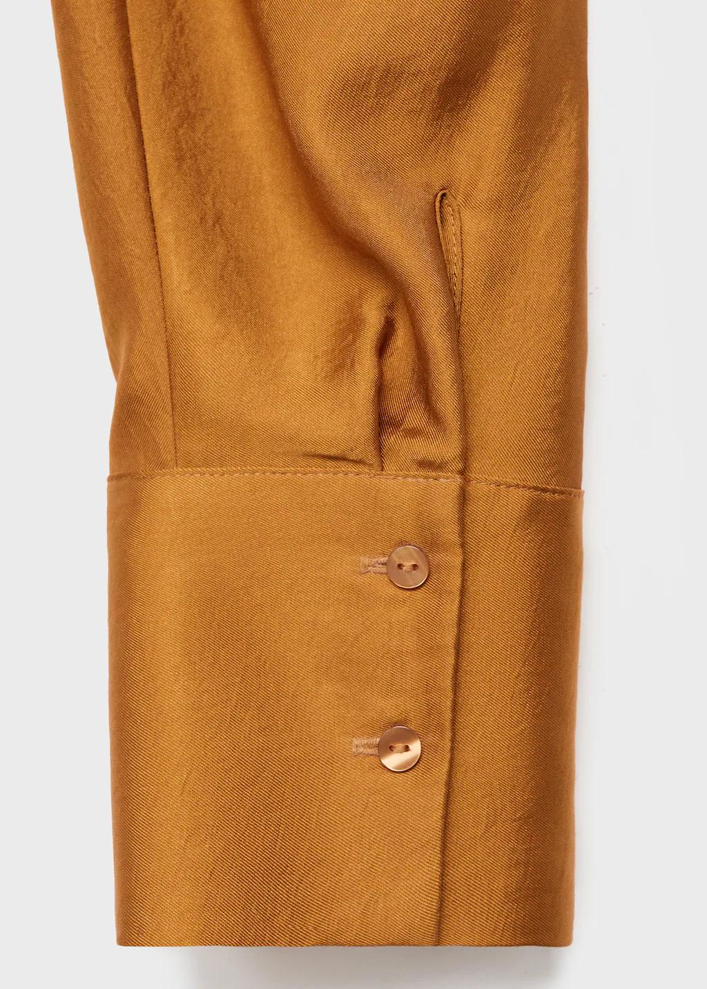 Confeccionada en tejido satinado, esta prenda presenta un diseño cruzado con cuello camisero. Las mangas largas tienen puños abotonados y el cierre delantero cuenta con botones ocultos