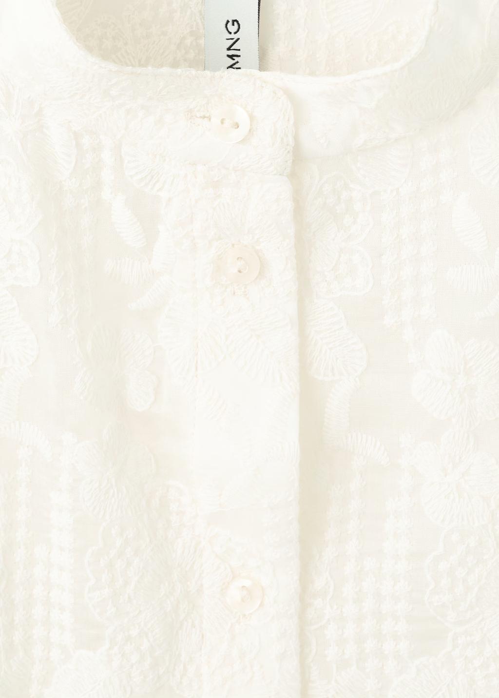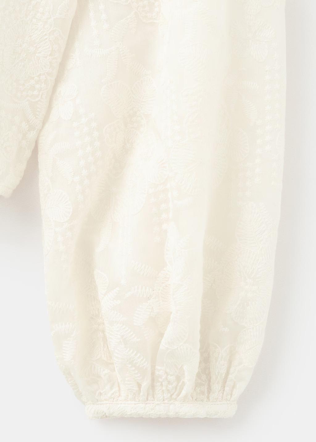 Confeccionada en tejido mezcla lyocell, esta blusa presenta un diseño recto con bordados. Cuenta con cuello de tira, manga larga con puños abullonados y cierra delantero con botones