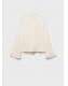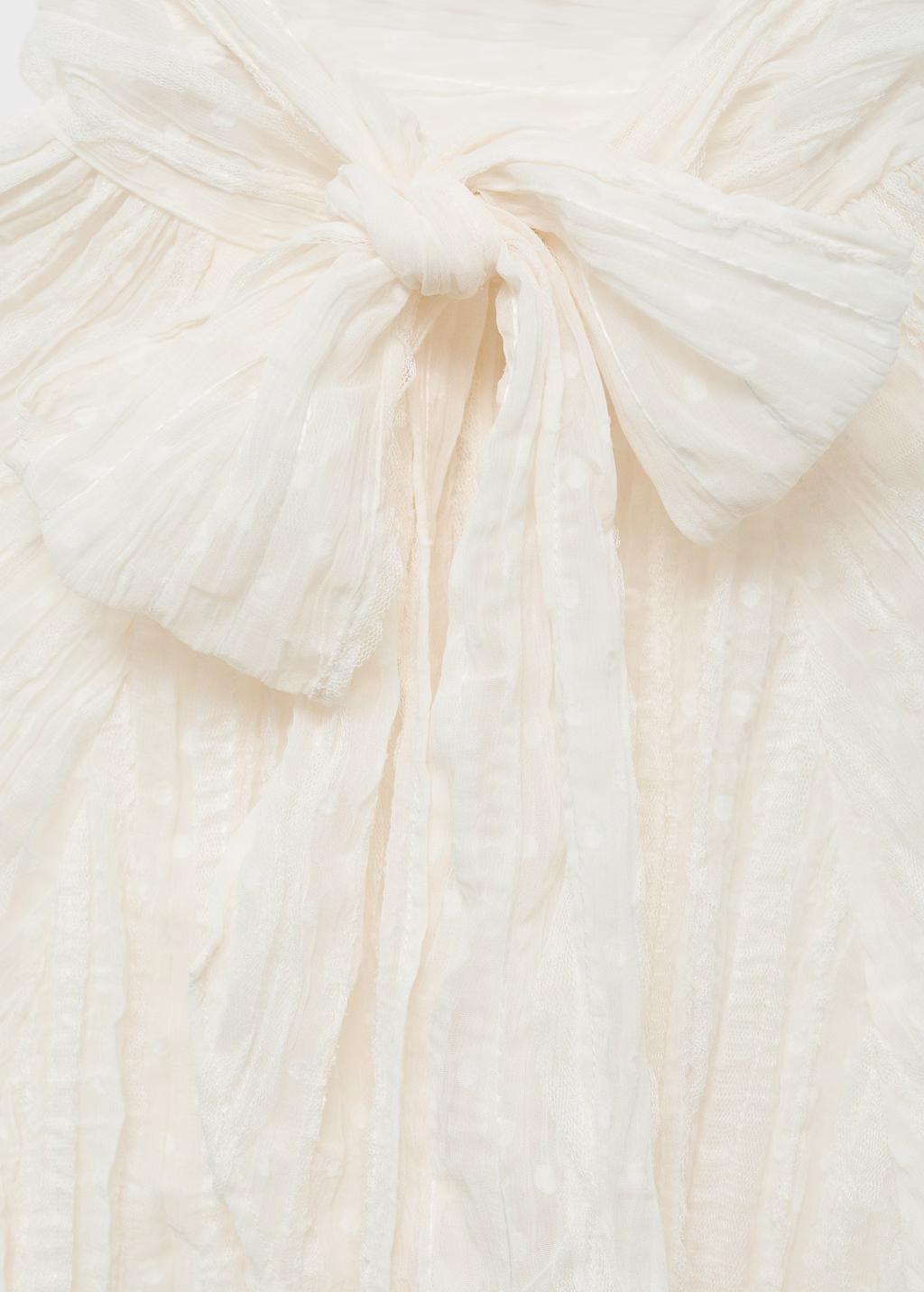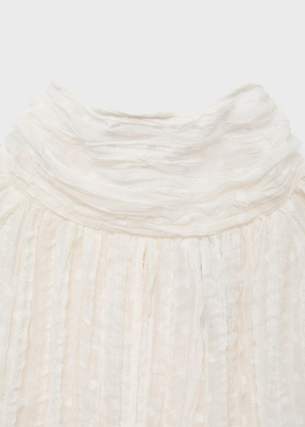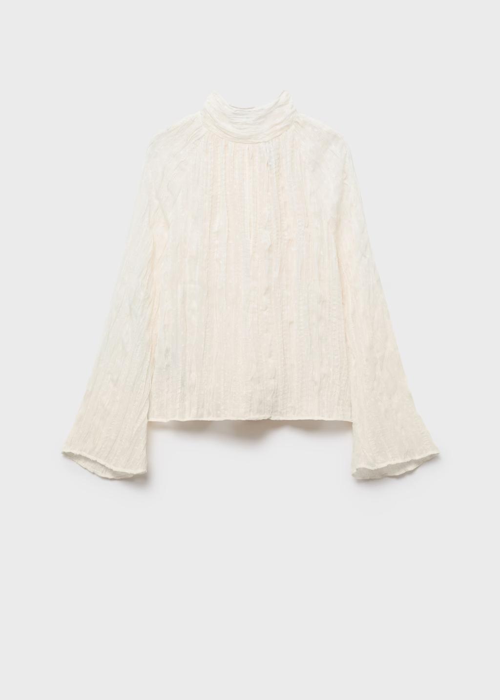 Confeccionada en tejido con textura, esta prenda presenta un diseño recto que se complementa con un cuello alto adornado con lazo y manga larga acampanada