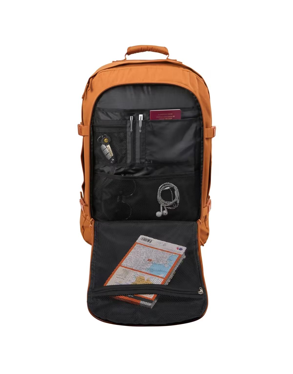 Front organiser pocket features compartments for a tablet, travel documents, pens and tickets