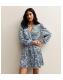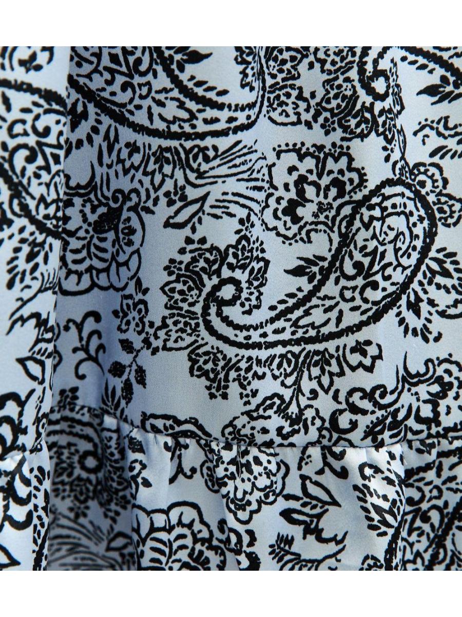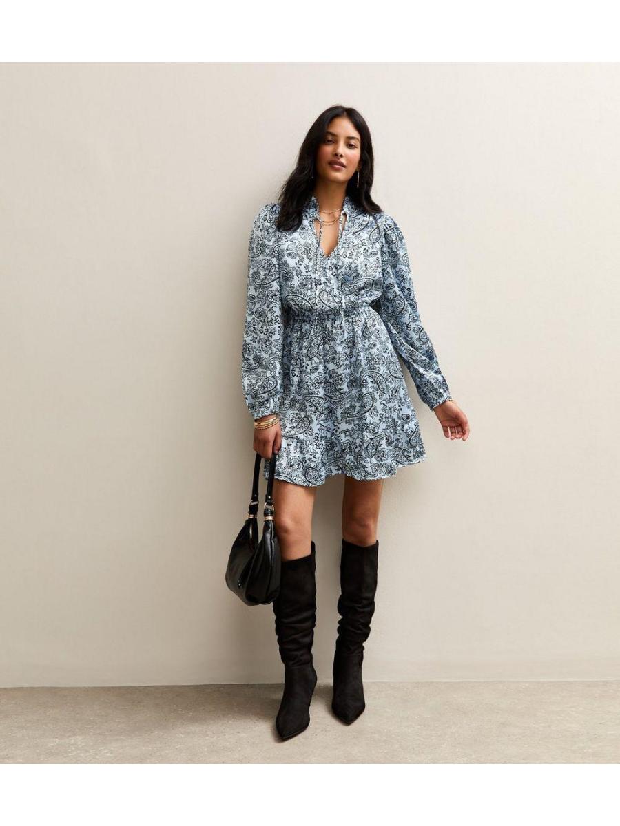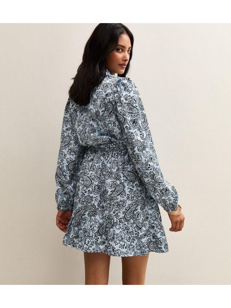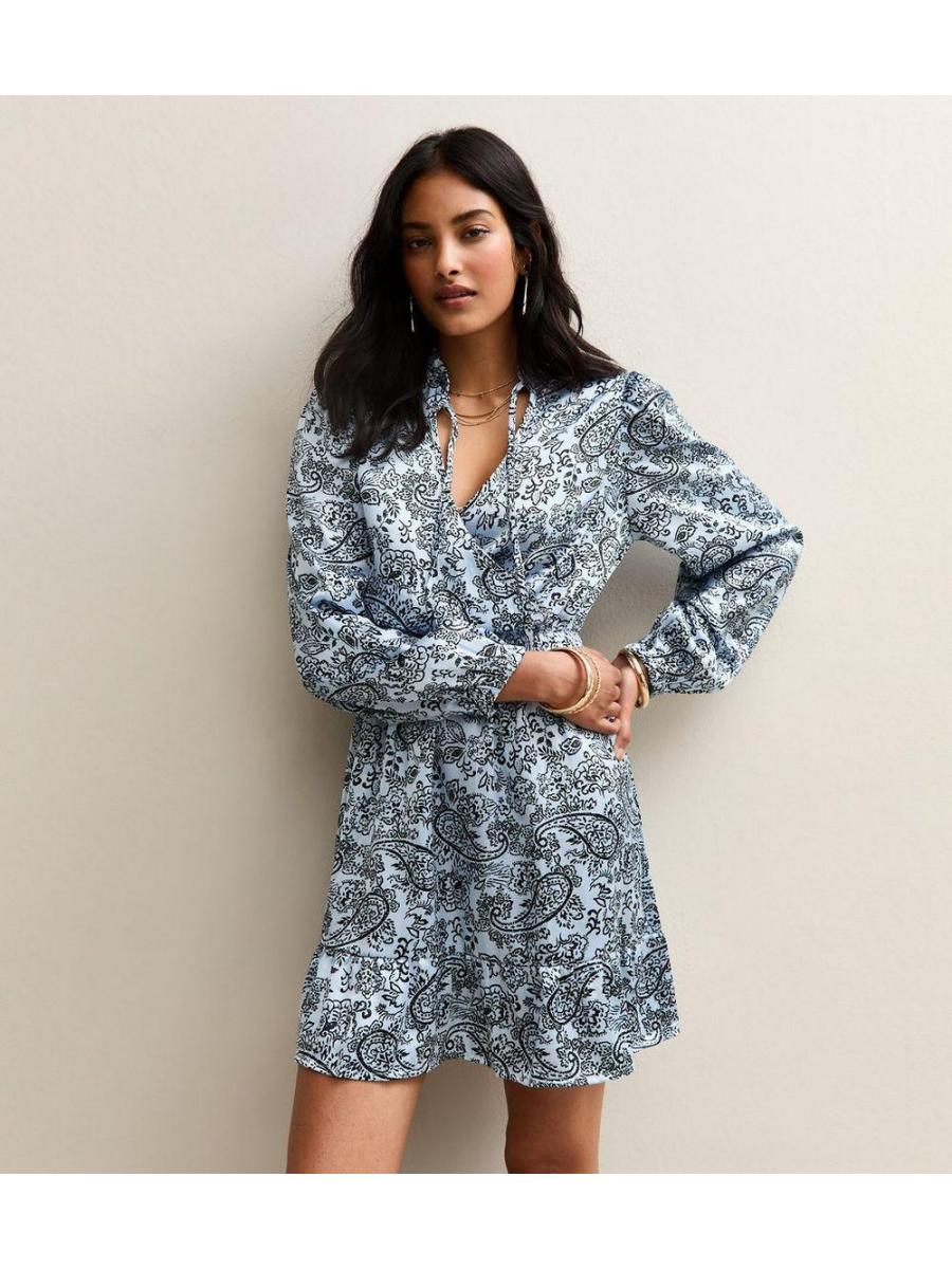 Light Blue Paisley Print Tie Neck Satin Mini Dress