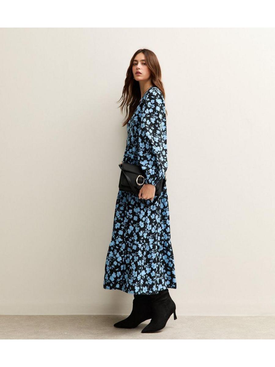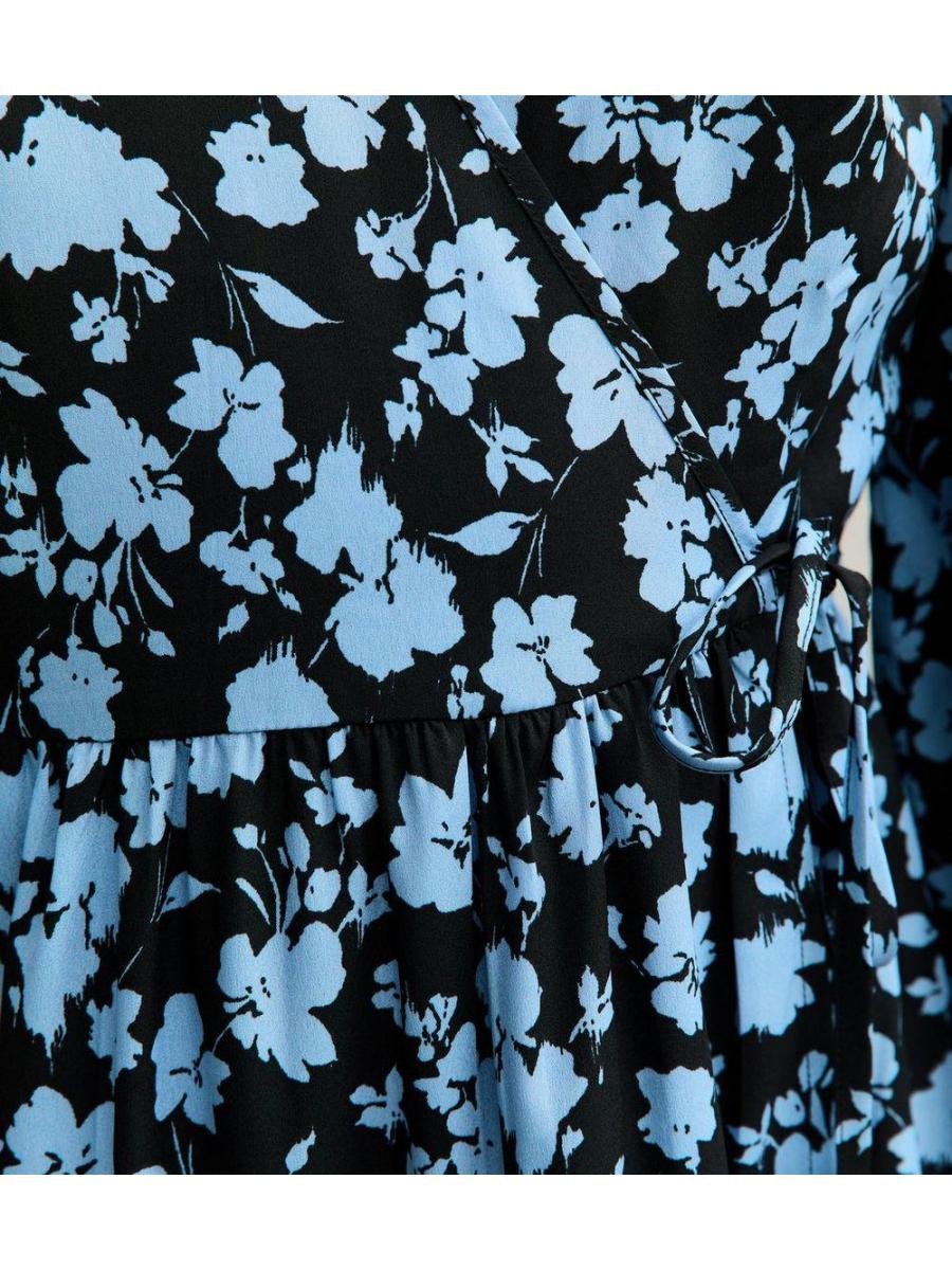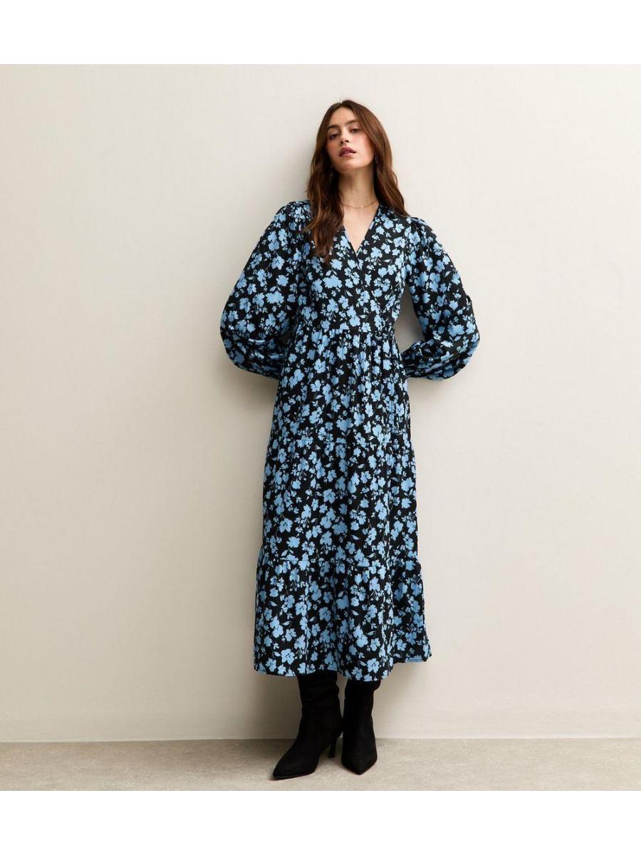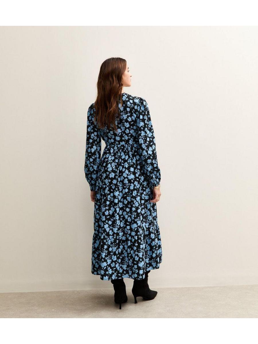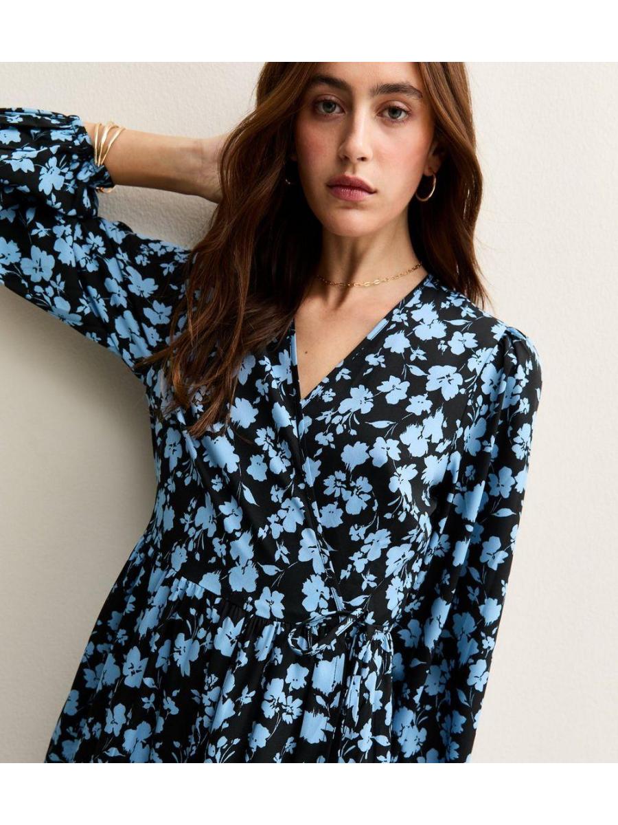 Black Floral Print Long Sleeve Wrap Midi Dress