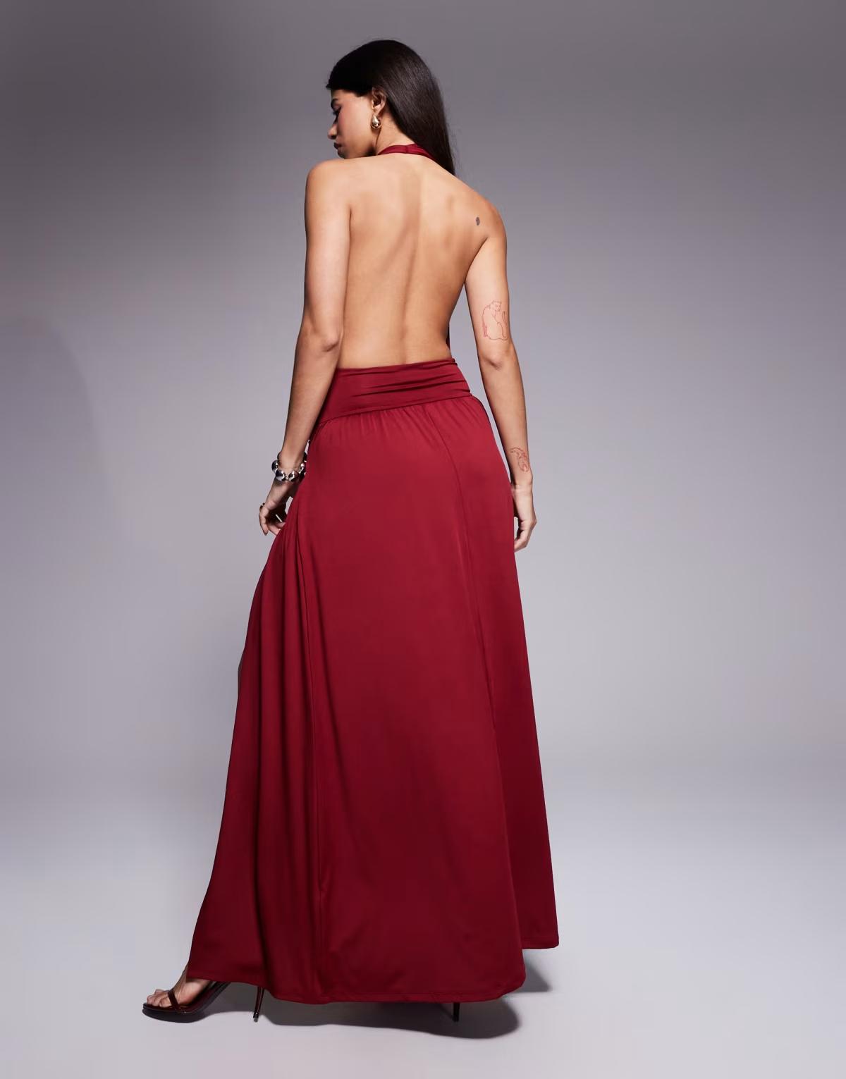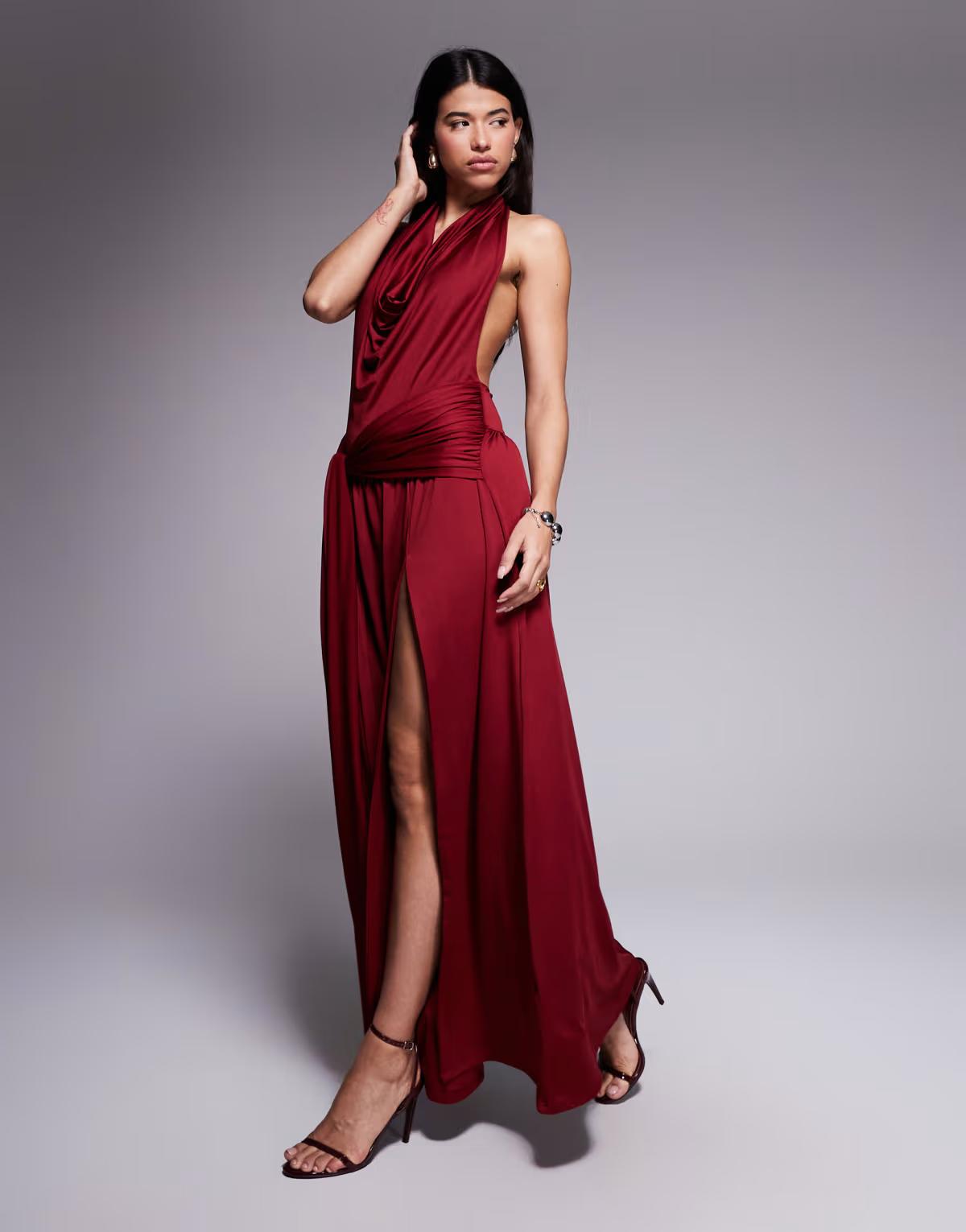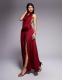 Aria Cove slinky cowl neck exposed back drape front detail thigh split maxi dress in burgundy