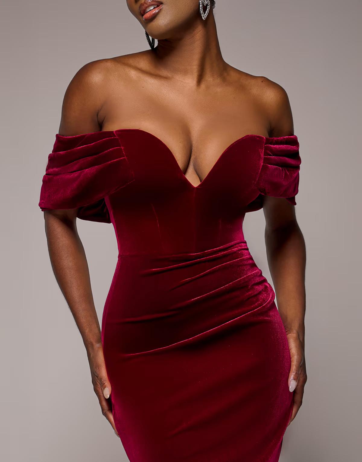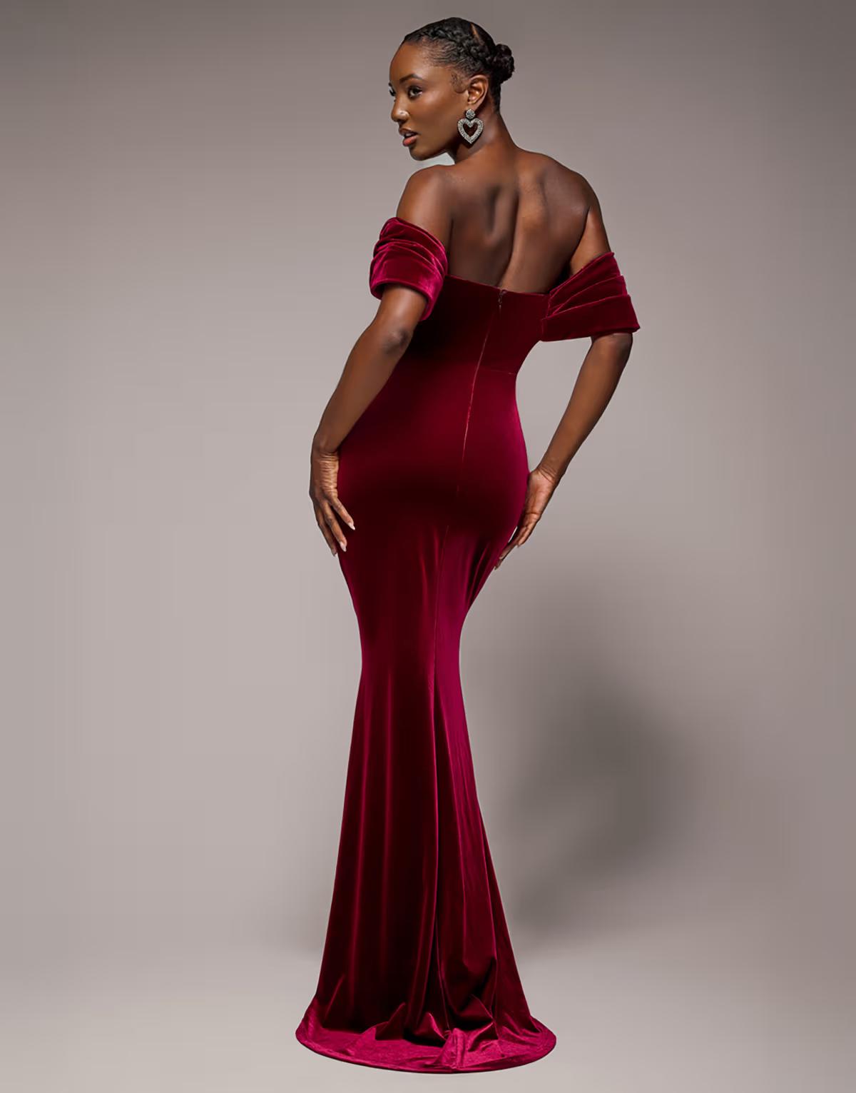 Goddiva Off the shoulder deep plunge velvet maxi dress in burgundy