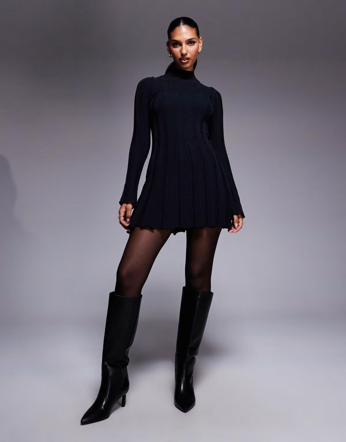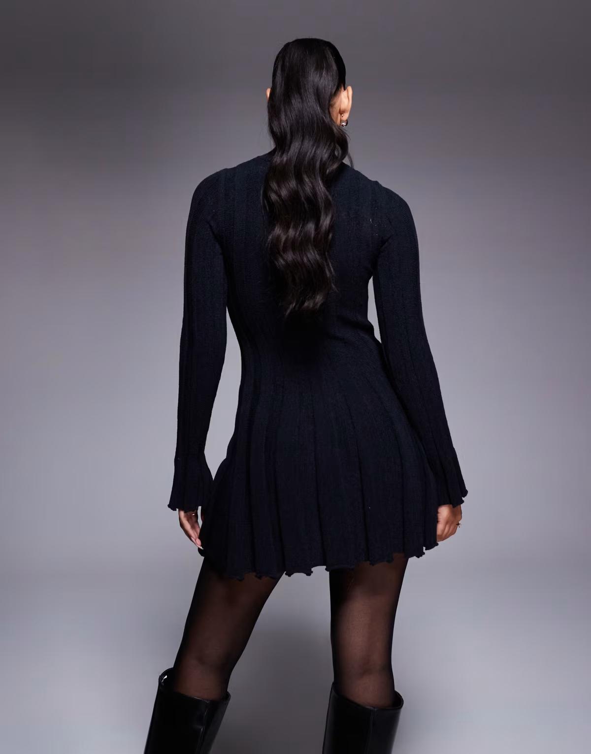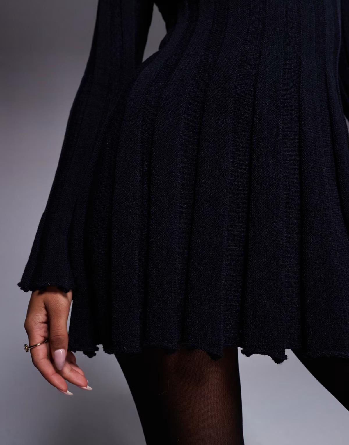 Aria Cove knitted high neck wide rib pleat hem mini dress in black