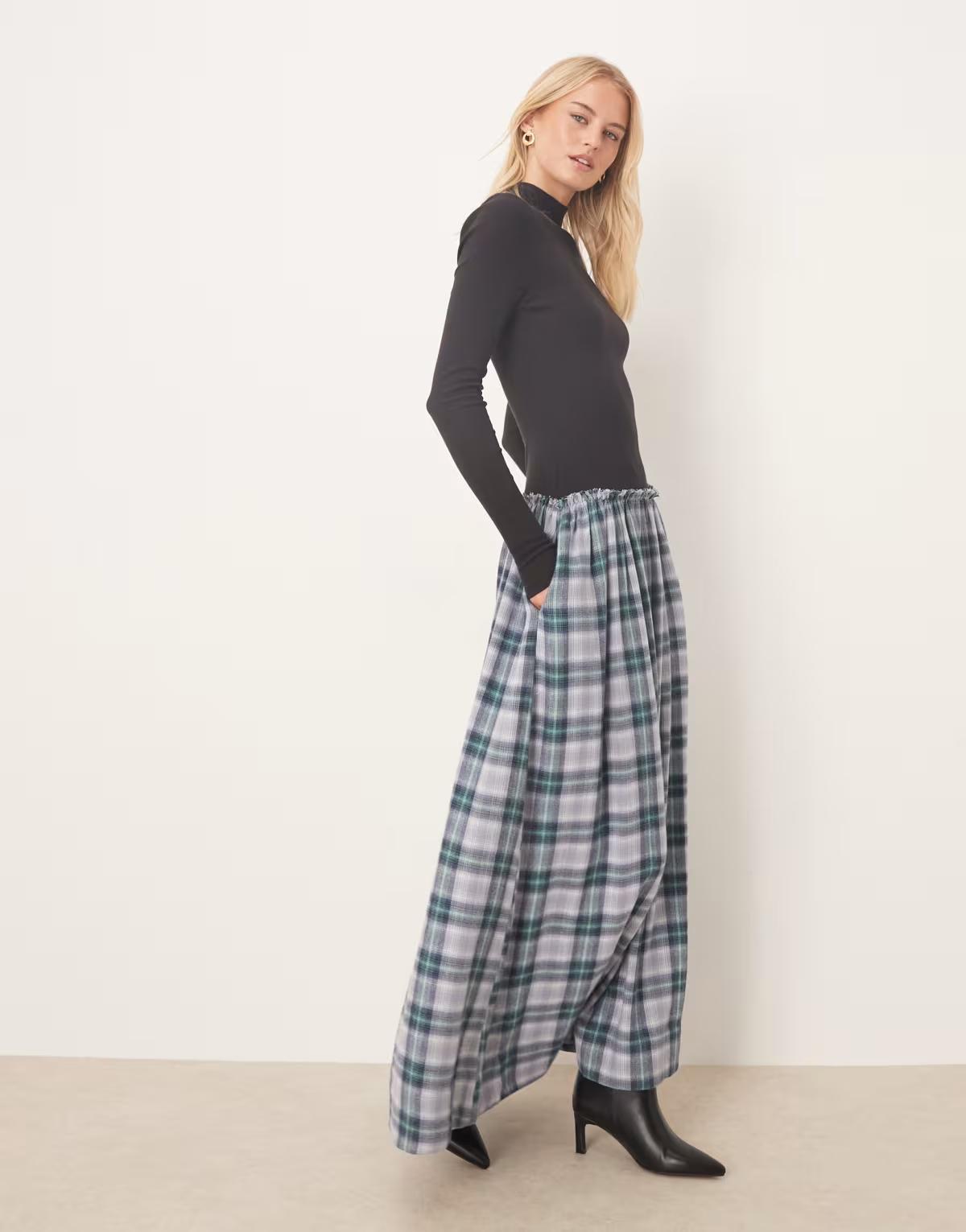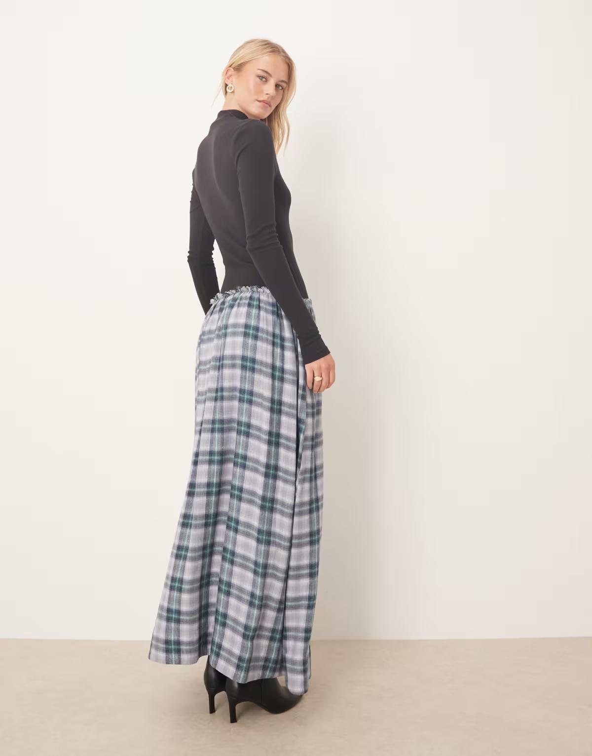 ASOS DESIGN Tall high neck long sleeve hybrid maxi dress in blue check