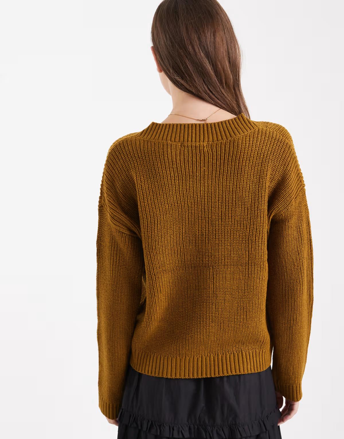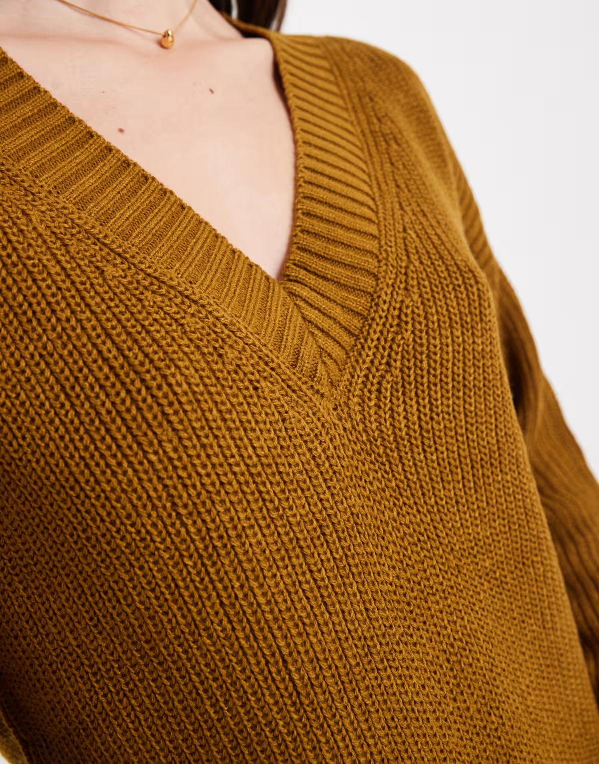 Brave Soul deep v neck fisherman knit jumper in olive green