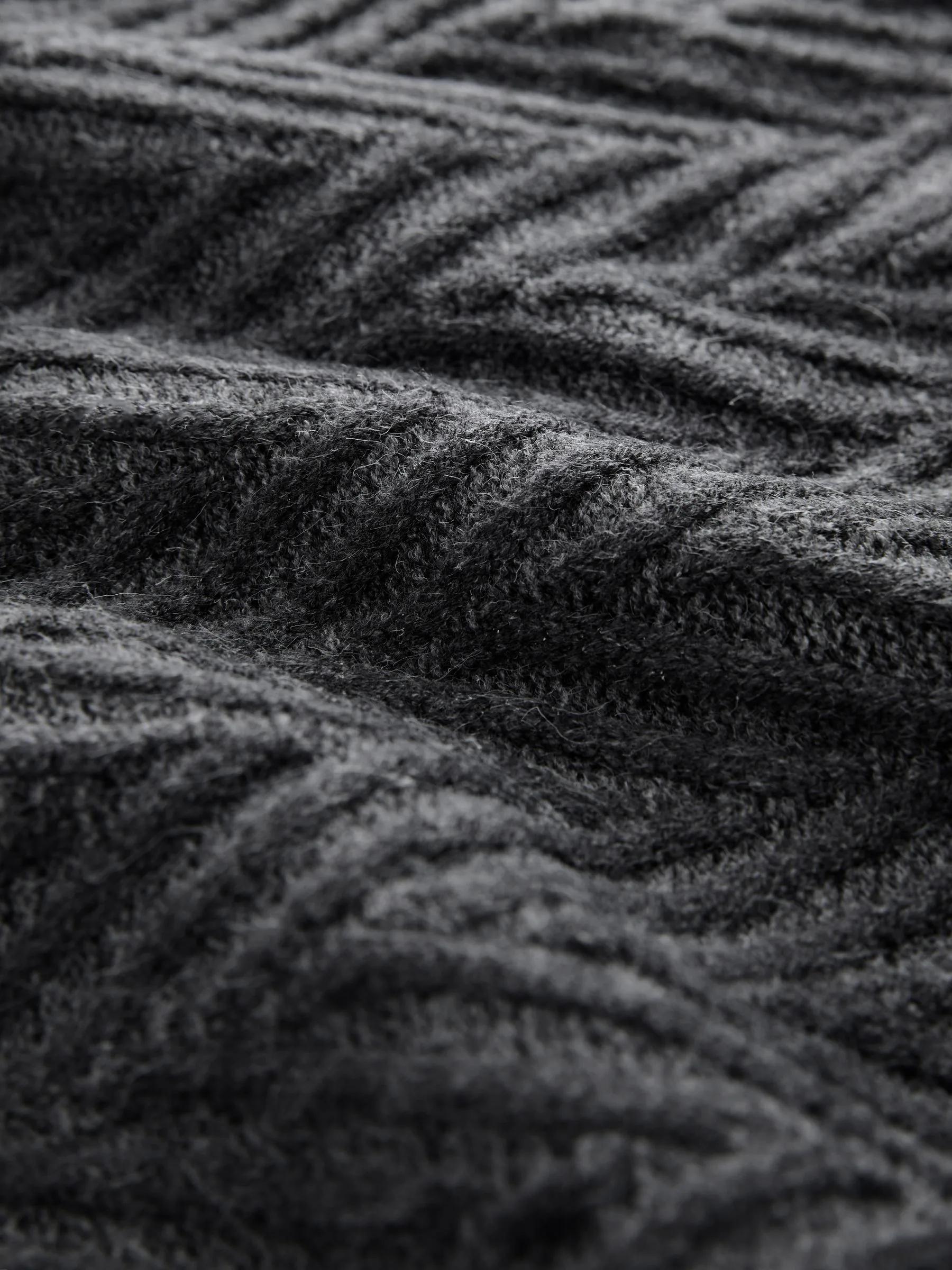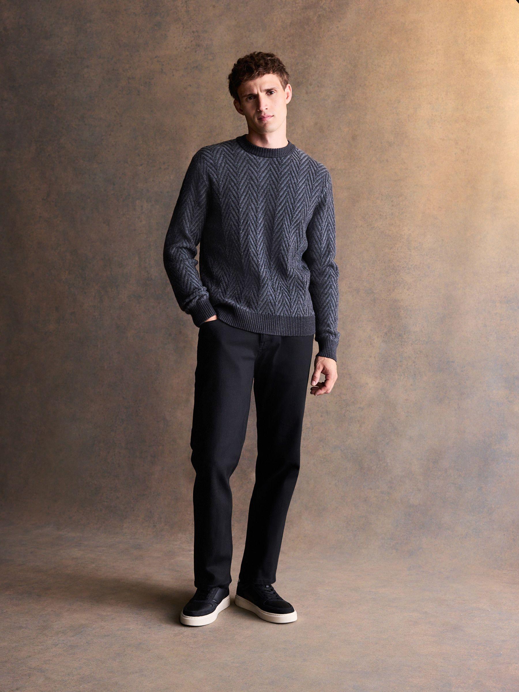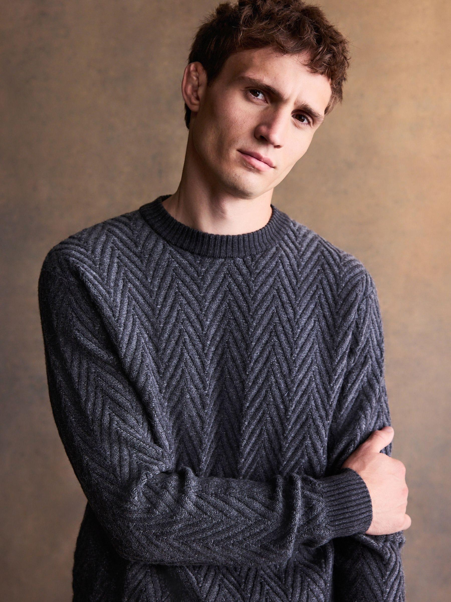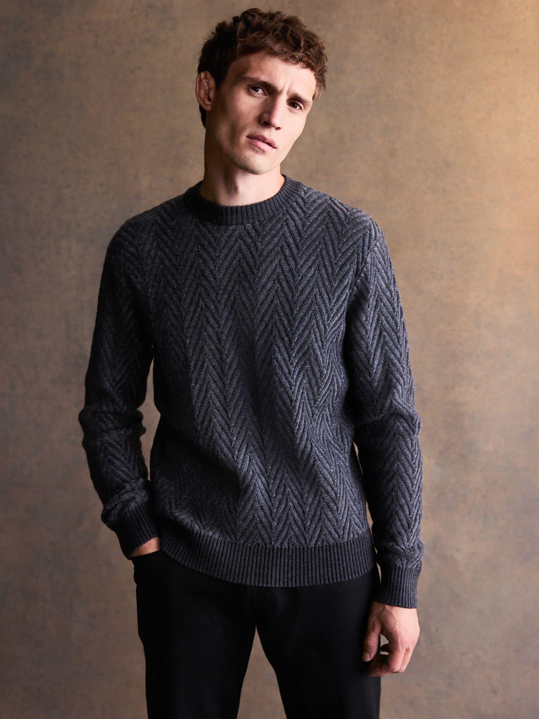 Charcoal Grey Regular Fit Herringbone Pattern Crew Jumper