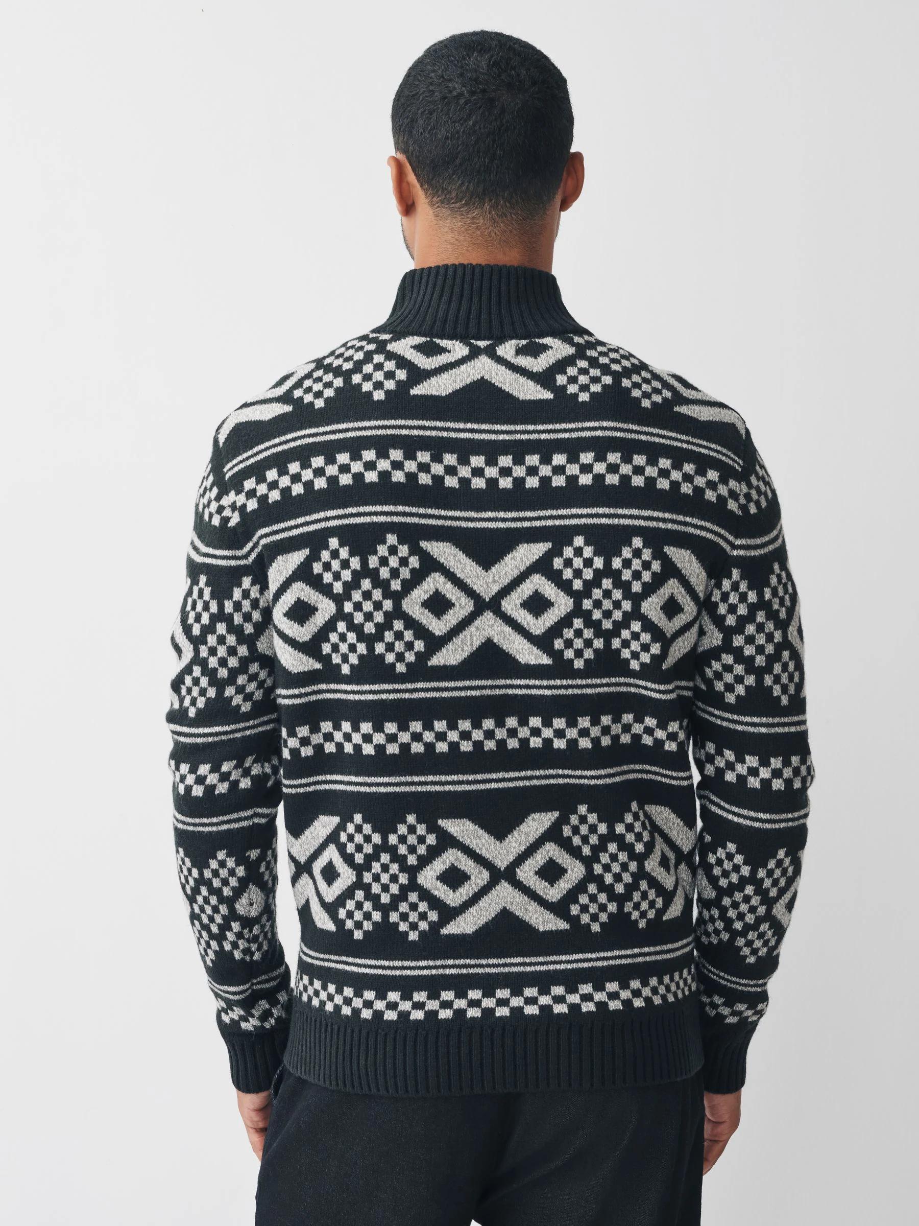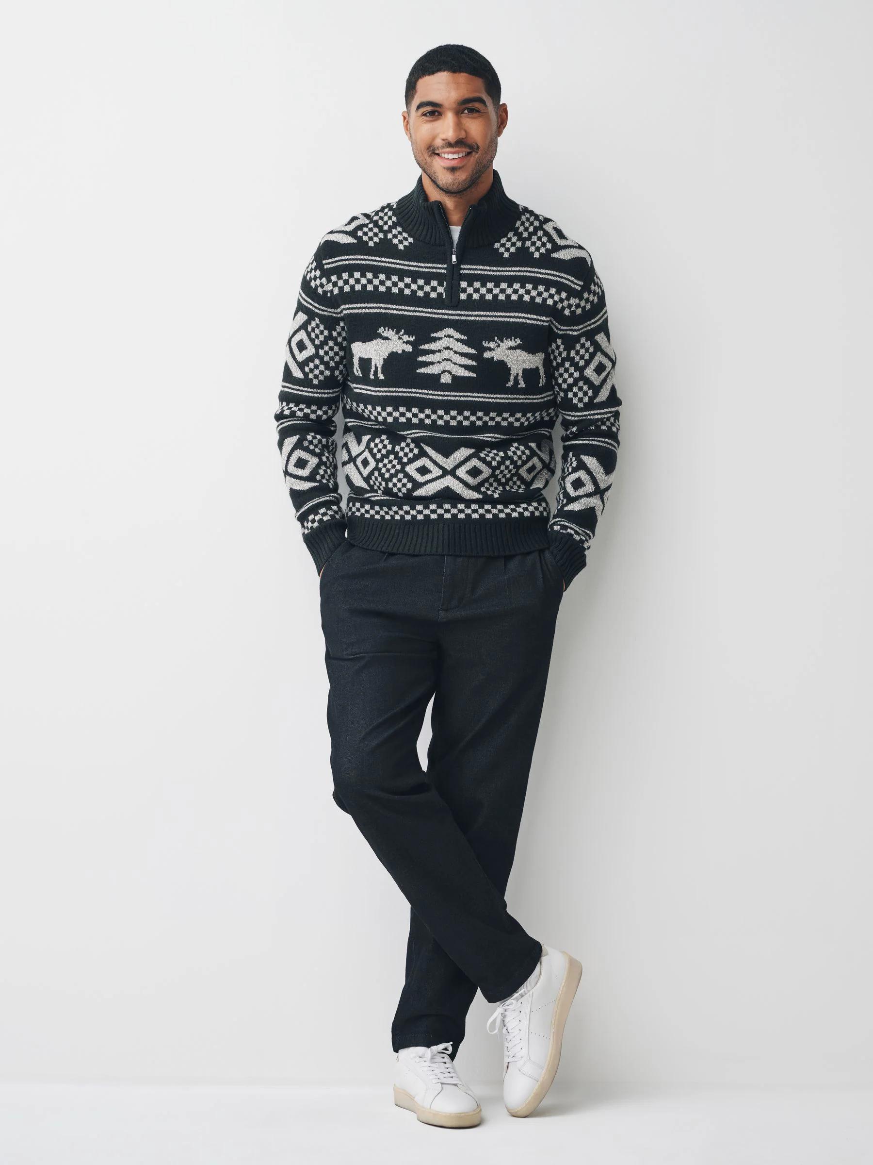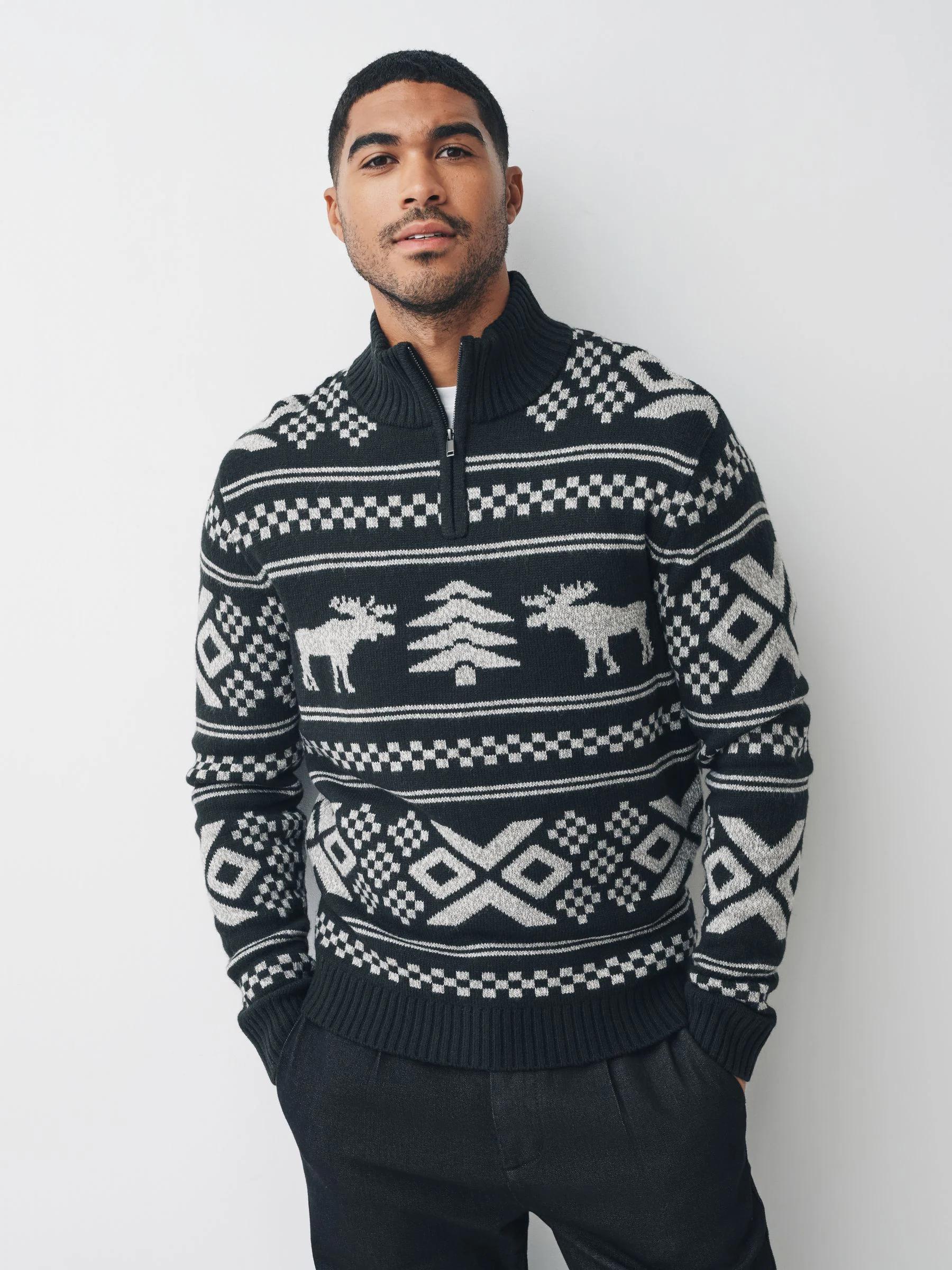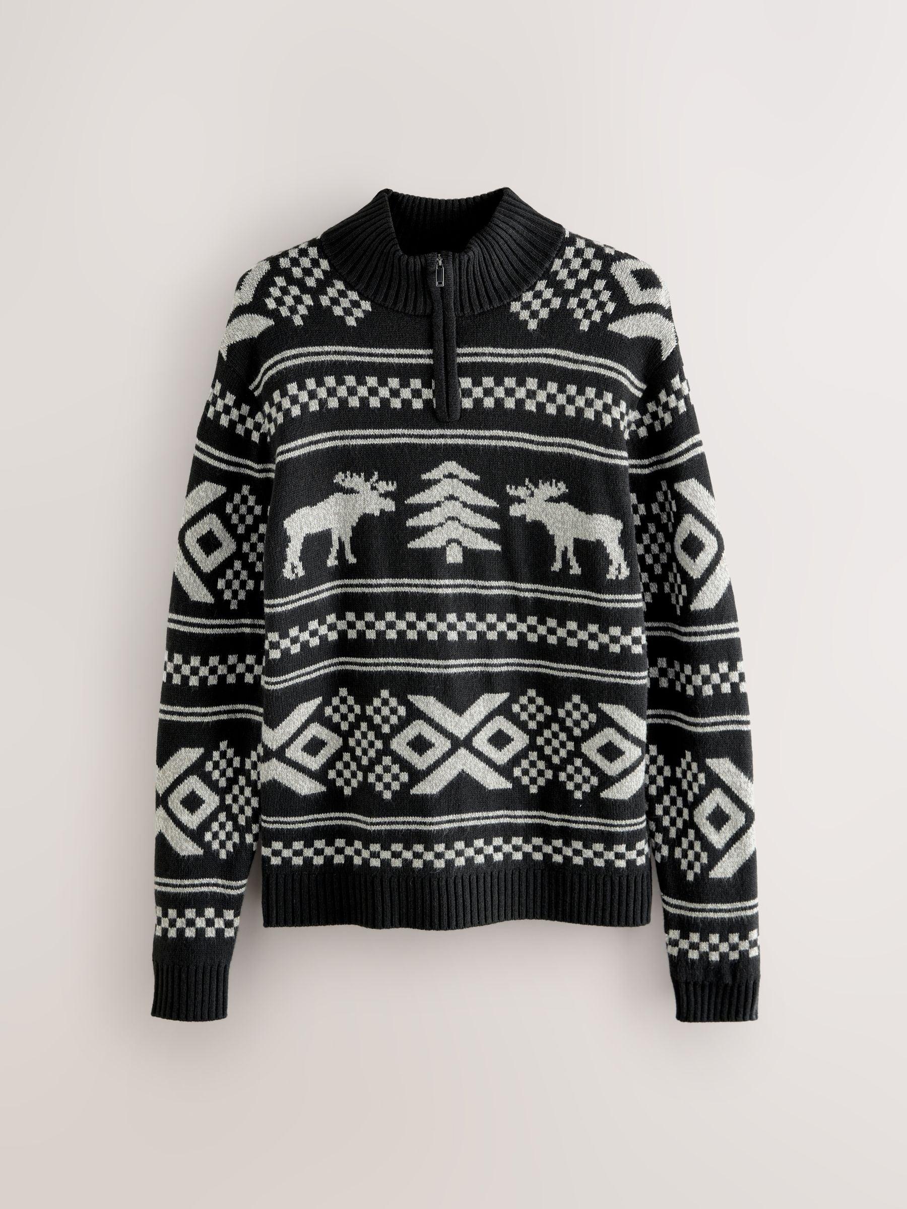 Black/White Christmas Moose Quarter Zip Neck Jumper with Wool