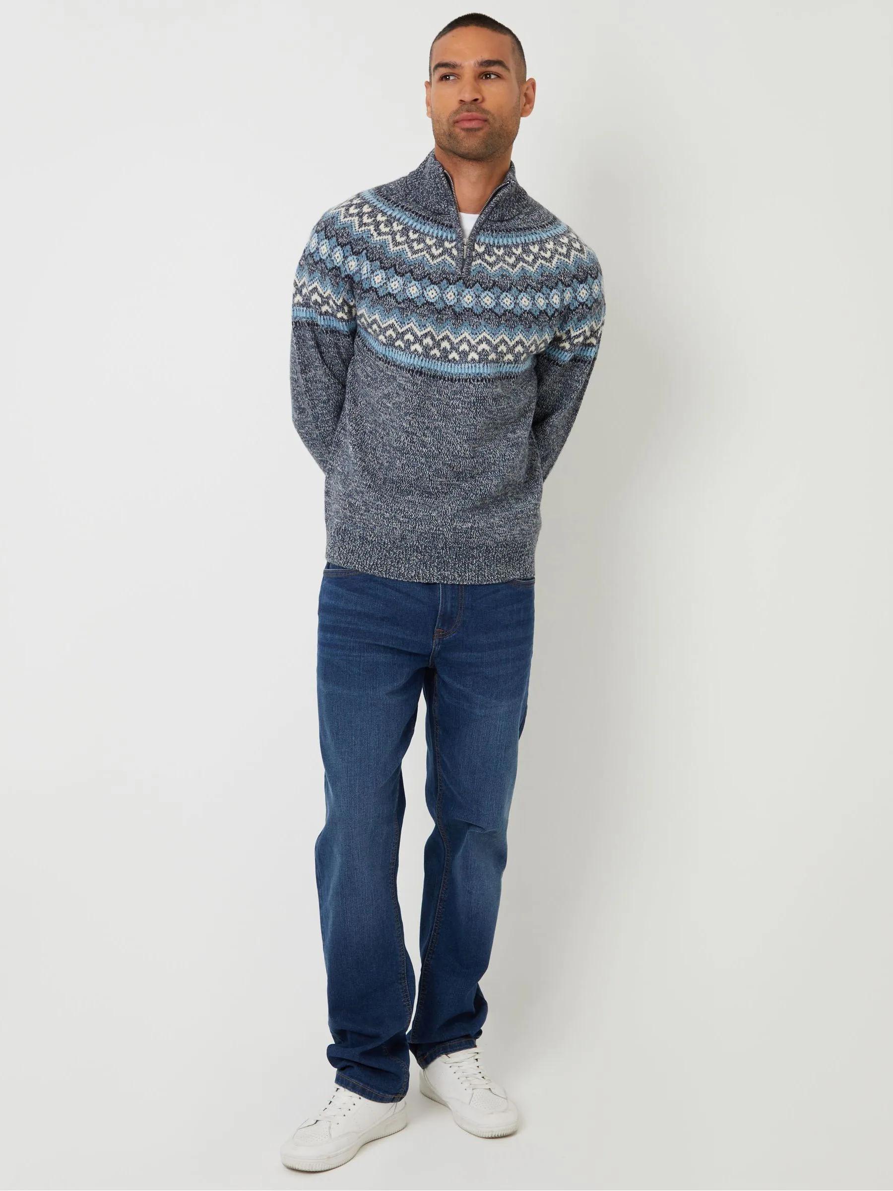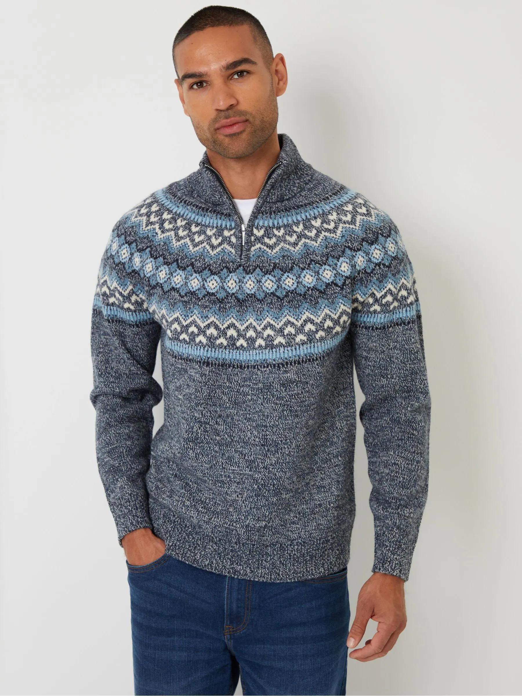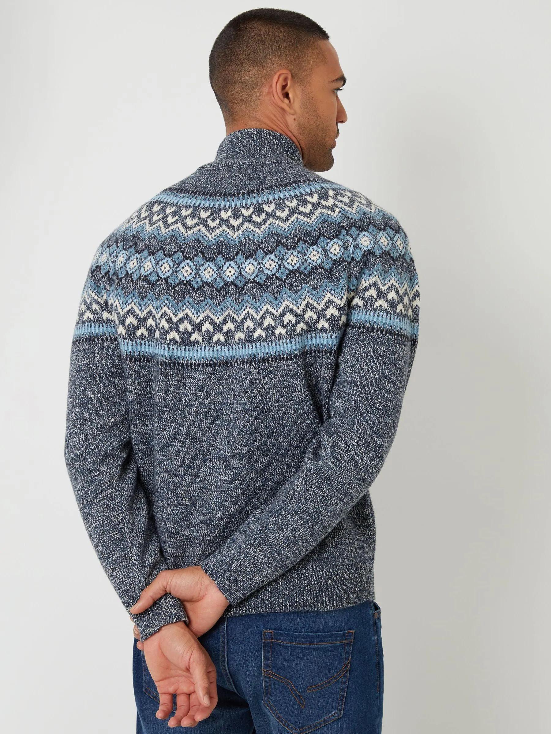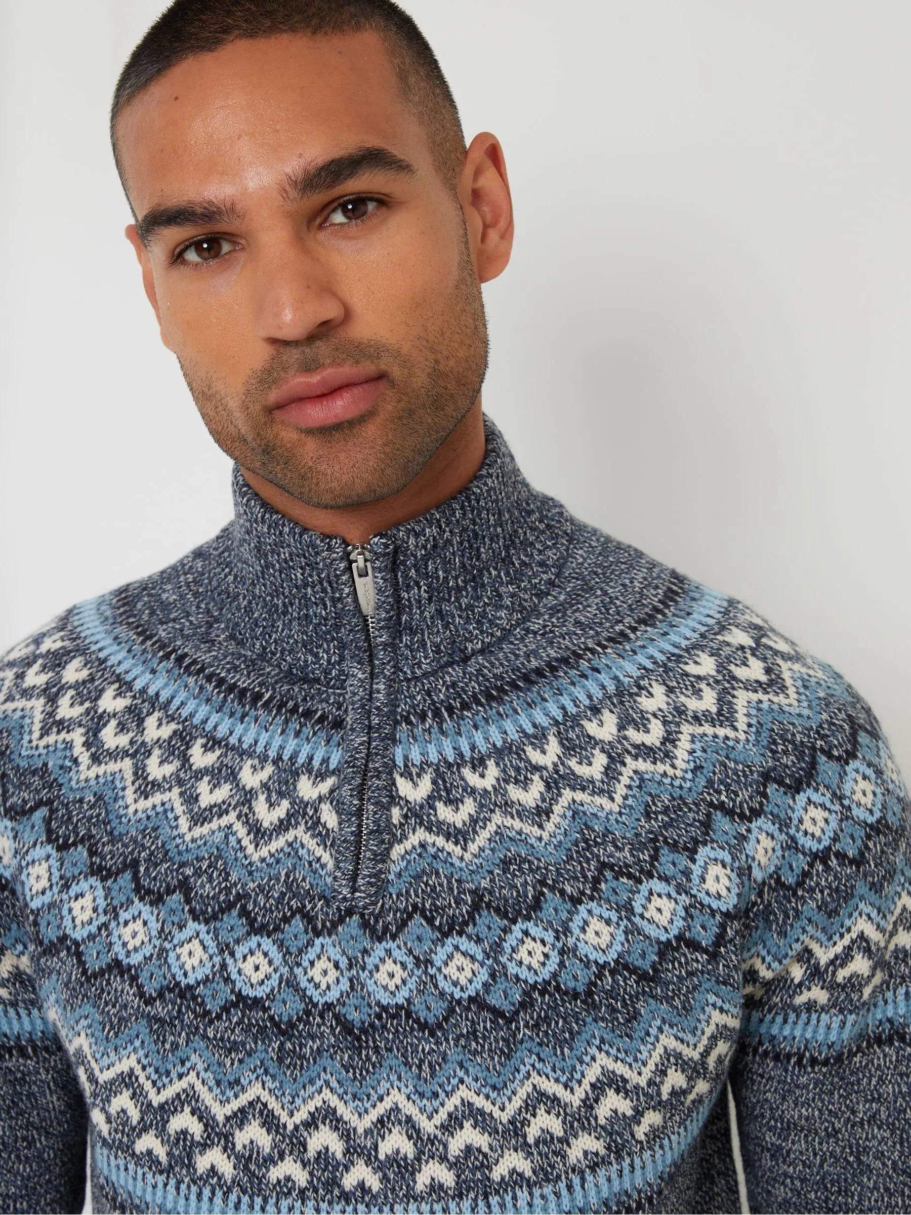 Threadbare Blue Fairisle Knitted Quarter Zip Jumper