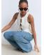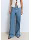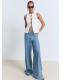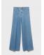Tejido de algodón estilo tejano vaquero. Diseño largo. Diseño wideleg. Tiro alto. Trabillas. Dos bolsillos delanteros. Dos bolsillos en la parte posterior. Cierre de botón y cremallera. Largo interior 82,5 cm. Caña ancha. Dos bolsillos de parche en la parte delantera. Cierre delantero de cremallera y botón. Largo interior 85 cm