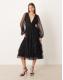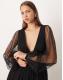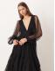 Lace & Beads Bridesmaid Madison deep v sheer bell sleeve tulle midi dress in black