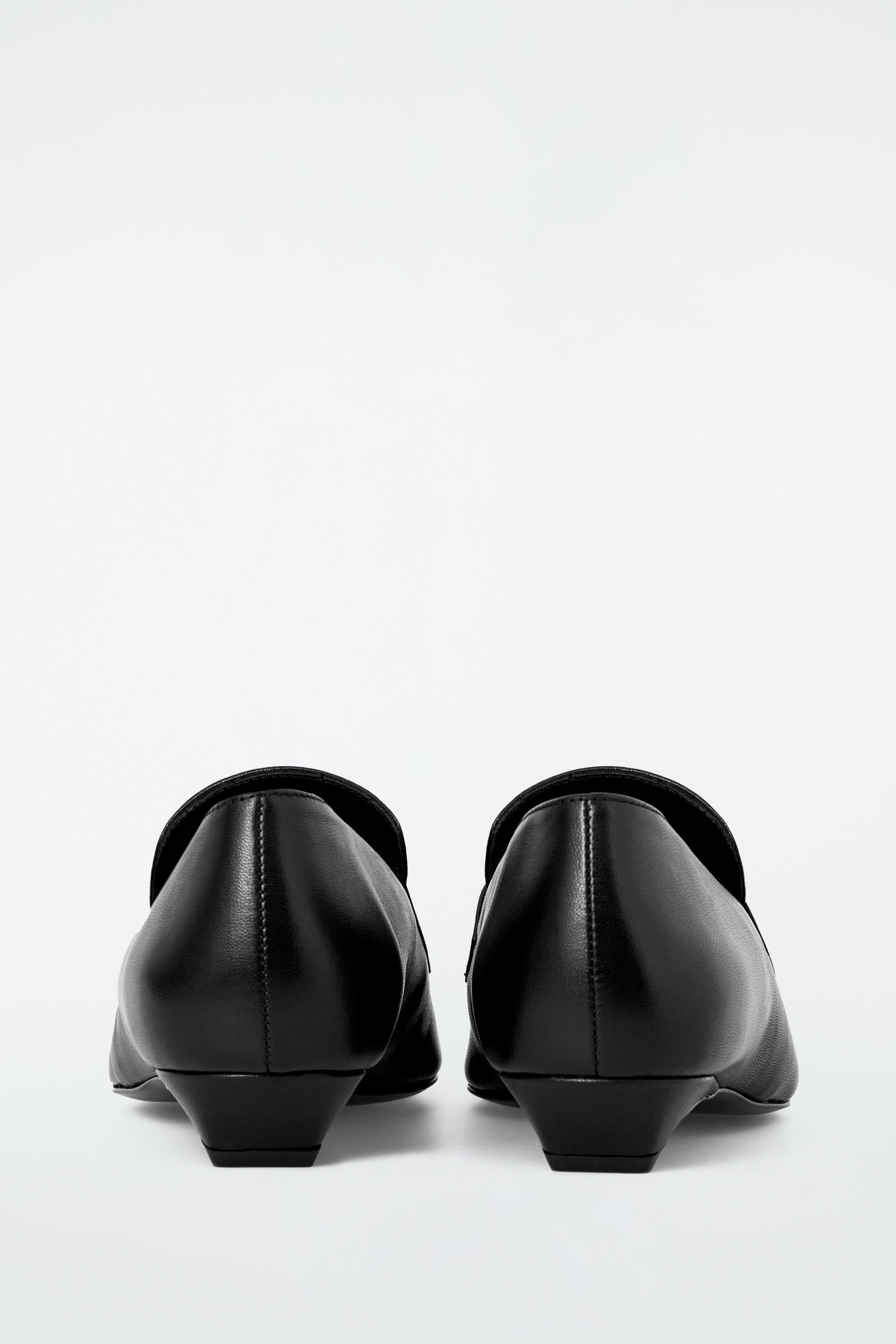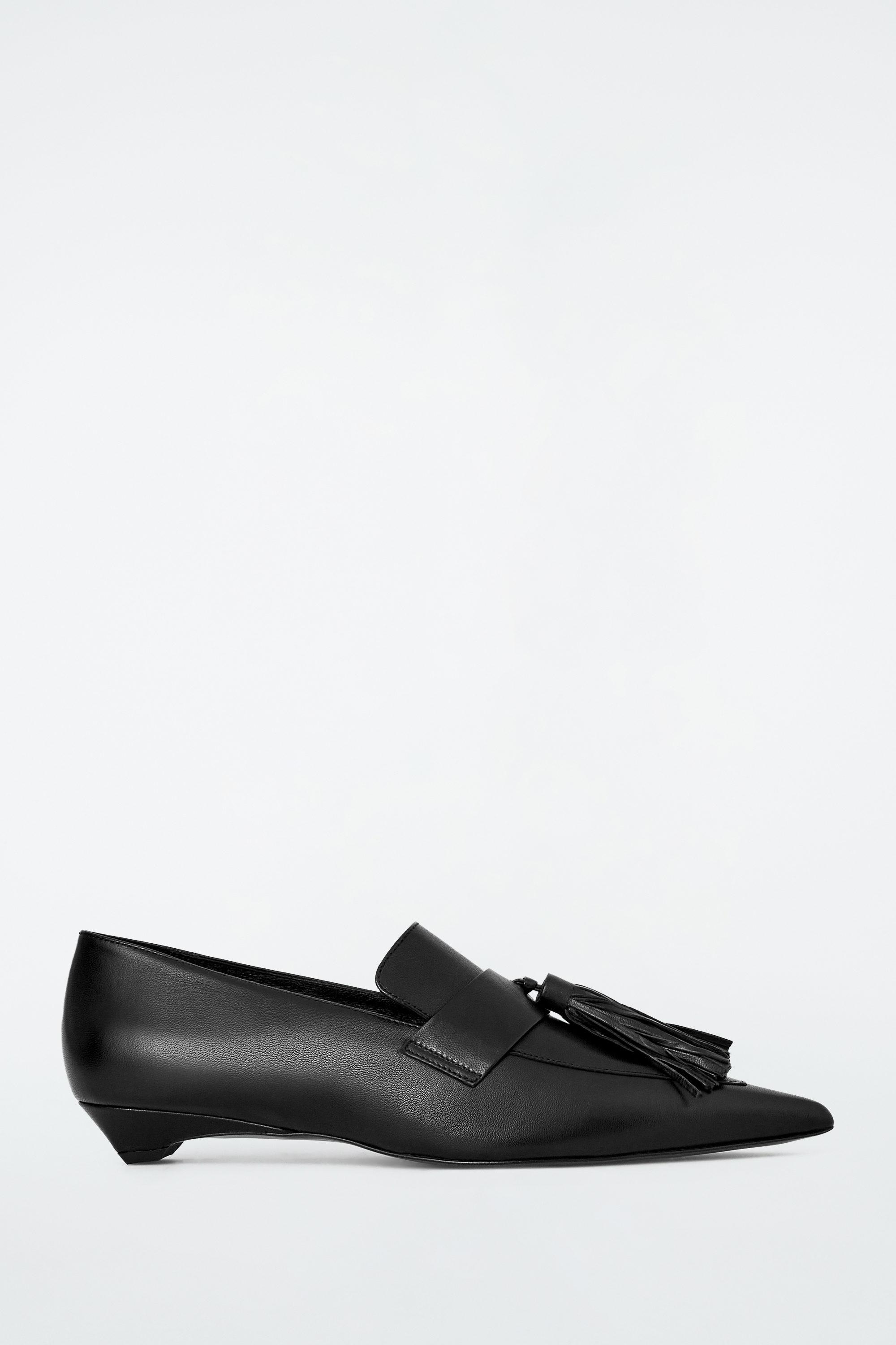 These contemporary shoes are an evolution of the archetypal COS loafers. Crafted from luxuriously soft chrome-free nappa, they are shaped with elongated pointed toes, low kitten heels and tassels at the vamp. They're designed with padded footbeds so they're comfortable to walk in.\u0026nbsp;\u0026nbsp;Rubber solesCOS supports responsible manufacturing via the Leather Working Group\u0026nbsp;Upper \u0026amp; lining: 100% Leather. Heel: 100% Thermoplastic rubber. Excluding trims