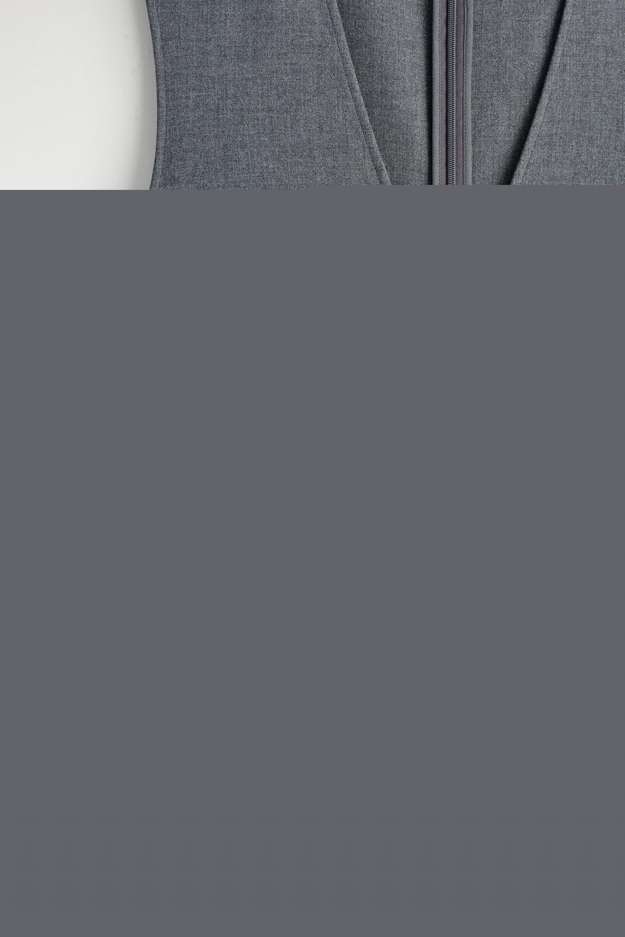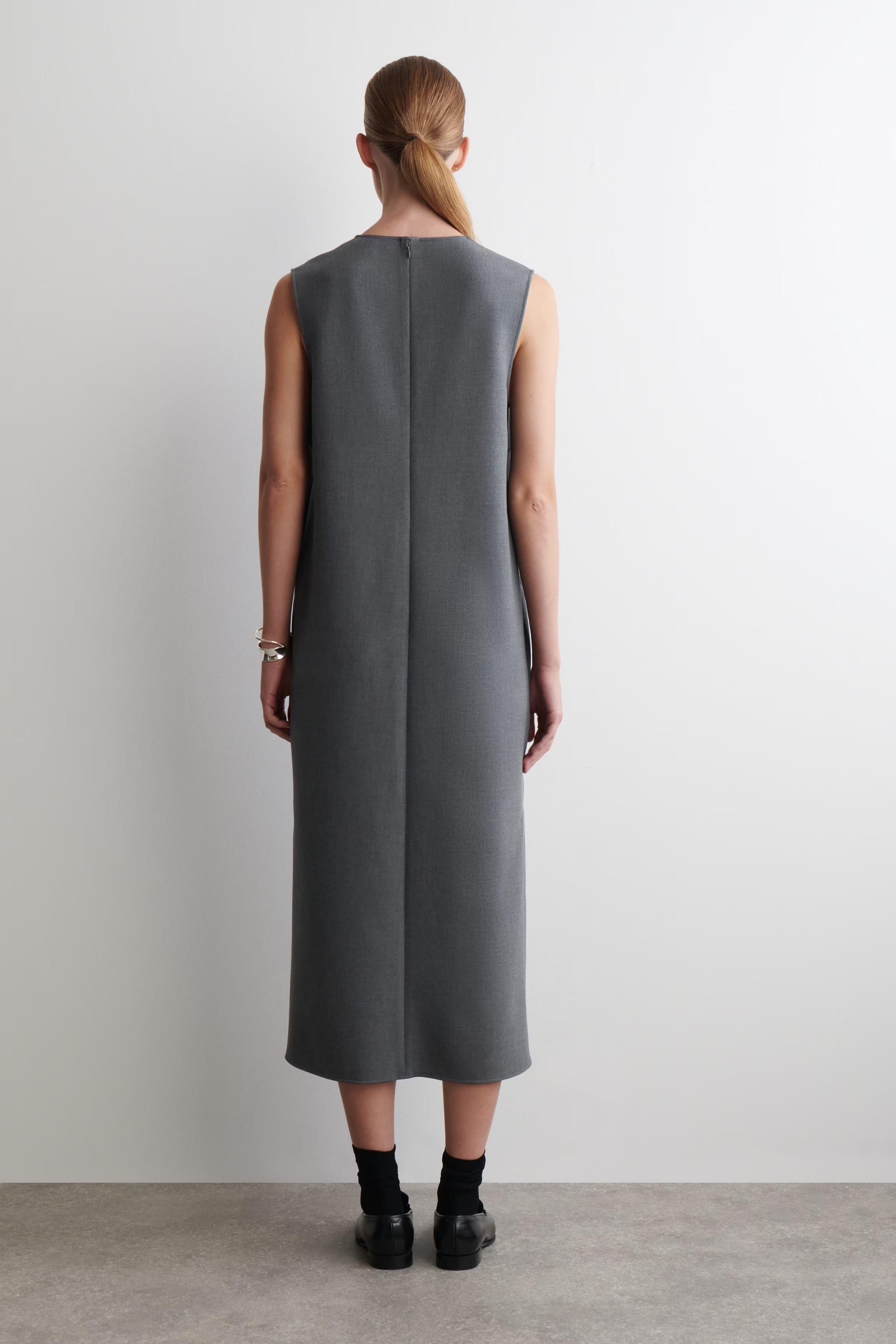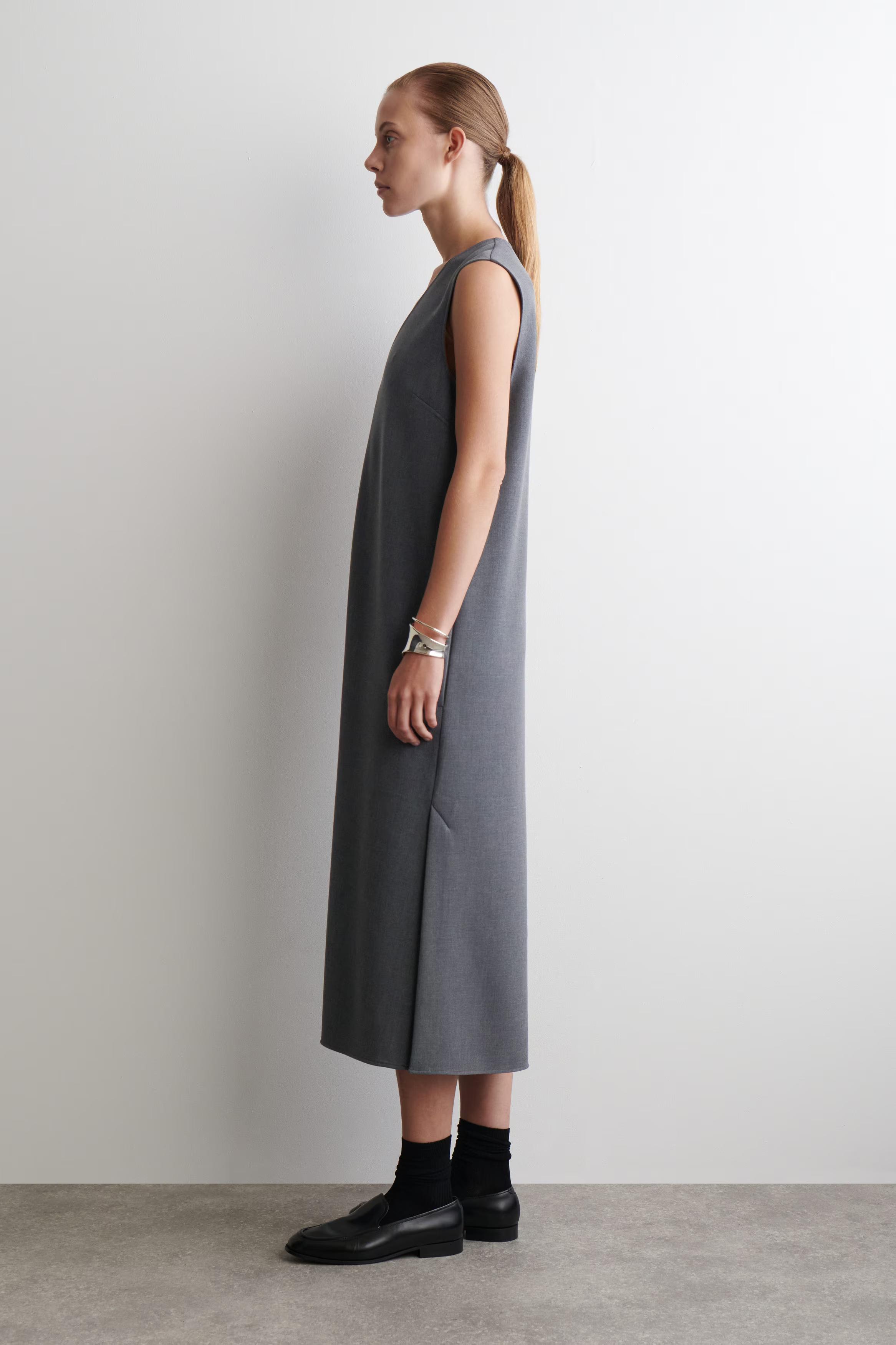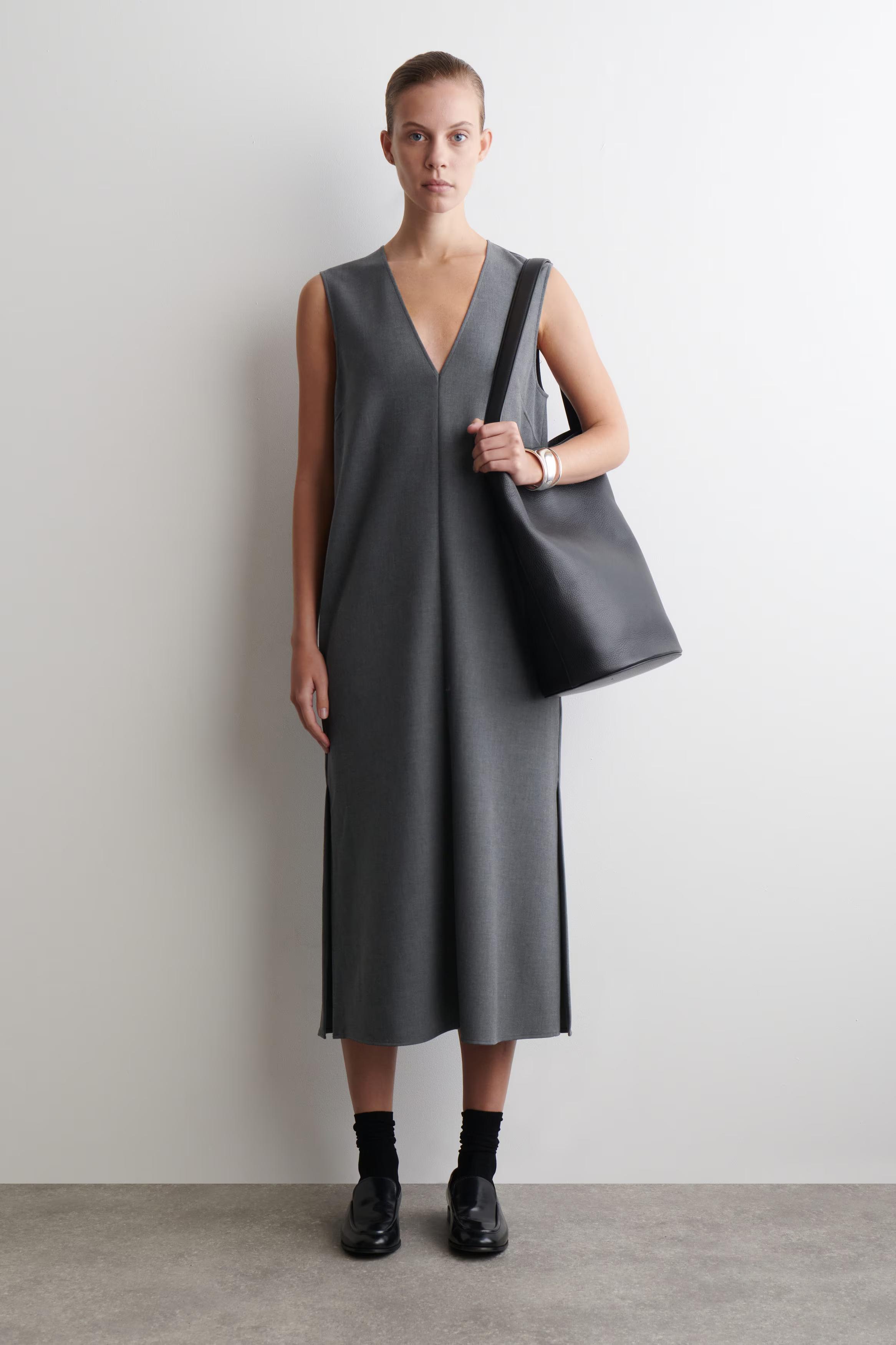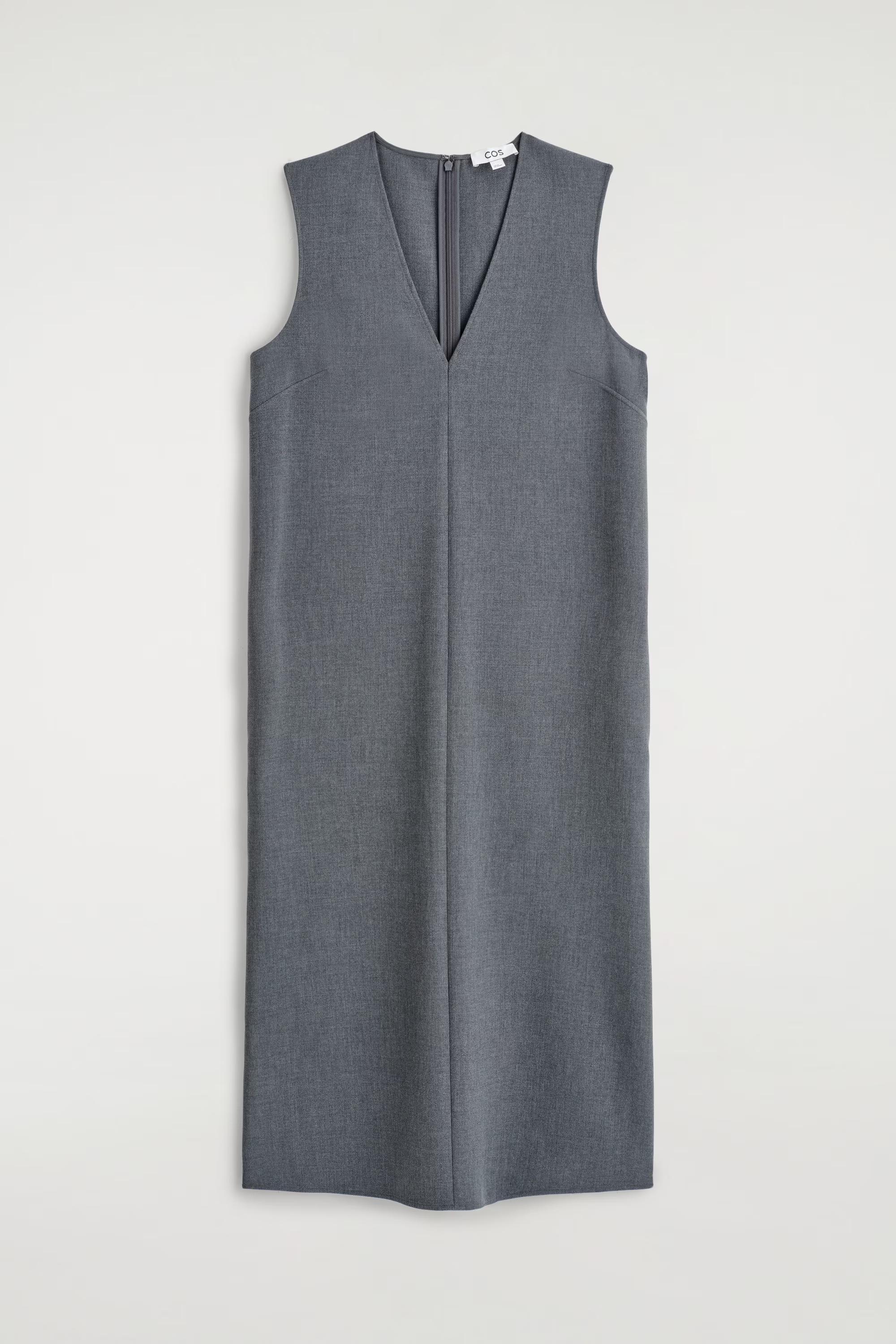 This season, the womenswear team reframe the classics with a modern sensibility. Rendered in a grey-m\u0026eacute;lange tone, this sophisticated midi dress is cut in a streamlined silhouette and designed with a V-neckline and a split hem. Play with proportions by layering it over the coordinating trousers.\u0026nbsp;Regular fitHook-and-bar and zip closureRecycled polyester is polyester made from PET bottles or end-of-life textile waste. The PET bottles or textile waste is mechanically recycled and processed into new yarn\u0026nbsp;Shell: 61% Recycled polyester, 33% ECOVERO\u0026trade; Viscose, 6% Elastane. Pocket lining: Excluding trims / Machine wash\u0026nbsp;Back length of size EU 36 is 66cm / Model wears a size EU 36