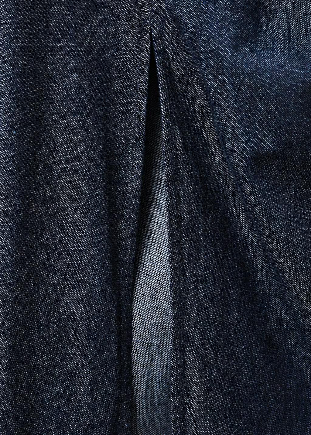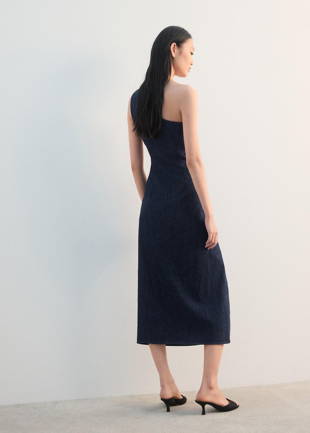 Tejido de algodón estilo tejano vaquero. Diseño midi. Diseño entallado. Cuello asimétrico. Sin mangas. Panel fruncido. Abertura lateral en el bajo. Cierre de cremallera lateral