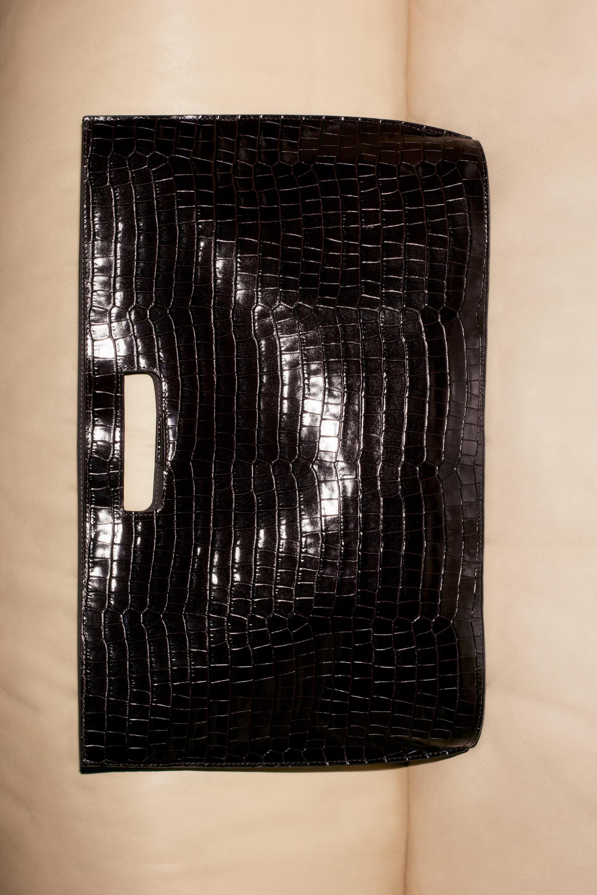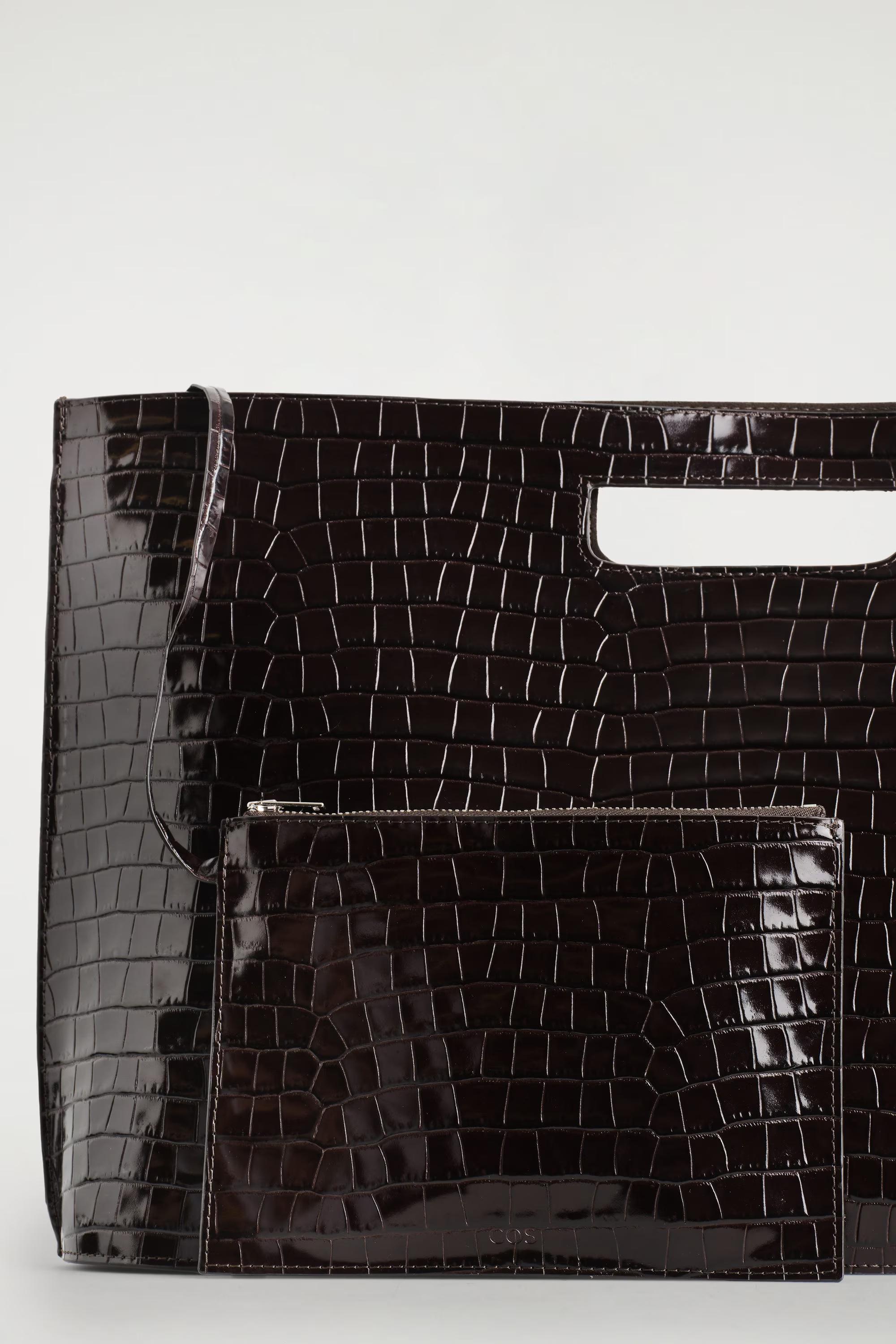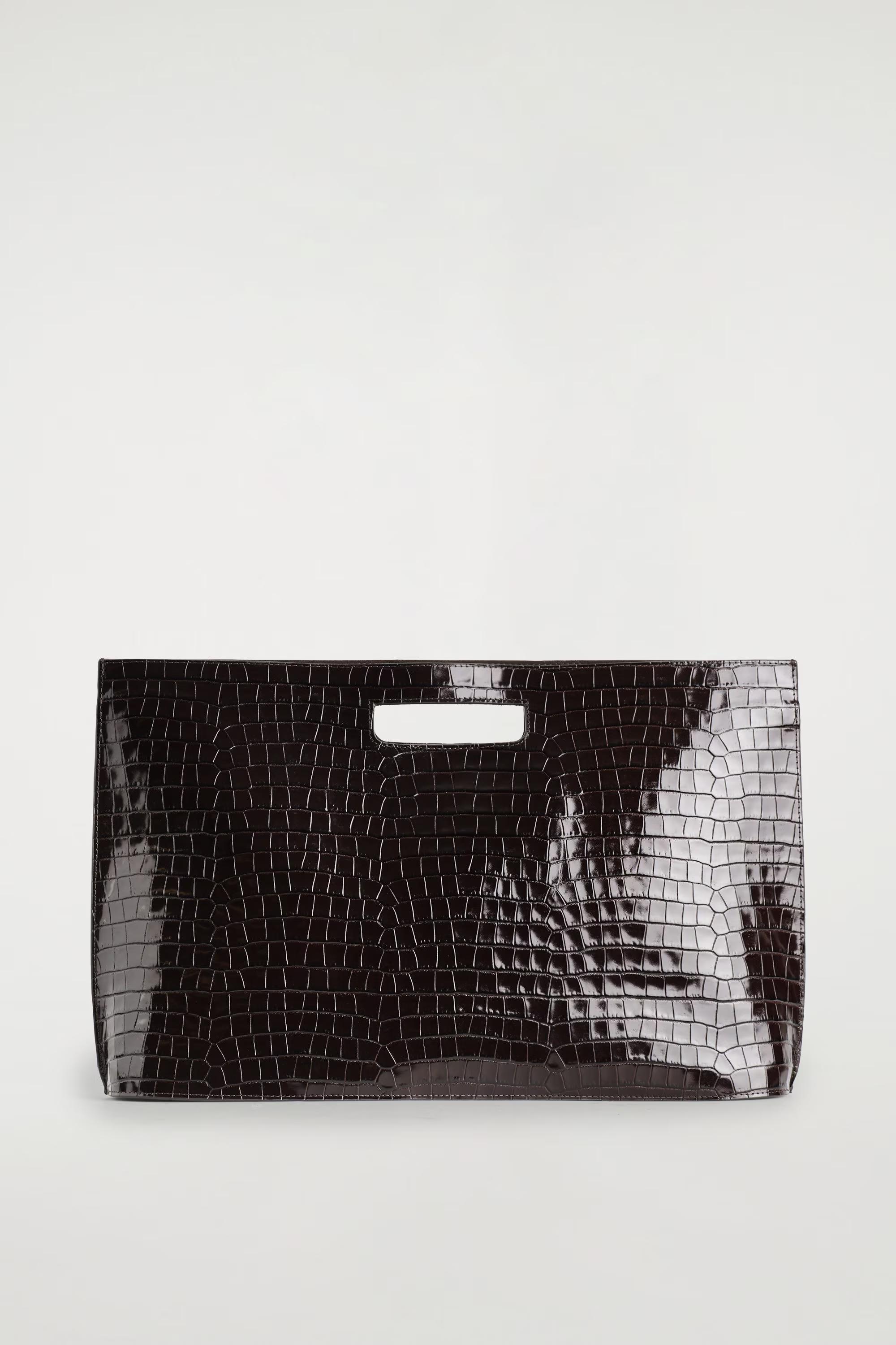 Introducing the Folio bag: revisited from the COS archive, renewed for the upcoming season. This oversized version is crafted from the most supple crocodile-effect leather and retains its distinctive, slim silhouette with angular sides and an oval-shaped base. Style it across the body or carry it by the cutout handle.\u0026nbsp;Magnetic closureDetachable crossbody strapCOS supports responsible manufacturing via the Leather Working Group\u0026nbsp;Shell and lining: 100% Leather. Excluding trims\u0026nbsp;Height: 30cm, Width: 46cm, Depth: 10.5cm