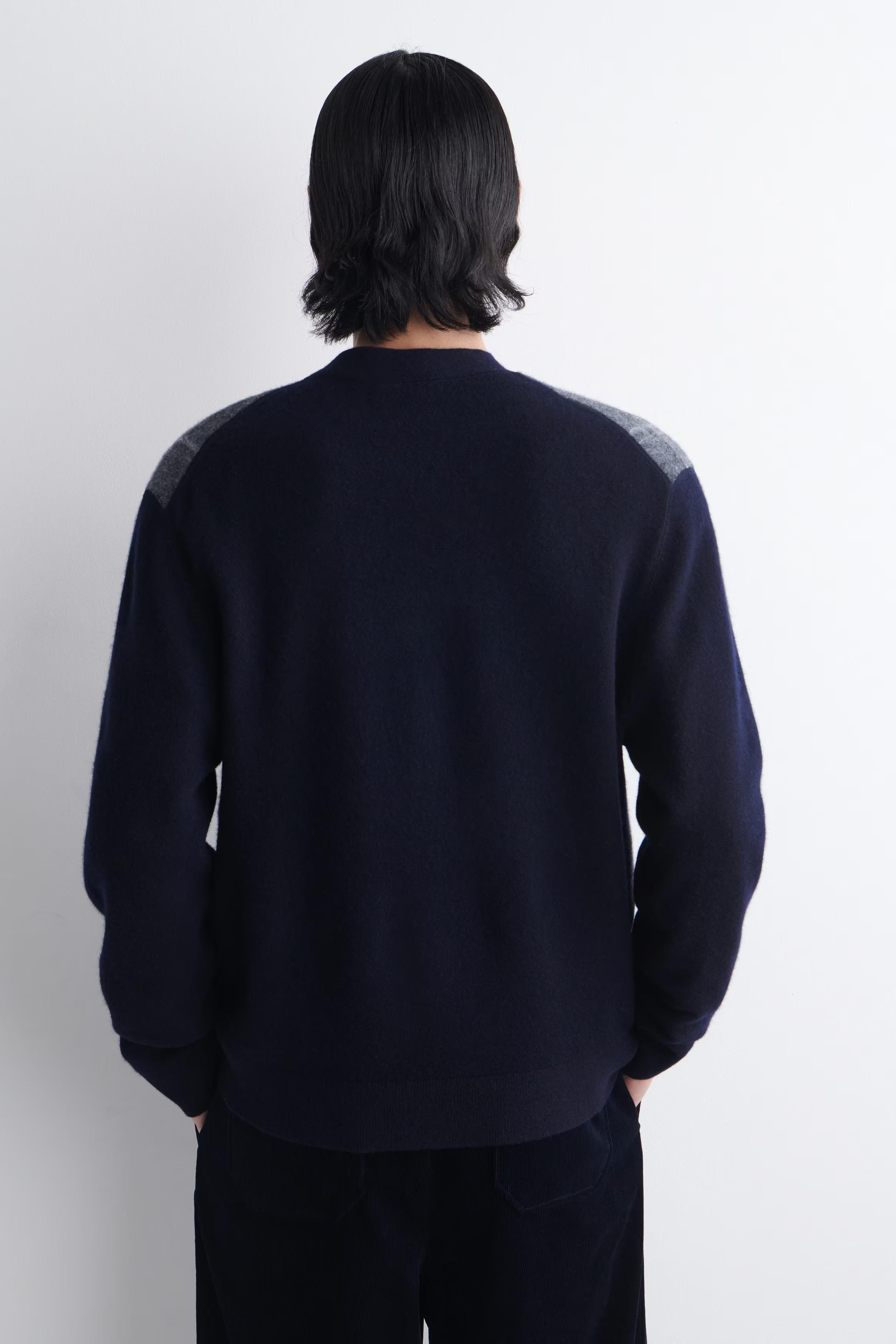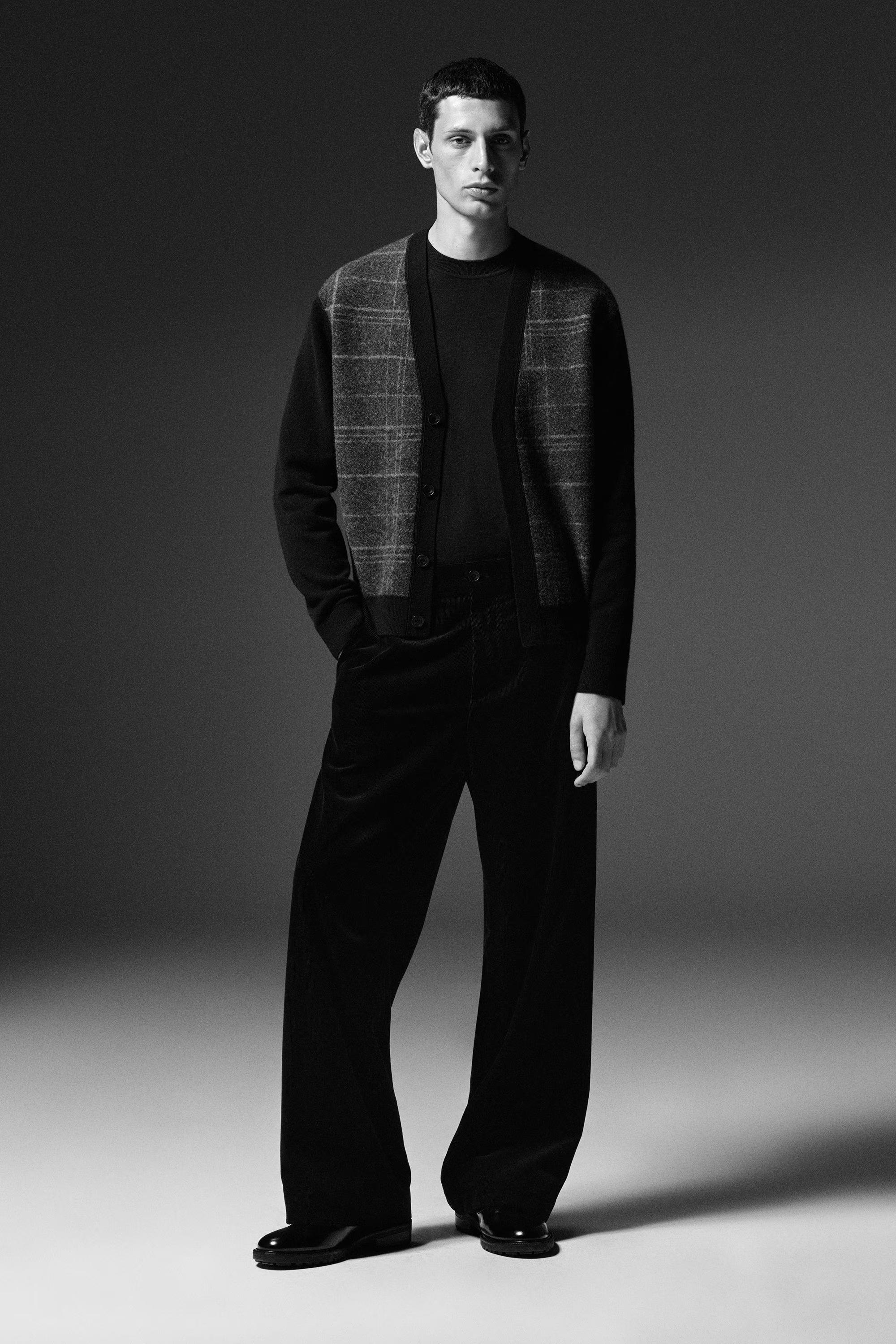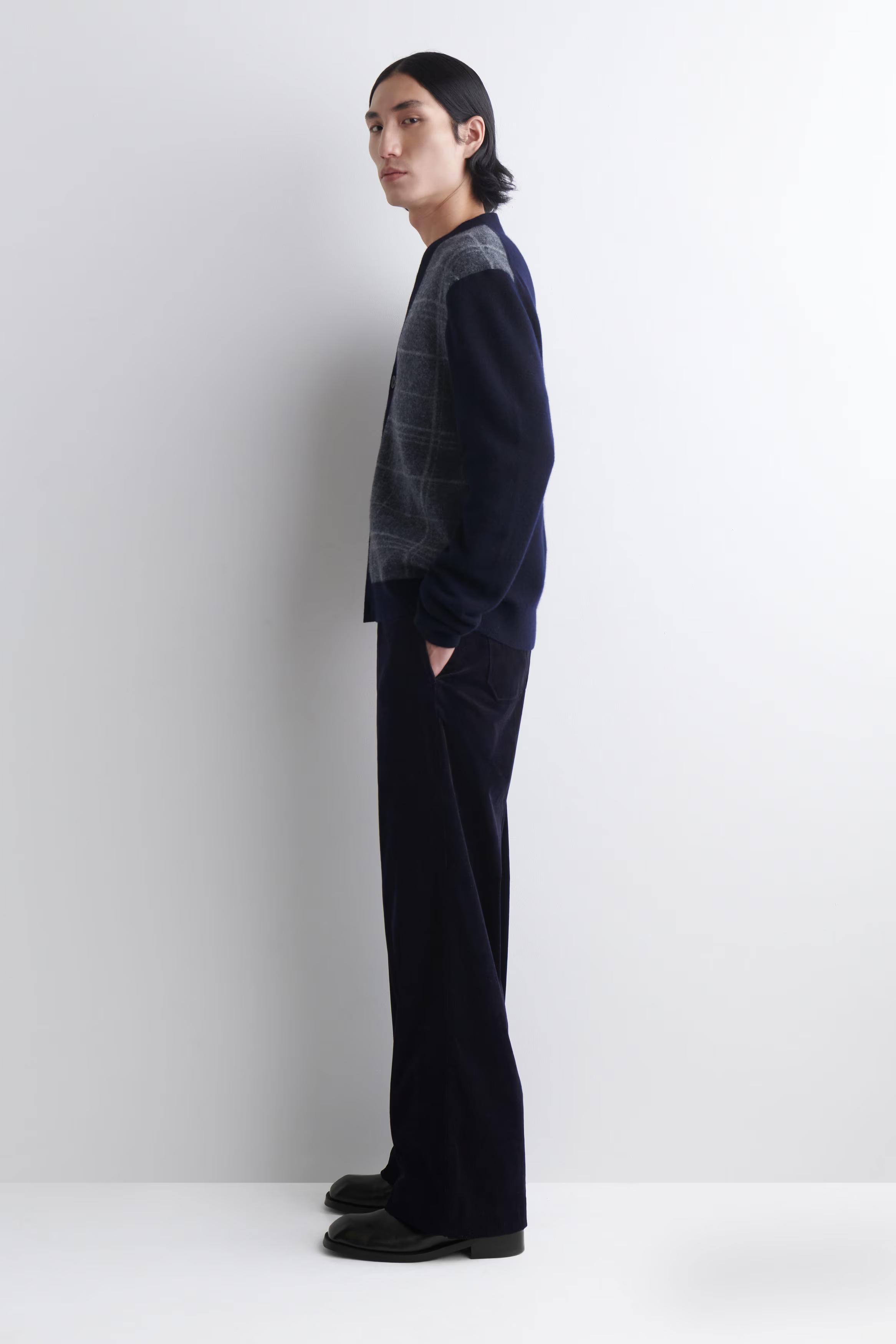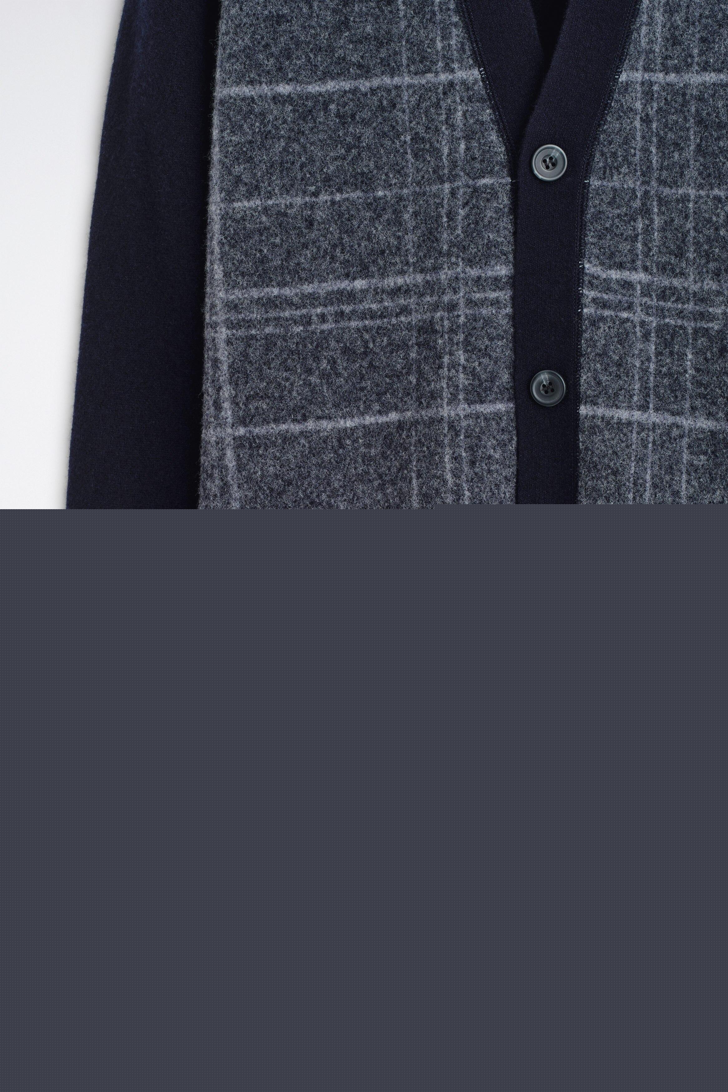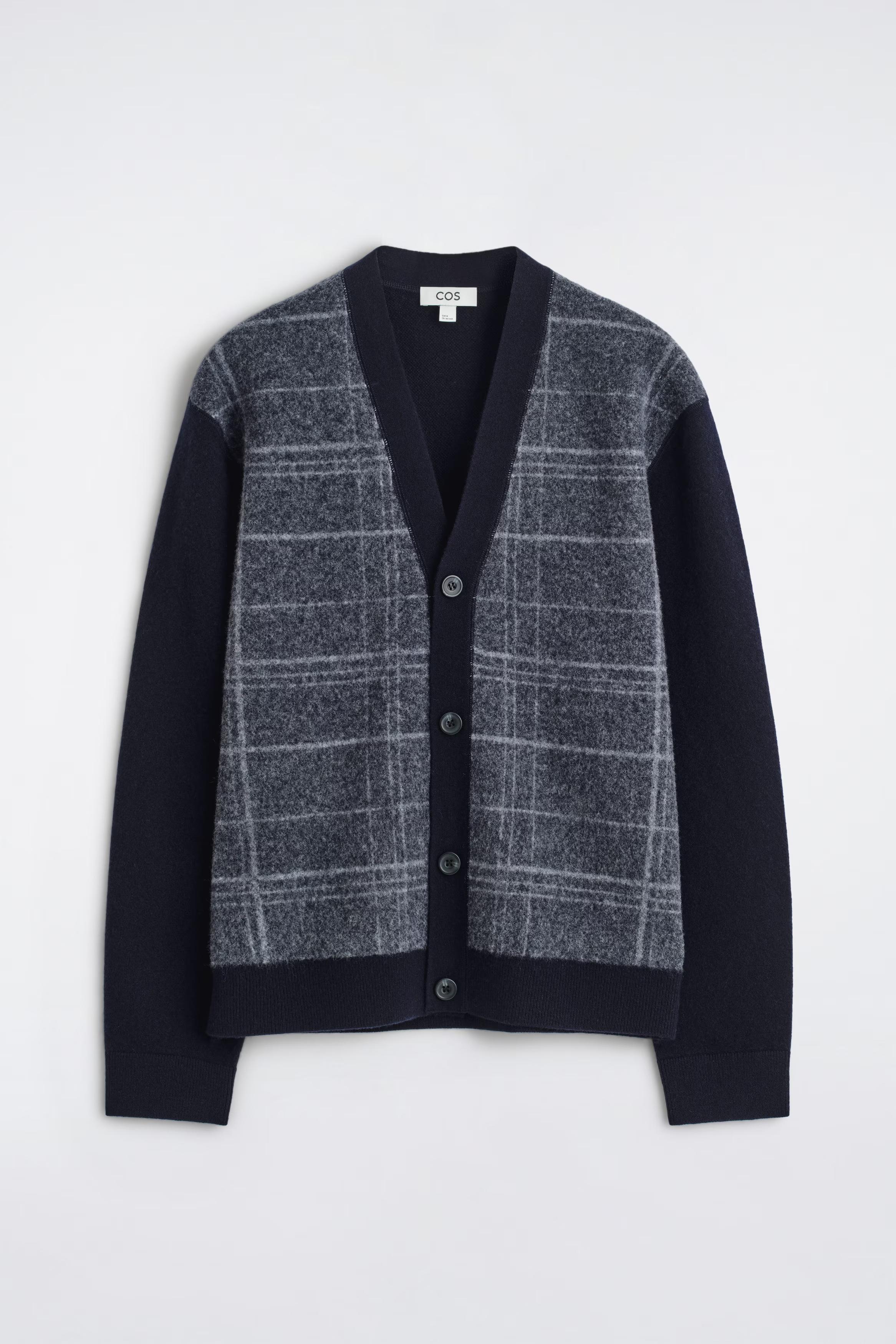 This season, the menswear team reimagine heritage knitwear through a dinstinctly COS lens. This modern piece is knitted from premium wool and designed with jacquard-check panels on the front that tie into the tonal-navy palette. Style it with tailoring and loafers.\u0026nbsp;Relaxed fitButton closureThis product contains Responsible Wool Standard TE-00047206 (RWS) wool fibre from farms certified to animal welfare and land-management requirements\u0026nbsp;Shell: 100% RWS Wool. Excluding trims / Dry clean\u0026nbsp;Back length of size M is 64cm / Model wears a size M