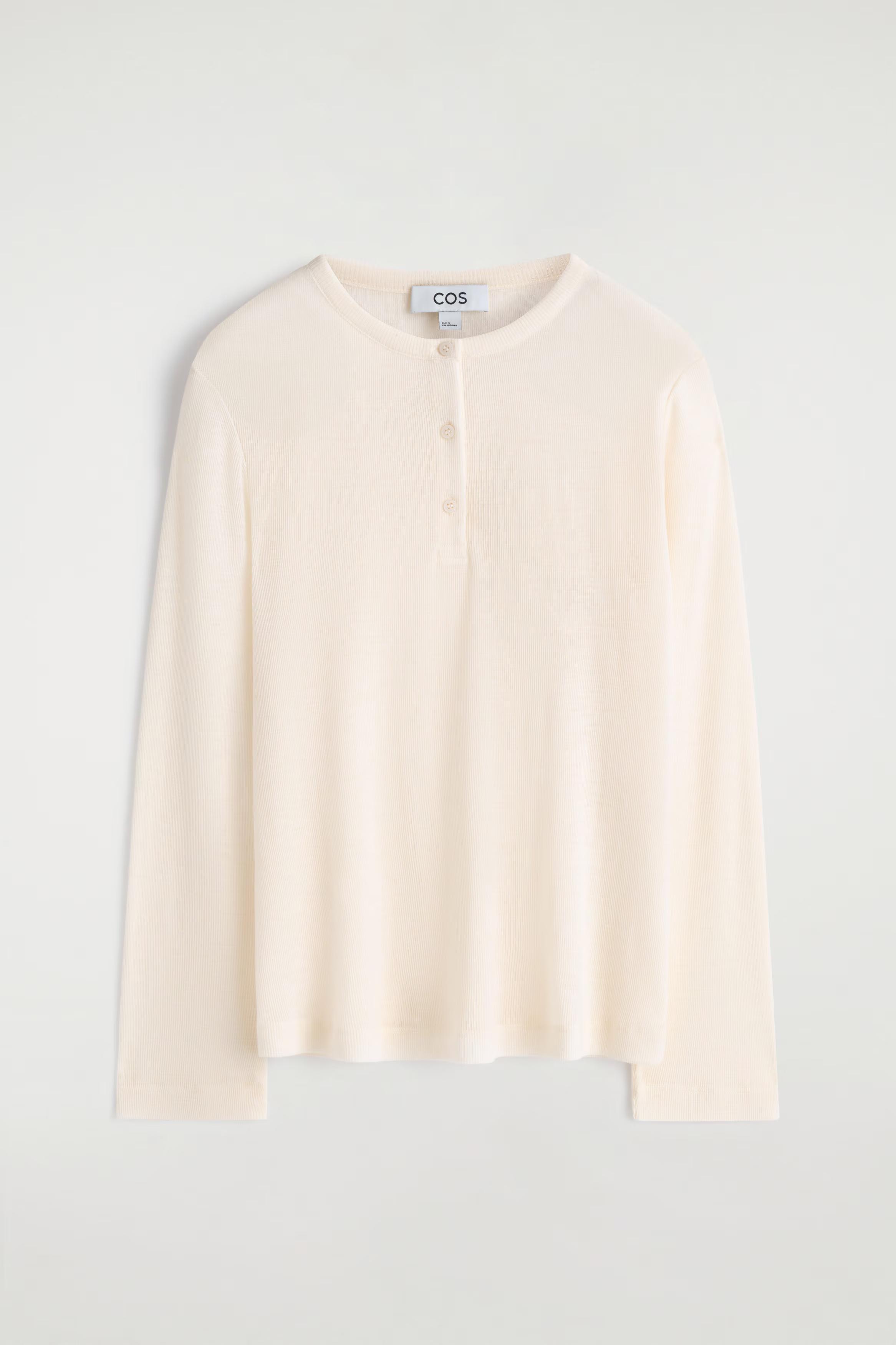 Perfected staples are the foundation of a well-curated wardrobe. Rendered in classic ivory, this Henley top is rib-knitted from ultra-soft merino wool and designed with a rounded neckline, long sleeves and a row of buttons. It lends itself to intentional layering.\u0026nbsp;Regular fitButton closureMachine wash\u0026nbsp;Back length of size S is 56cm / Model wears a size S