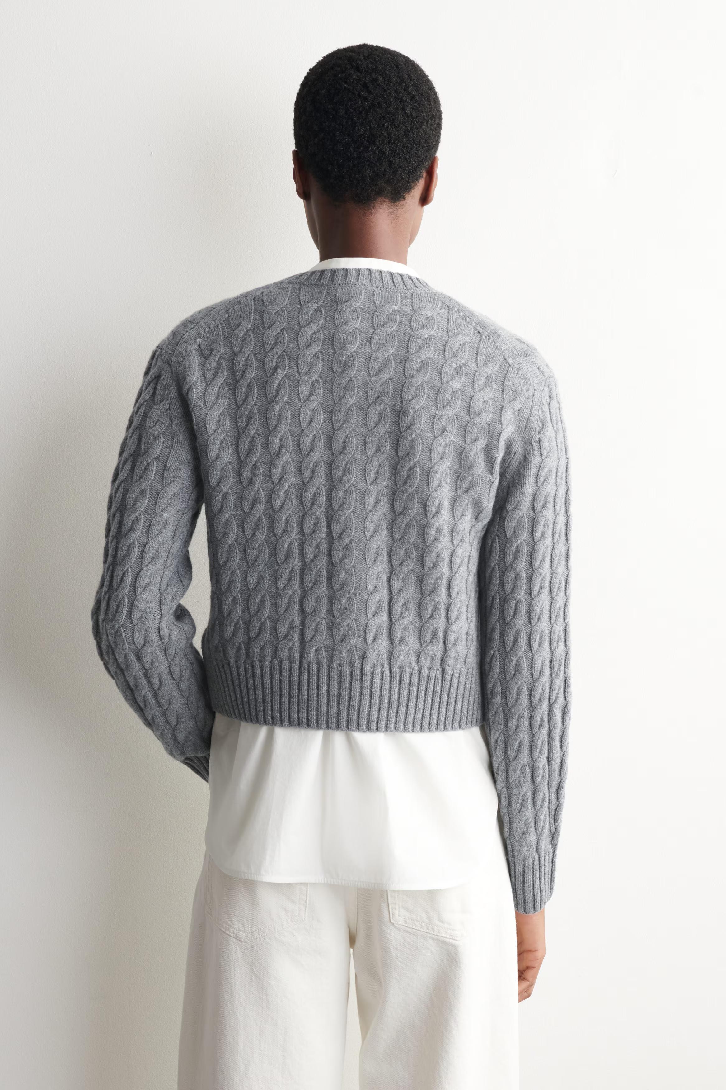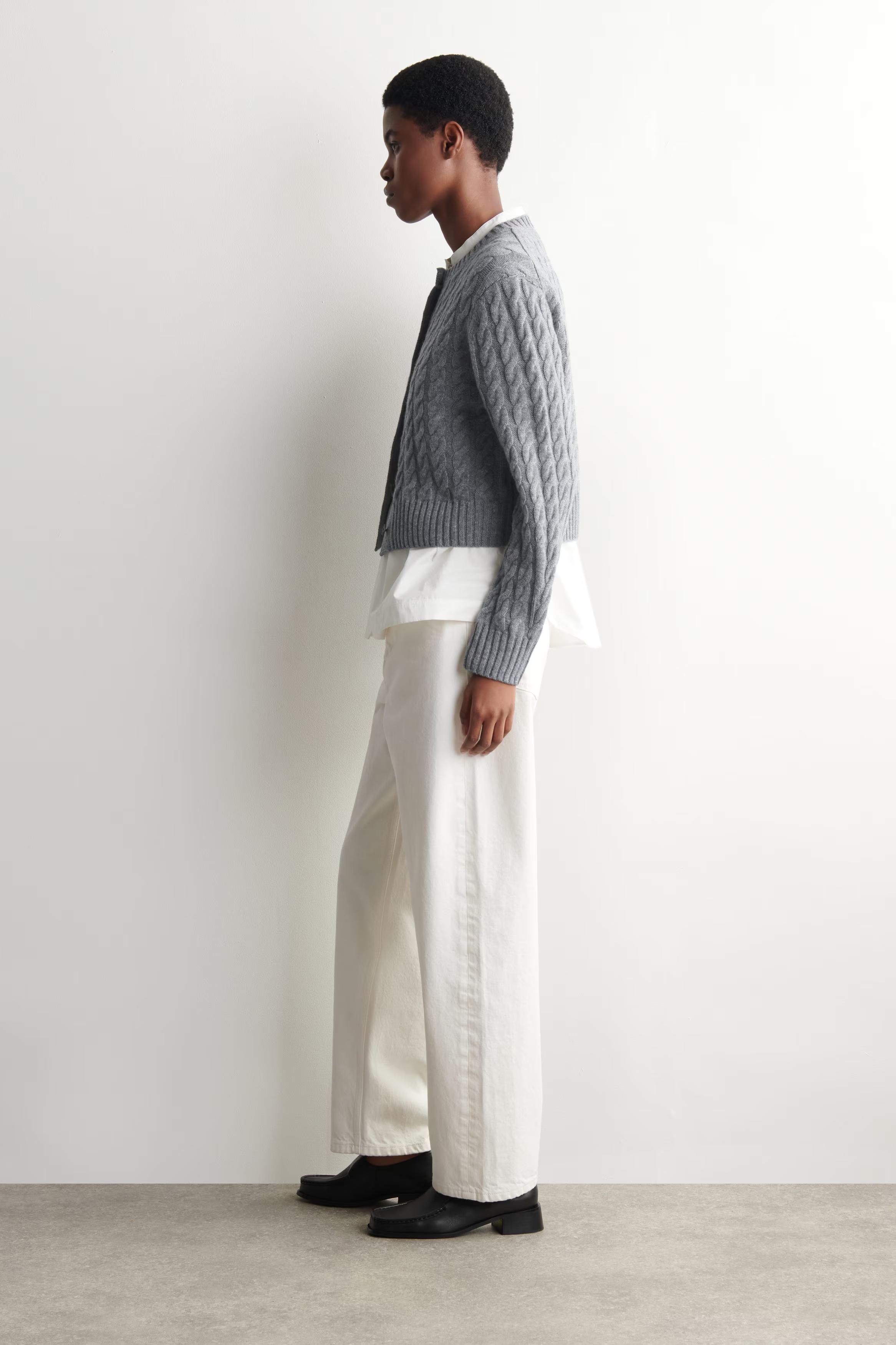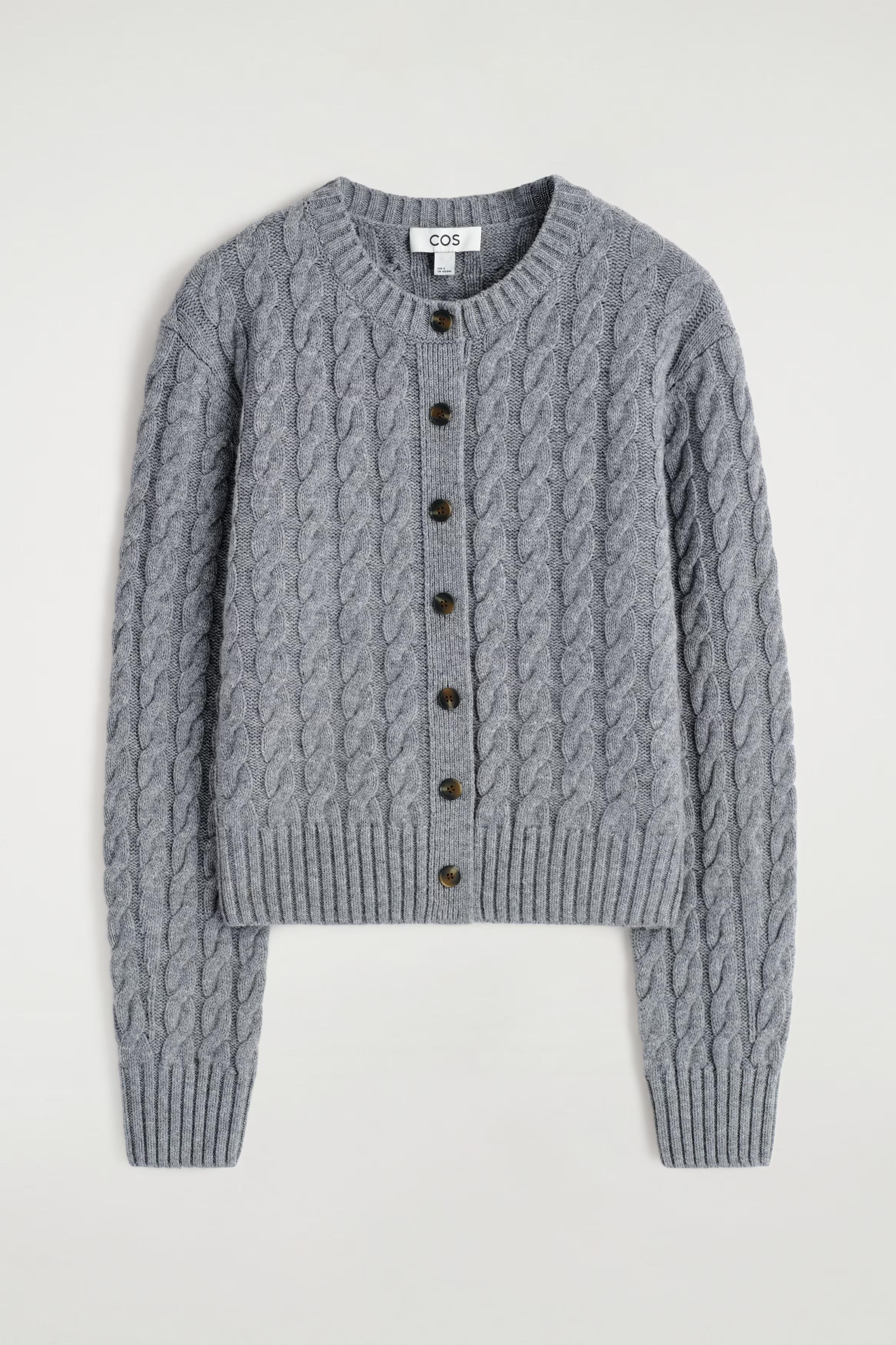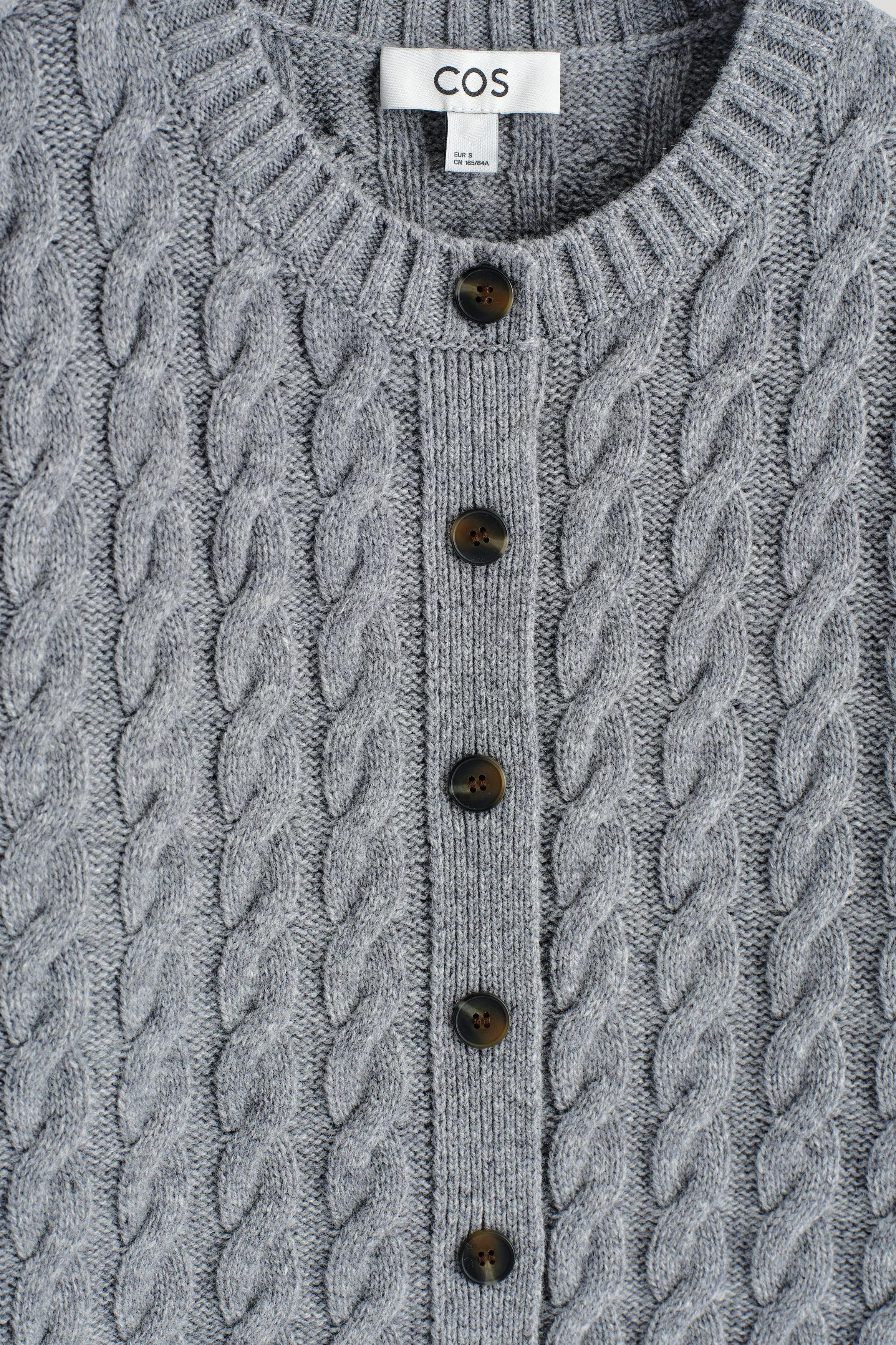Heritage-inspired knitwear remains a pillar of the COS collection. This cardigan is crafted from 100% merino wool in a tactile cable stitch, with a rounded neckline and ribbed trims for a quietly refined take on a timeless silhouette.\u0026nbsp;Regular fitButton closureDry clean\u0026nbsp;Back length of size S is 49cm / Model wears a size S