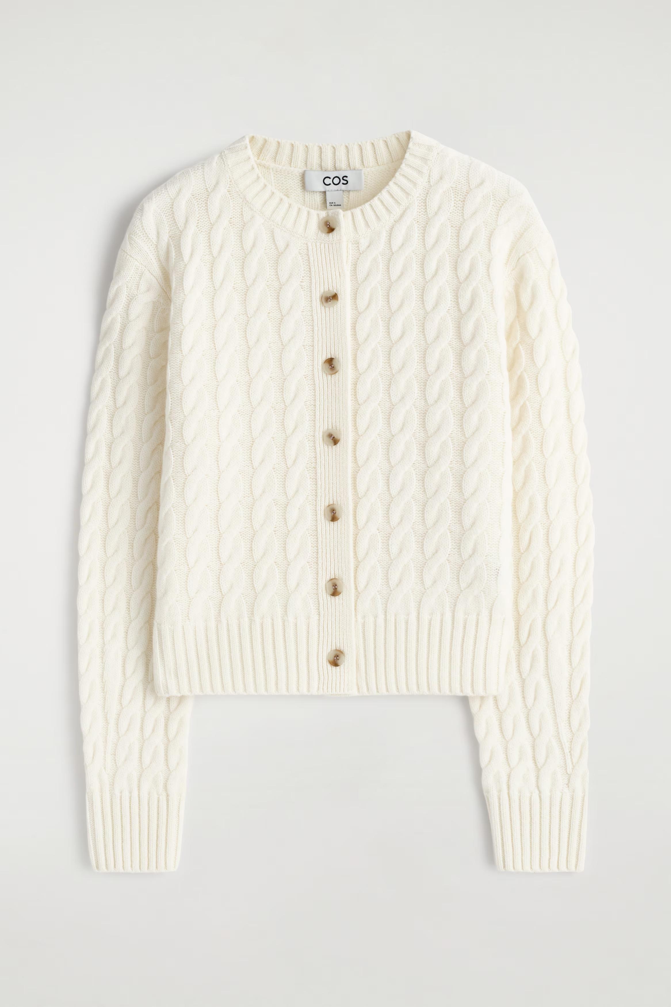 Heritage-inspired knitwear remains a pillar of the COS collection. This cardigan is crafted from 100% merino wool in a tactile cable stitch, with a rounded neckline and ribbed trims for a quietly refined take on a timeless silhouette.\u0026nbsp;Regular fitButton closureDry clean\u0026nbsp;Back length of size S is 49cm / Model wears a size S