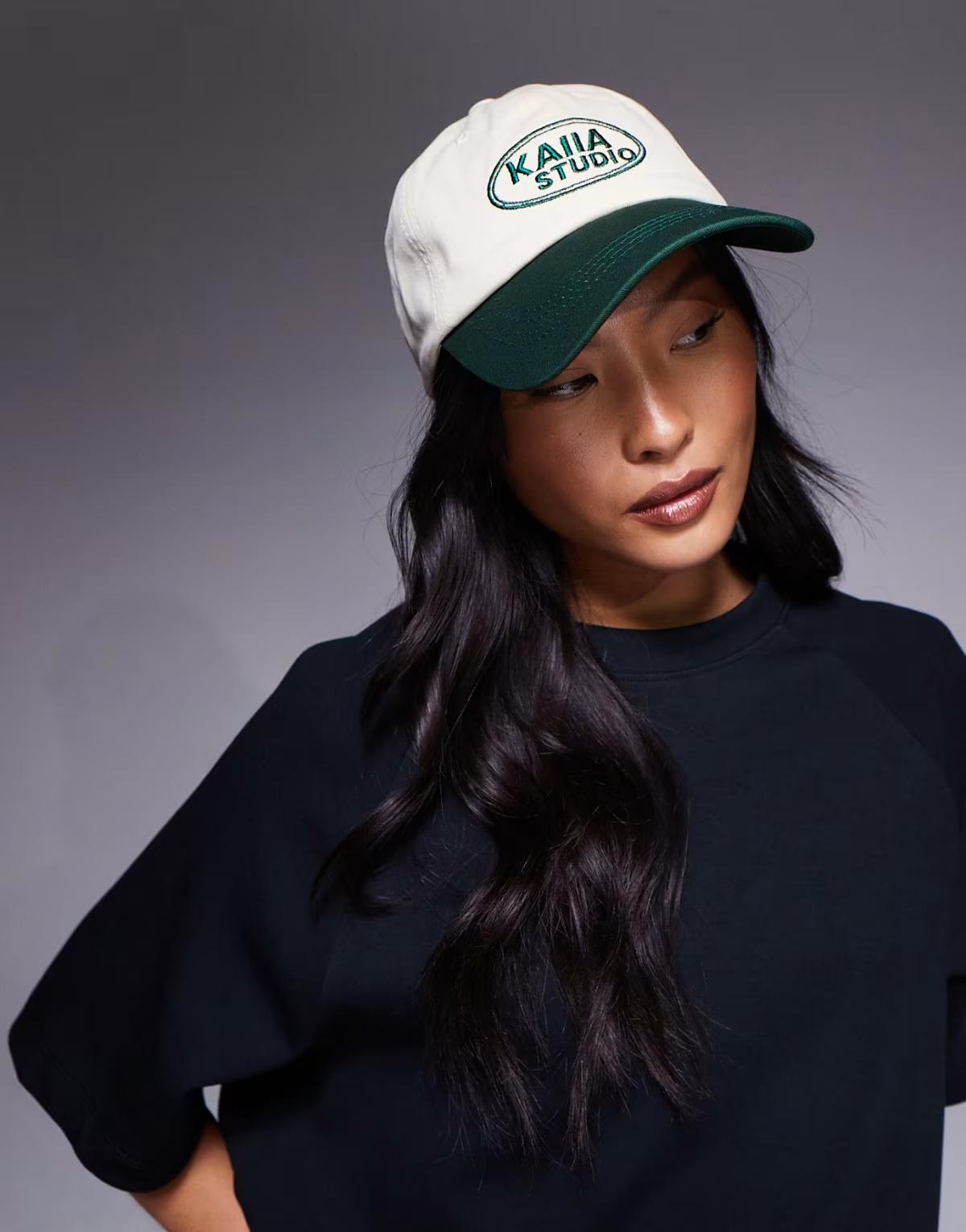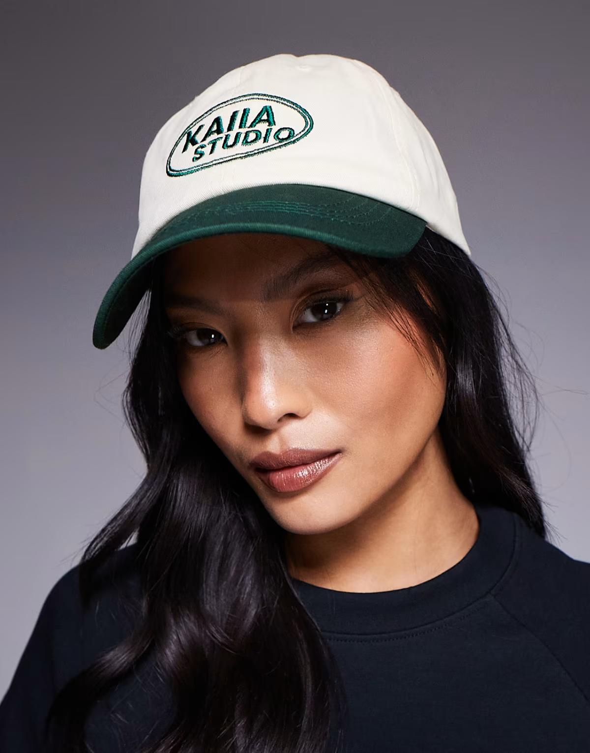 Kaiia Studio cotton embroidered logo cap in cream and green