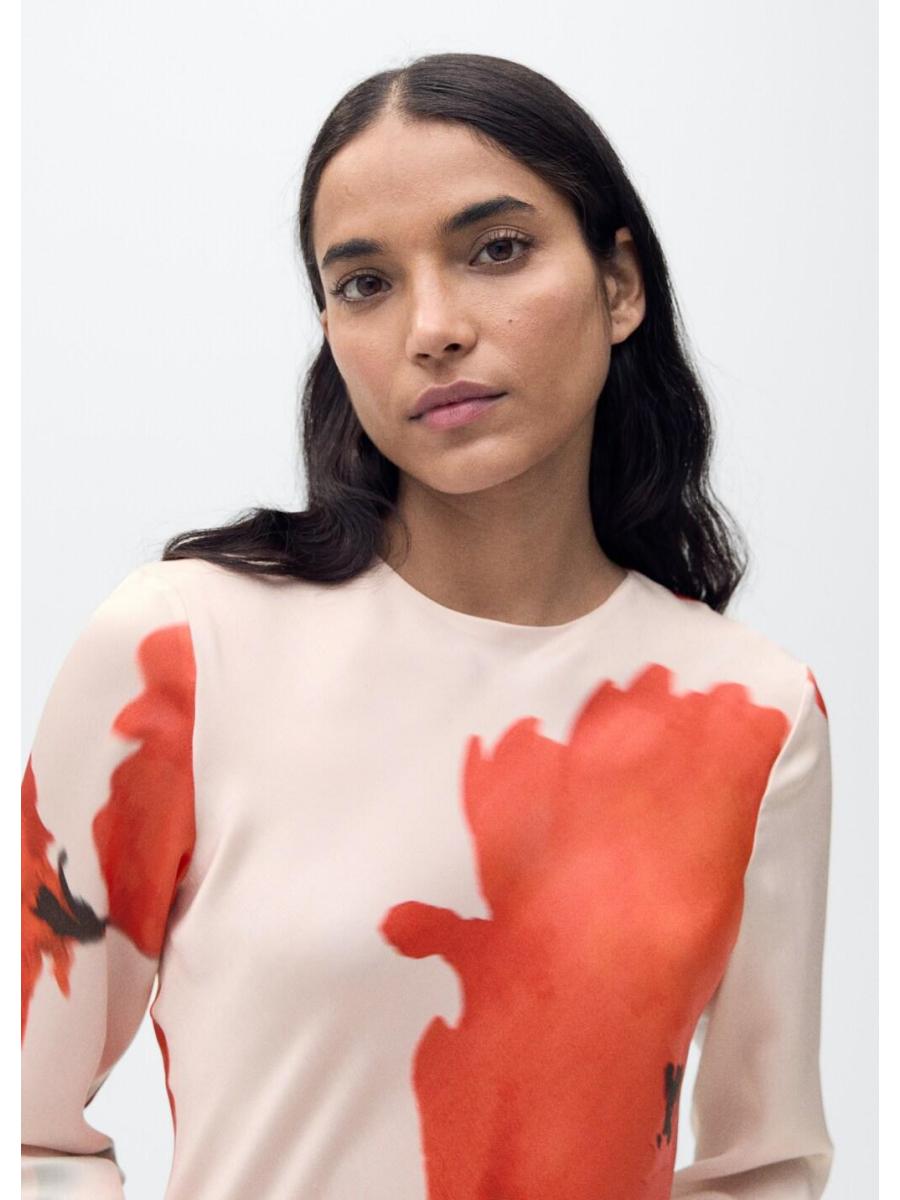 Tejido satinado. Tejido fluido. Diseño evasé. Estampado floral. Cuello redondo. Manga larga acampanada. Abertura posterior en el cuello. Cierre de botón en la parte posterior. Colección fiesta, ceremonia y comunión. Ramadan Collection. Esta prenda pertenece a nuestra colección de evento, diseñada para convertirte en la invitada perfecta en cualquier fiesta, boda o ceremonia
