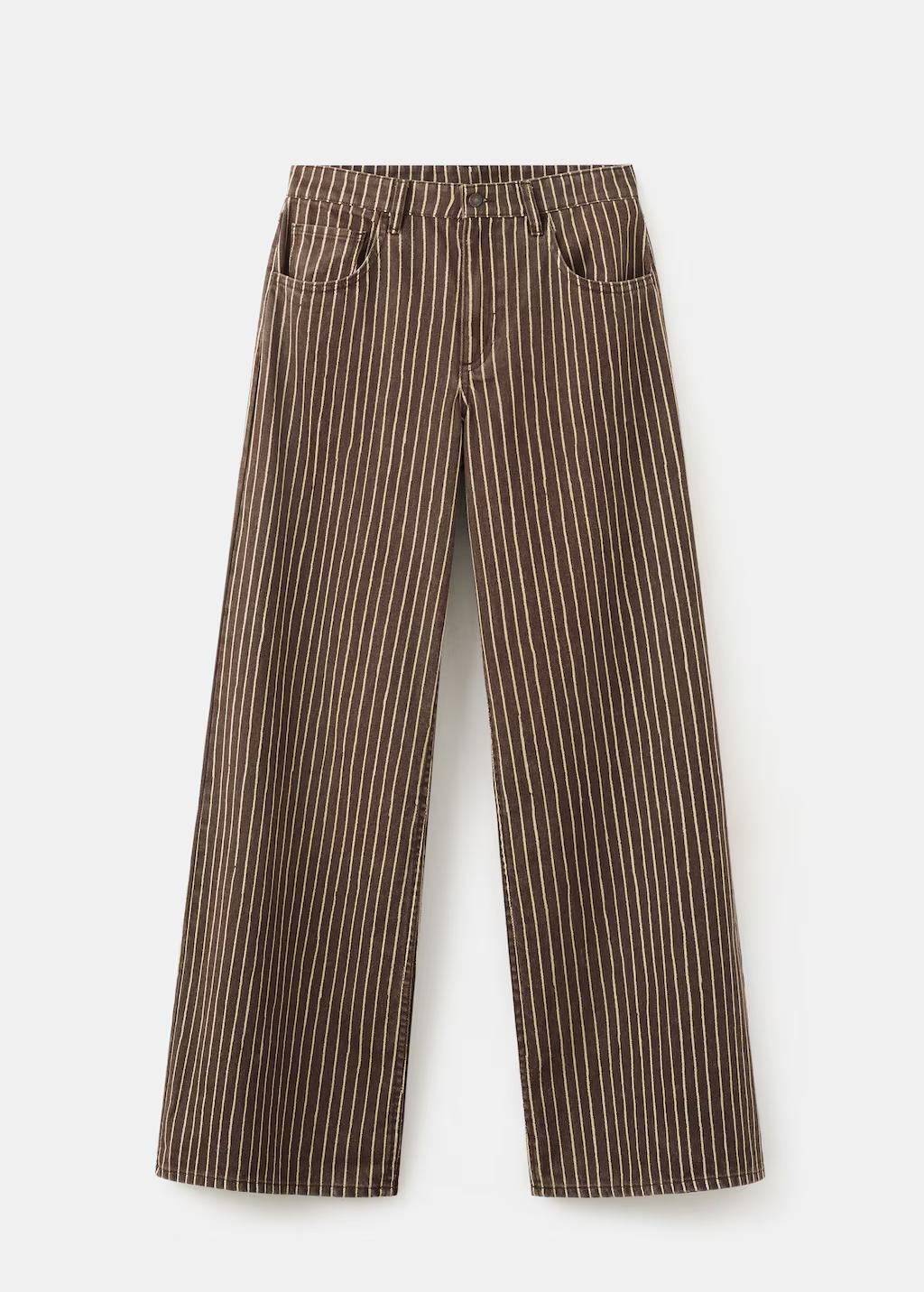 Tejido de algodón estilo tejano vaquero. Diseño wide leg. Estampado Rayas. Tiro medio. Trabillas. Cinco bolsillos. Cierre de botón y cremallera