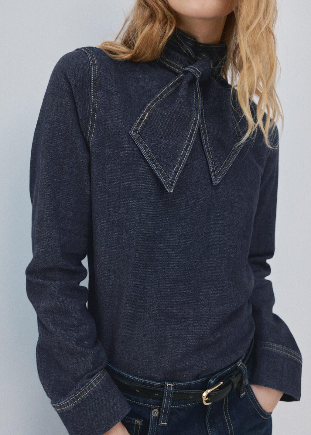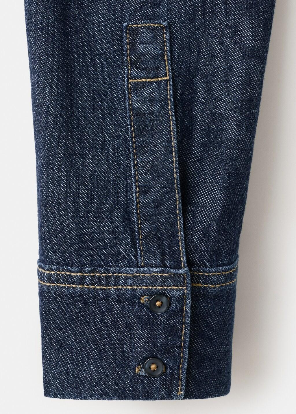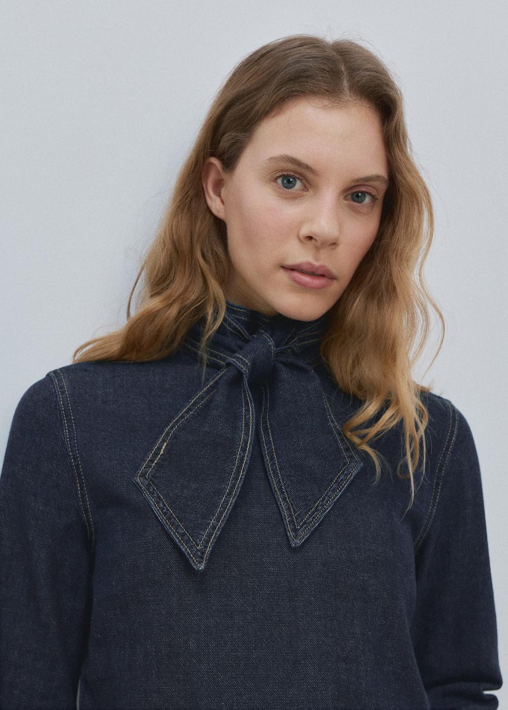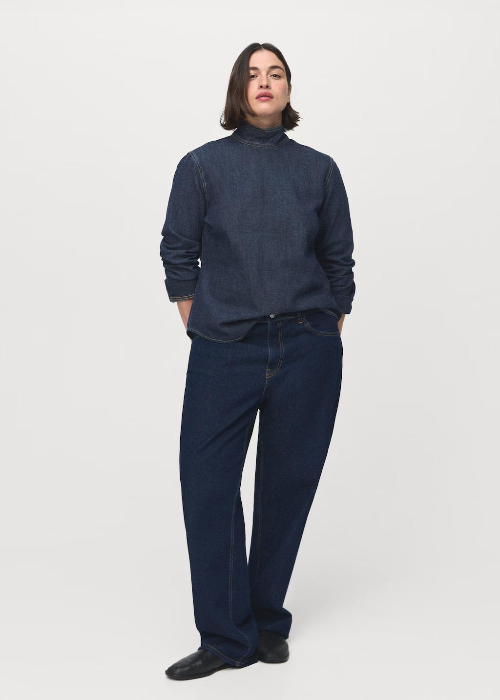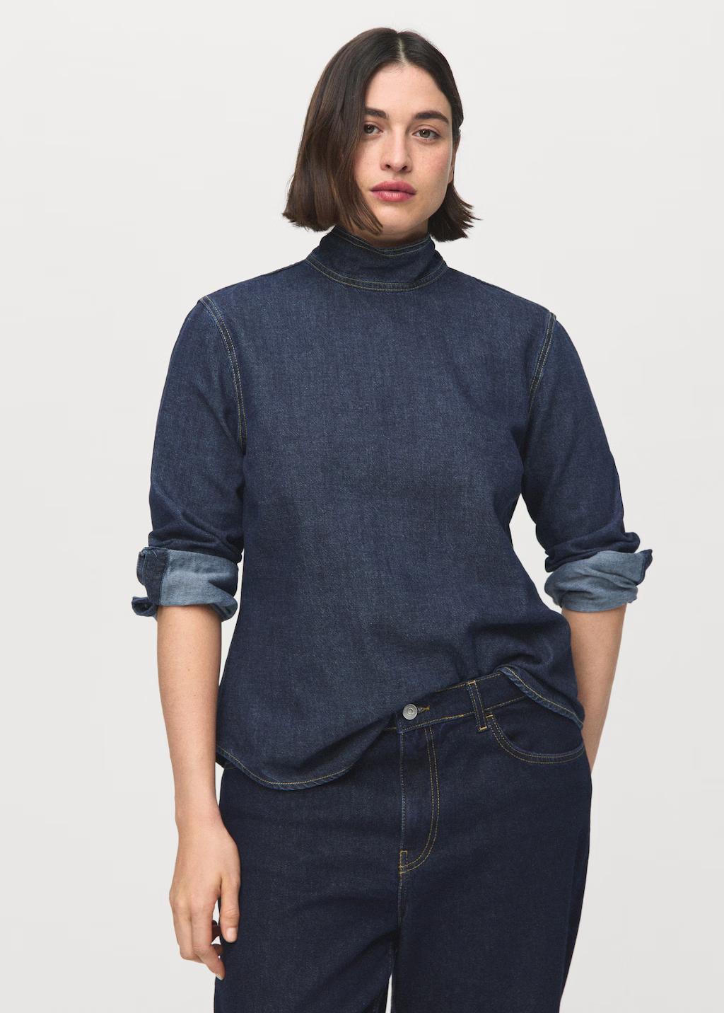 Tejido de algodón estilo tejano vaquero. Diseño recto. Cuello alto. Cierre de lazo en cuello y espalda. Costuras decorativas en contraste. Manga larga con puños abotonados. Disponible Plus