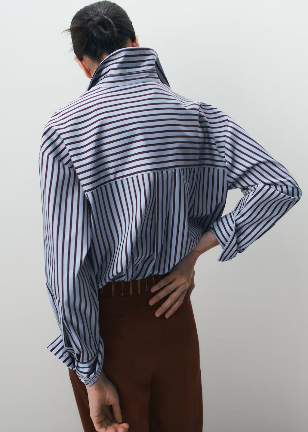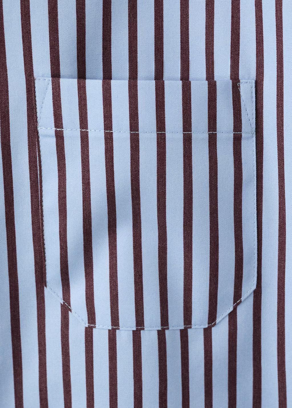 Tejido mezcla de algodón. Diseño recto. Estampado Rayas. Cuello camisero. Manga larga abotonada con puños a contraste. Bolsillo de parche en el pecho. Cierre delantero con botones