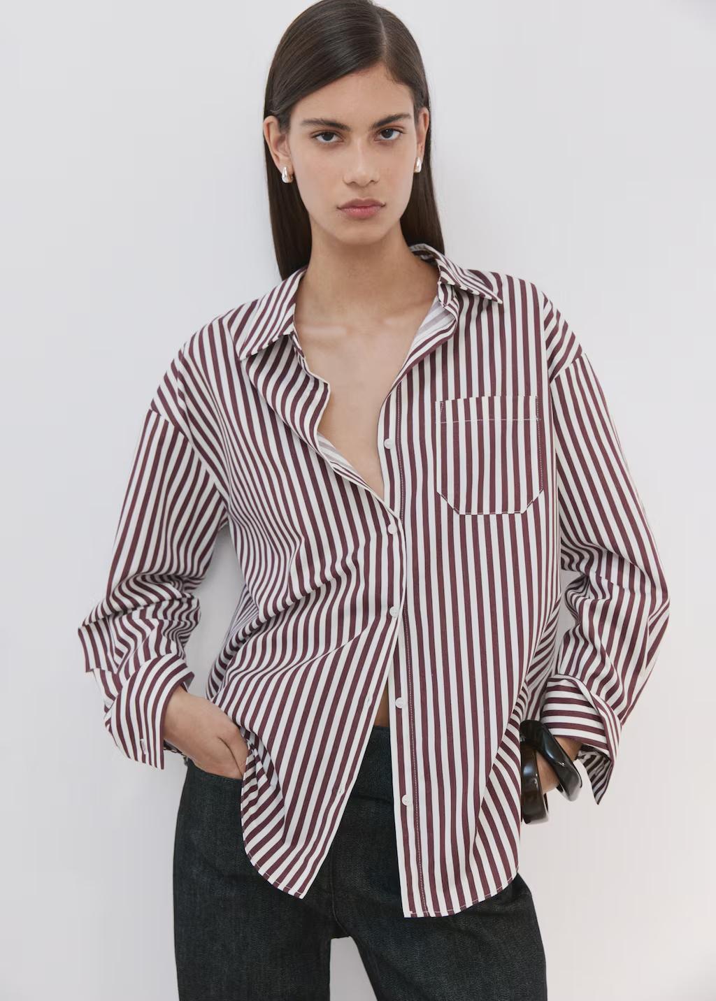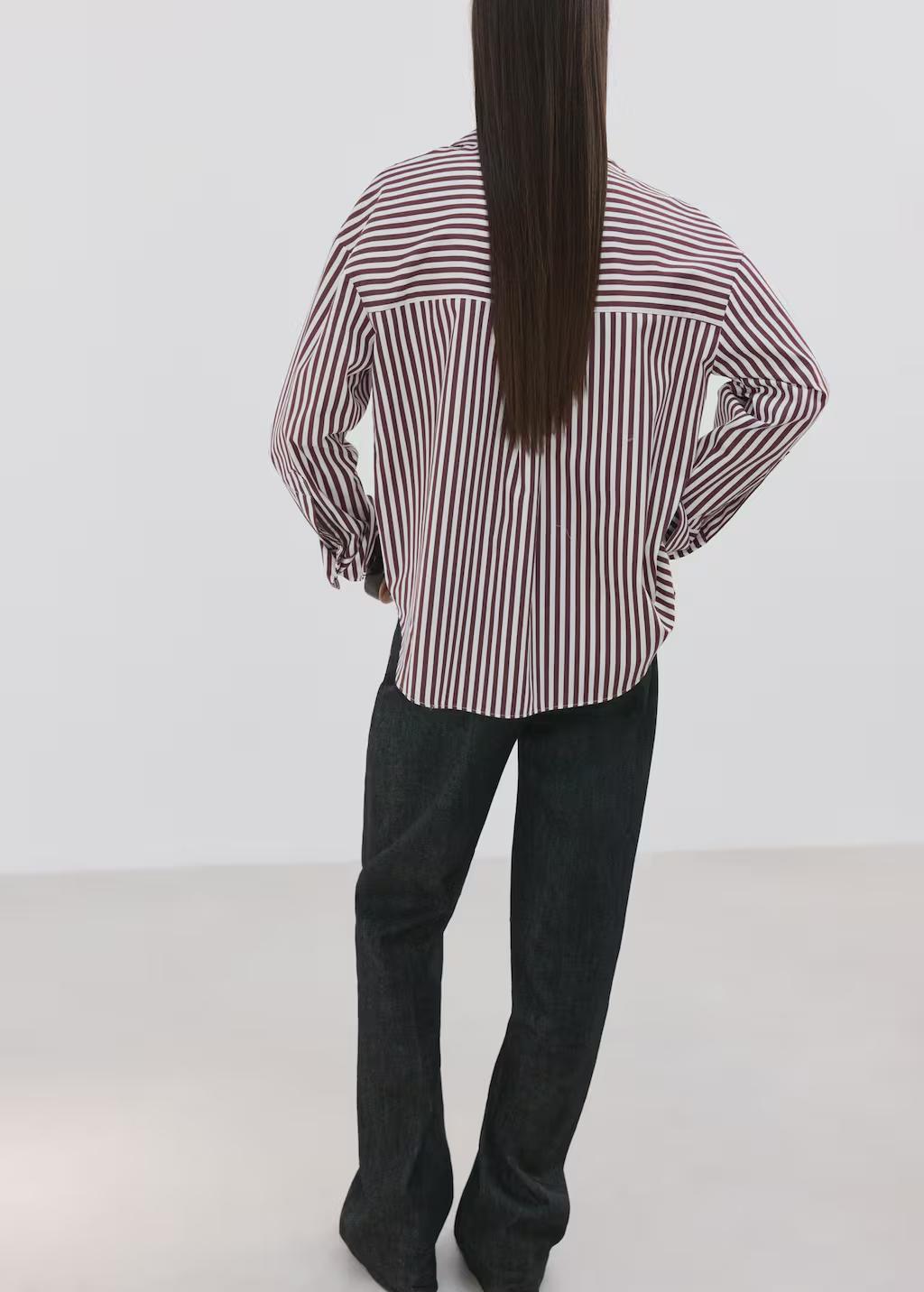 Tejido mezcla de algodón. Diseño recto. Estampado Rayas. Cuello camisero. Manga larga abotonada con puños a contraste. Bolsillo de parche en el pecho. Cierre delantero con botones