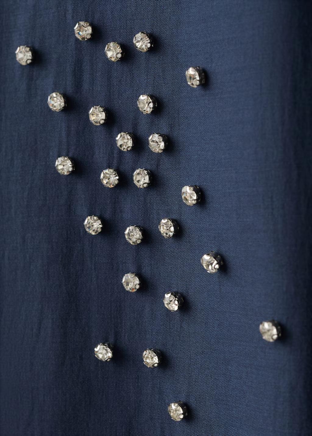 Tejido de lyocell. Detalle de strass. Cuello camisero. Manga larga con puños abotonados. Cierre delantero de botones oculto con tapeta