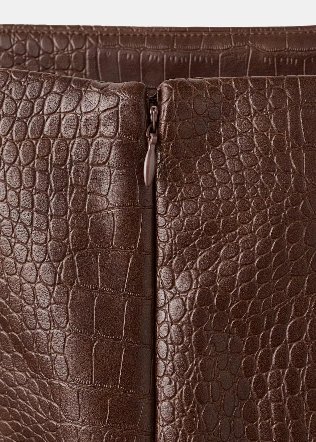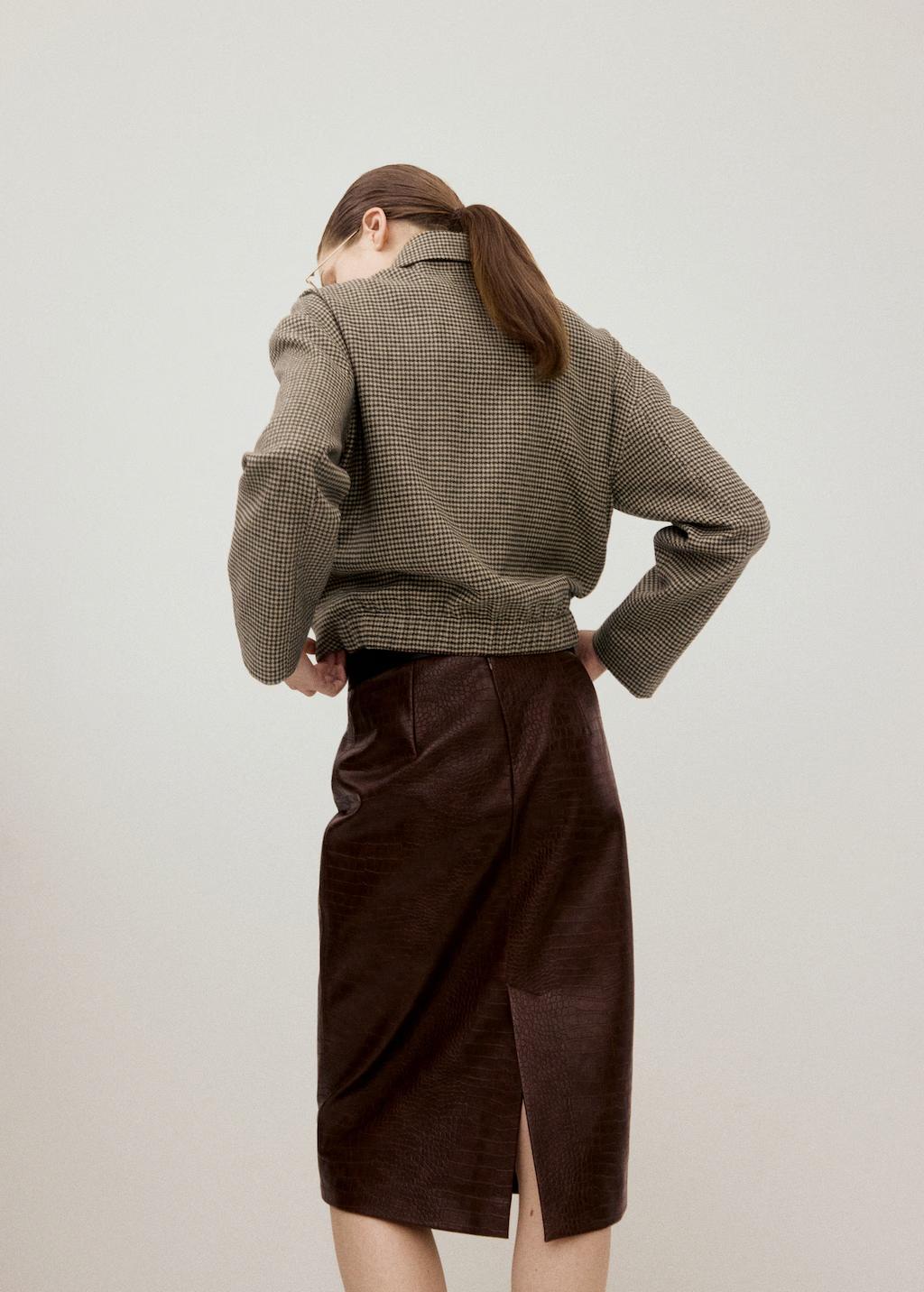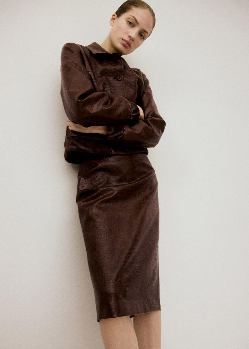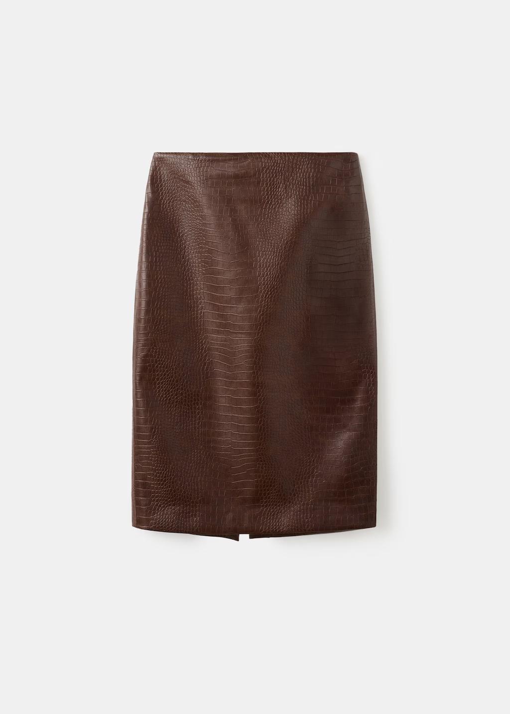 Efecto piel de cocodrilo. Diseño midi. Diseño recto. Tiro medio. Abertura posterior en el bajo. Cierre de cremallera lateral. Total look. Exclusivo Online