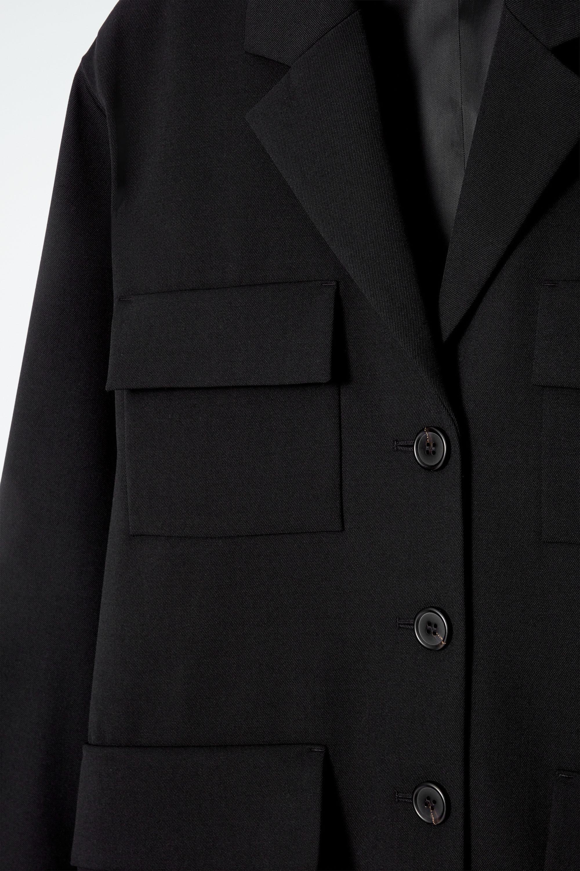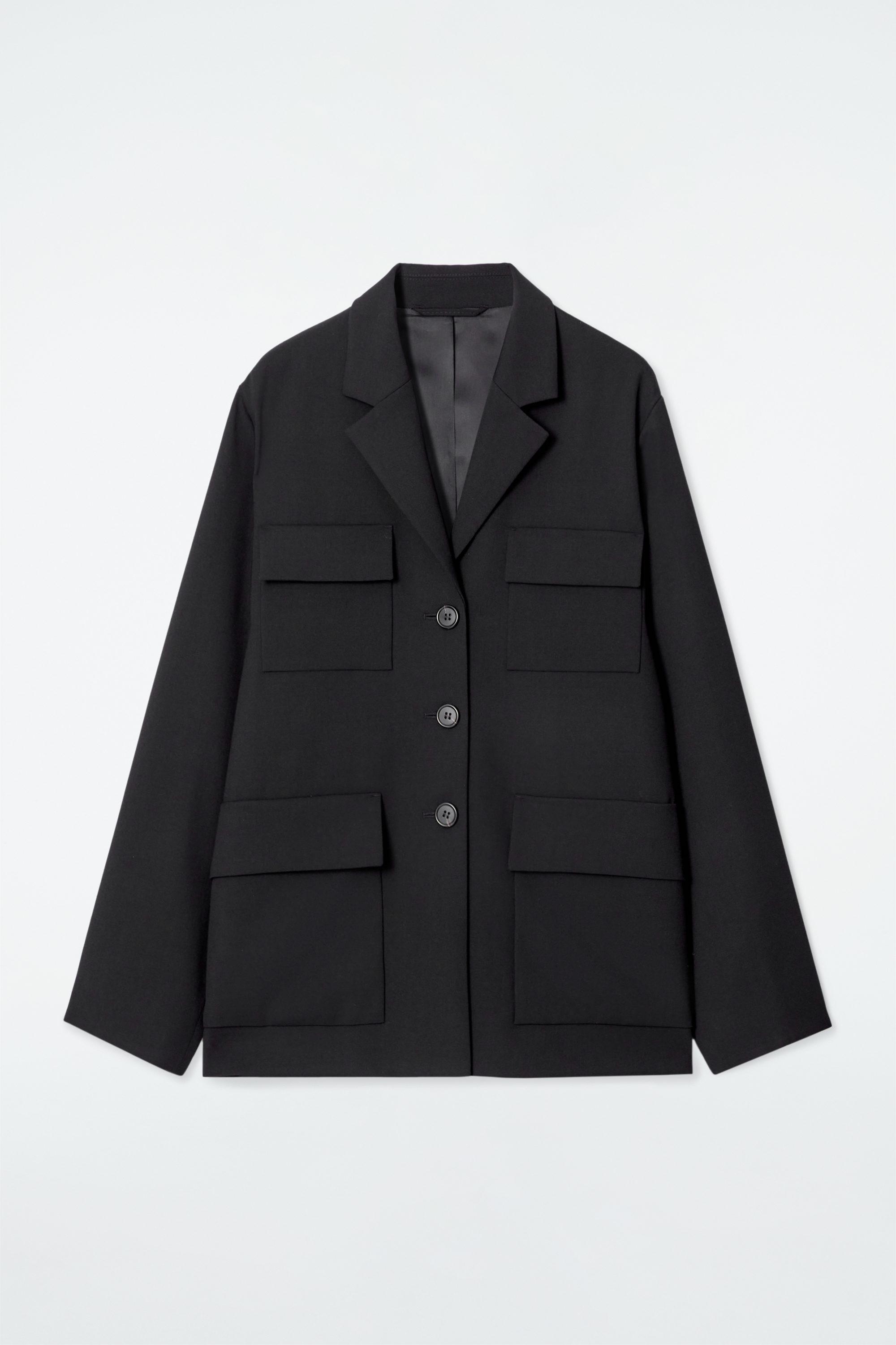 This season, the womenswear team reimagine COS signatures with utility influences. This single-breasted blazer is made from an RWS wool blend and designed with a modern three-button close and four oversized flap pockets that nod to its workwear roots.\u0026nbsp;Relaxed fitButton closureRecycled polyester is polyester made from PET bottles or end-of-life textile waste. The PET bottles or textile waste is mechanically recycled and processed into new yarn\u0026nbsp;Shell: 49% Recycled polyester, 44% RWS Wool, 5% Polyester, 2% Elastane. Lining: 100% Viscose. Excluding trims / Machine wash\u0026nbsp;Back length of size EU 36 is 72.3cm / Model wears a size EU 36