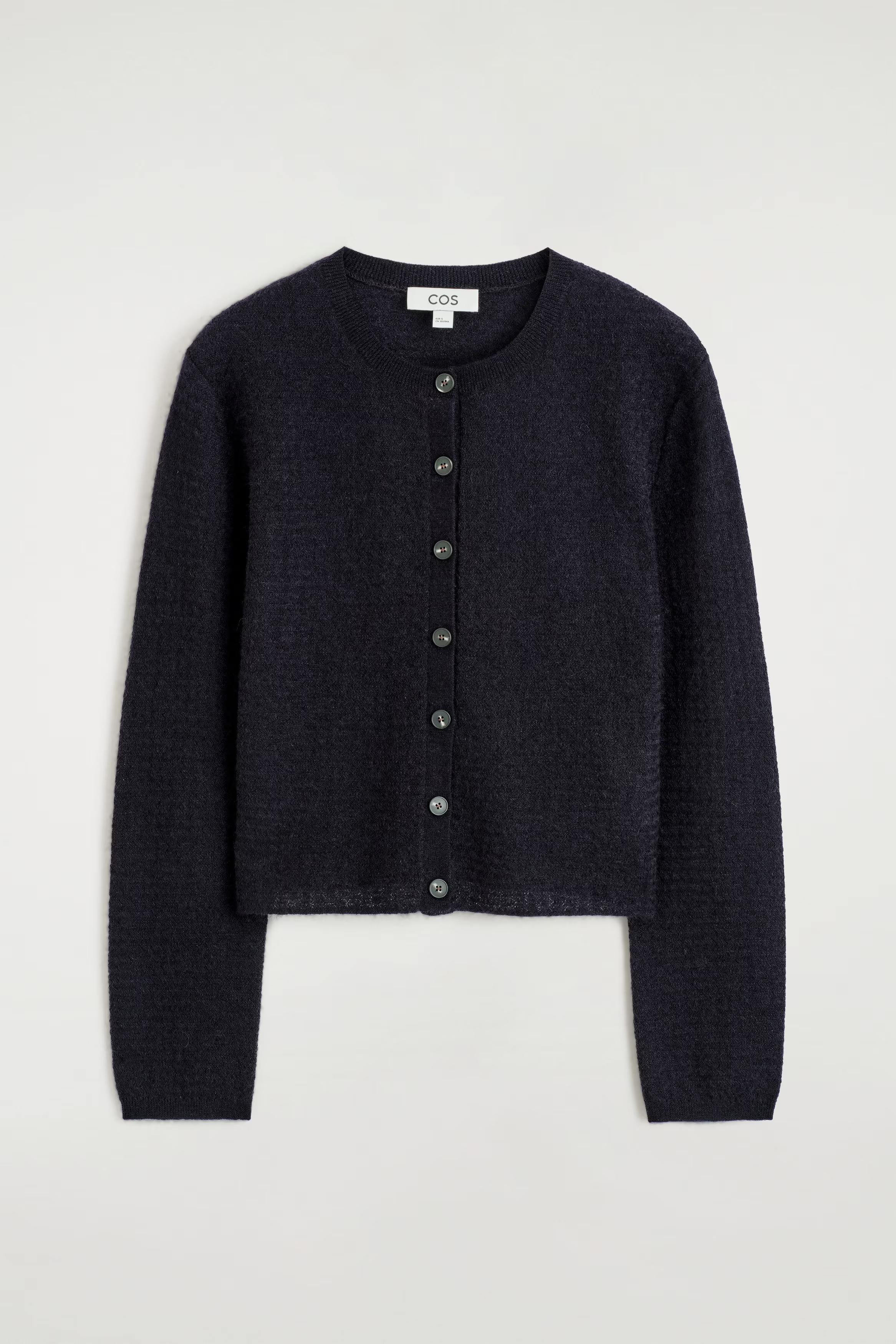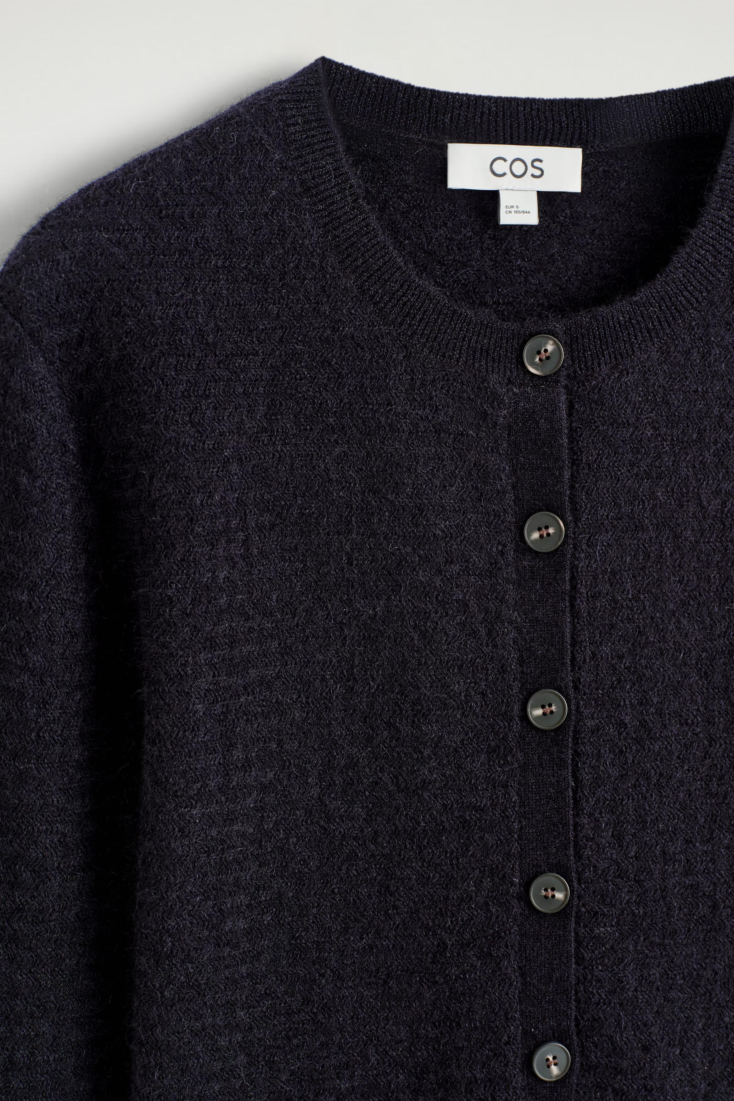 Elevated through unexpected details, this cardigan is made with tactile mohair and merino wool in a textured zigzag knit. It's designed with a rounded neckline, ribbed trims and slightly cropped hem.\u0026nbsp;\u0026nbsp;Regular fitButton closureMachine wash\u0026nbsp;Front length of size S is 50cm / Model wears a size S