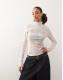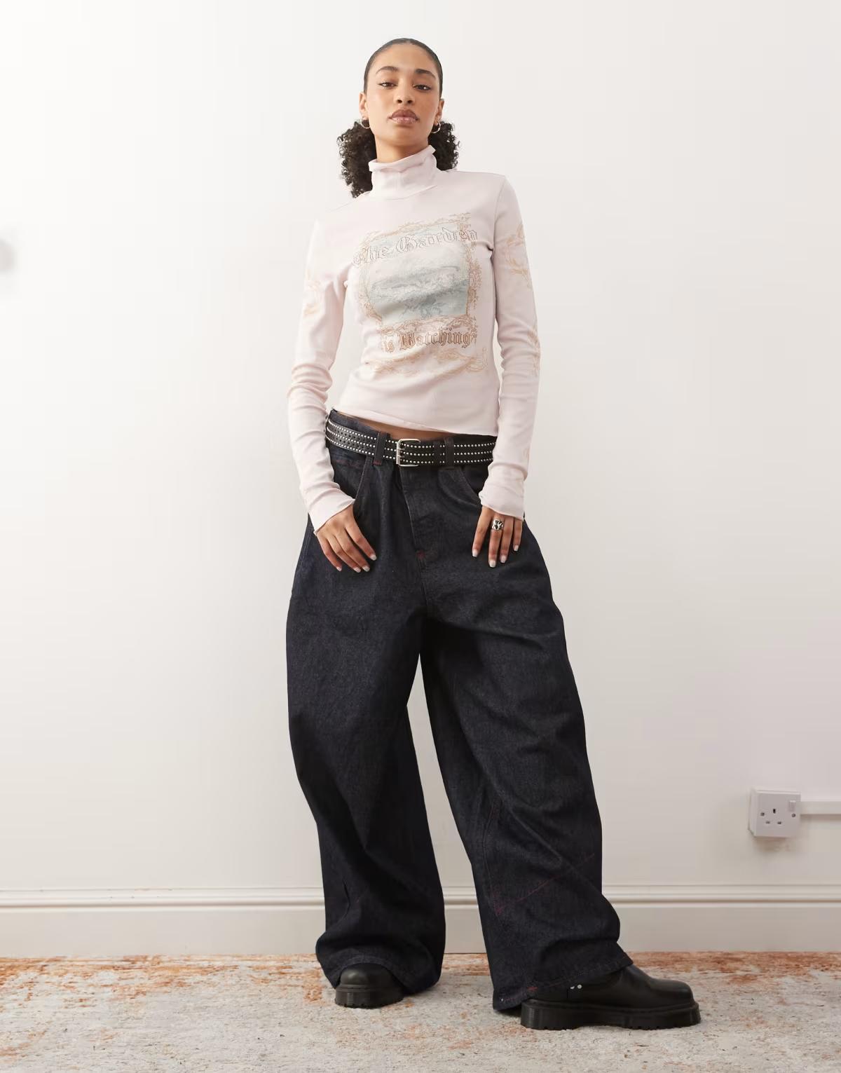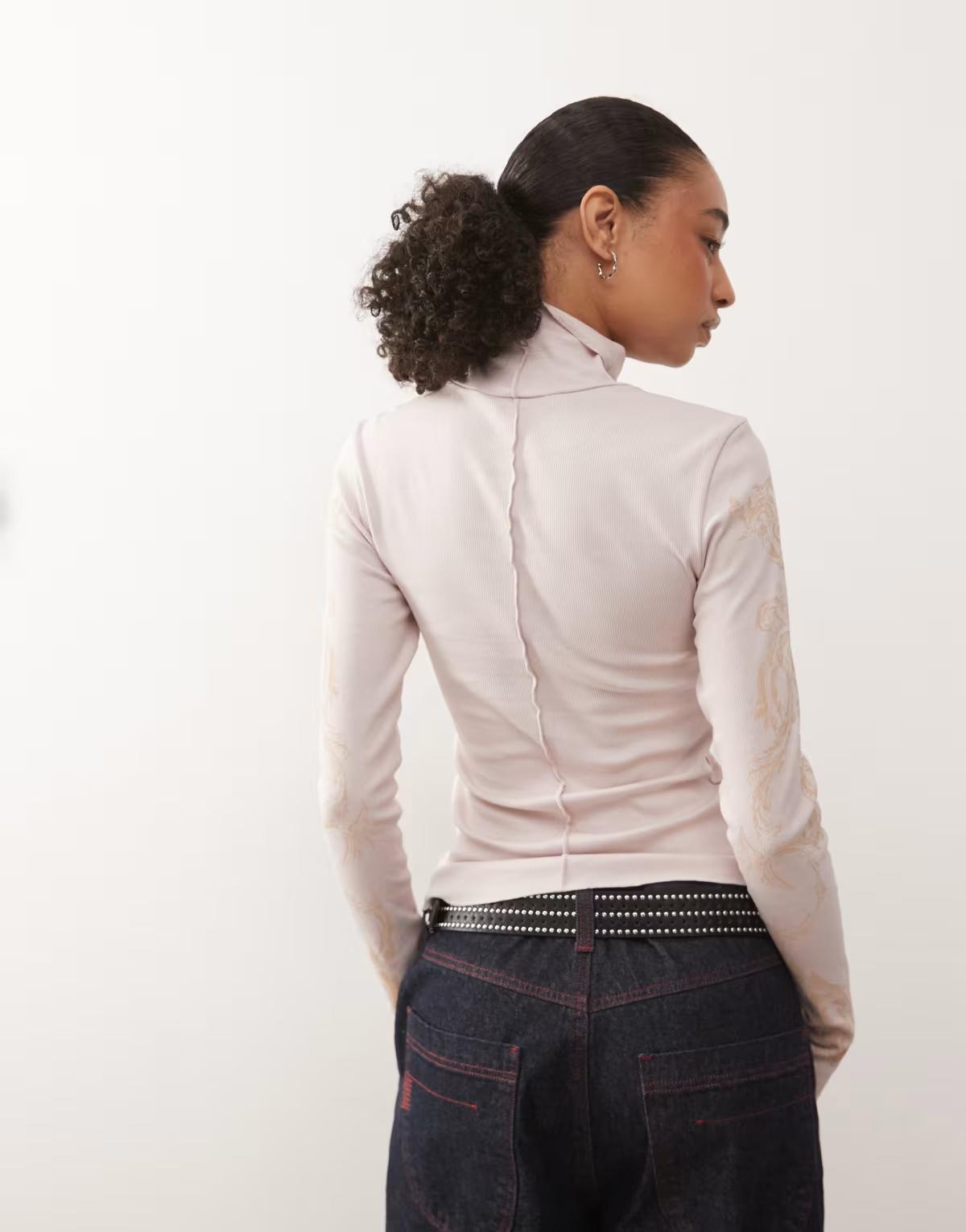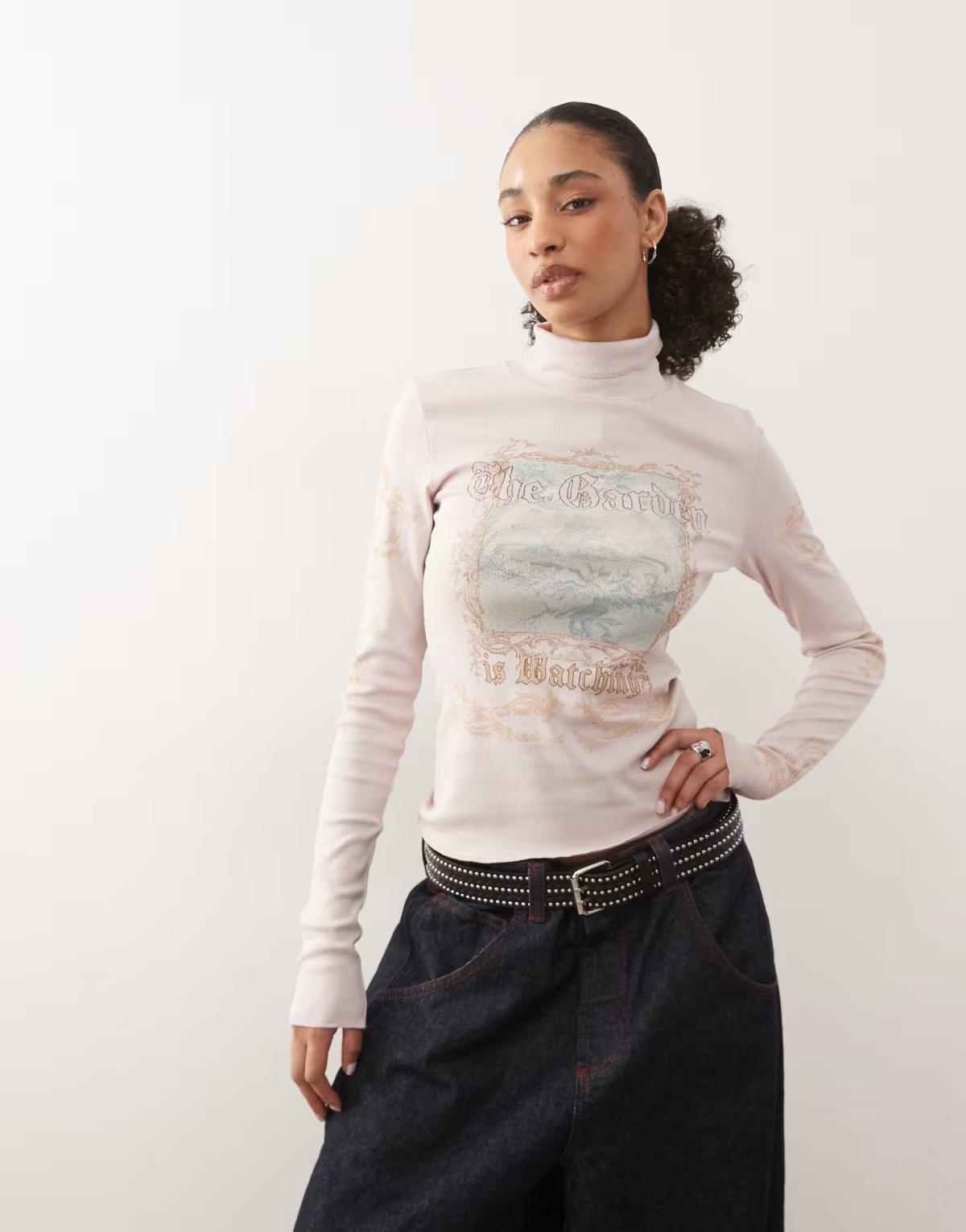 Monki graphic print turtleneck long sleeve top in pink