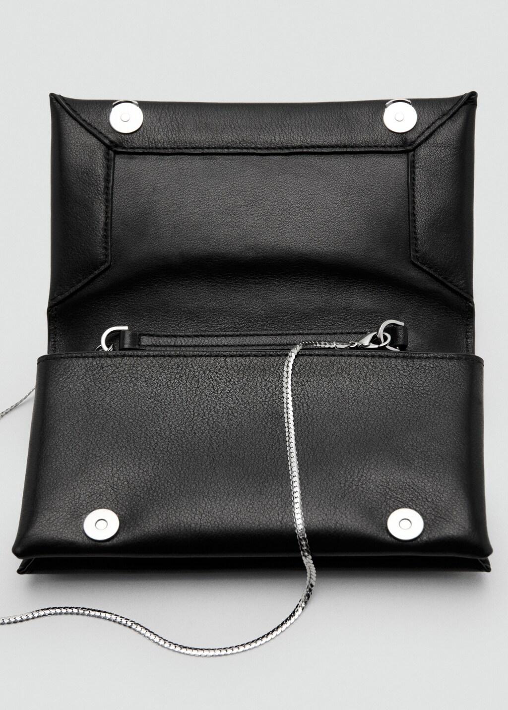 Este bolso de piel se distingue por su diseño minimalista y contemporáneo. Su silueta definida y líneas limpias reflejan una sofisticación atemporal, mientras que su tamaño compacto ofrece la combinación perfecta de funcionalidad y estilo. Tamaño pequeño. 100% piel bovino. Diseño rectangular. Dos compartimentos. Asa de cadena. Cierre de botones magnéticos. Exclusivo Online. Este accesorio pertenece a nuestra colección de fiesta y evento, diseñada para elevar tus looks en ocasiones especiales. Los artículos de la colección CAPSULE se pueden cambiar o devolver en un plazo de 14 días desde la fecha de envío. Capsule: una colección de prendas de edición limitada, hechas con los mejores tejidos y los máximos cuidados en el patronaje, para conseguir los mejores acabados. Esta colección, de carácter exclusivo, está pensada para los eventos y ocasiones más especiales. 19.0x11.0x5.0 cm (Largo x Alto x Ancho)